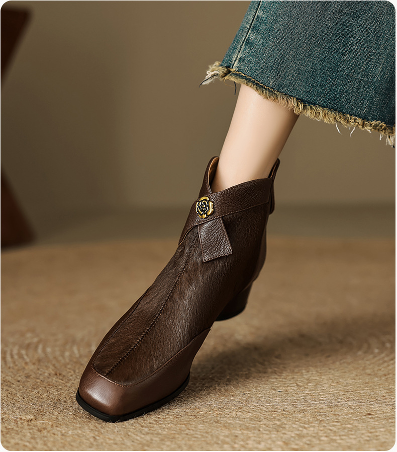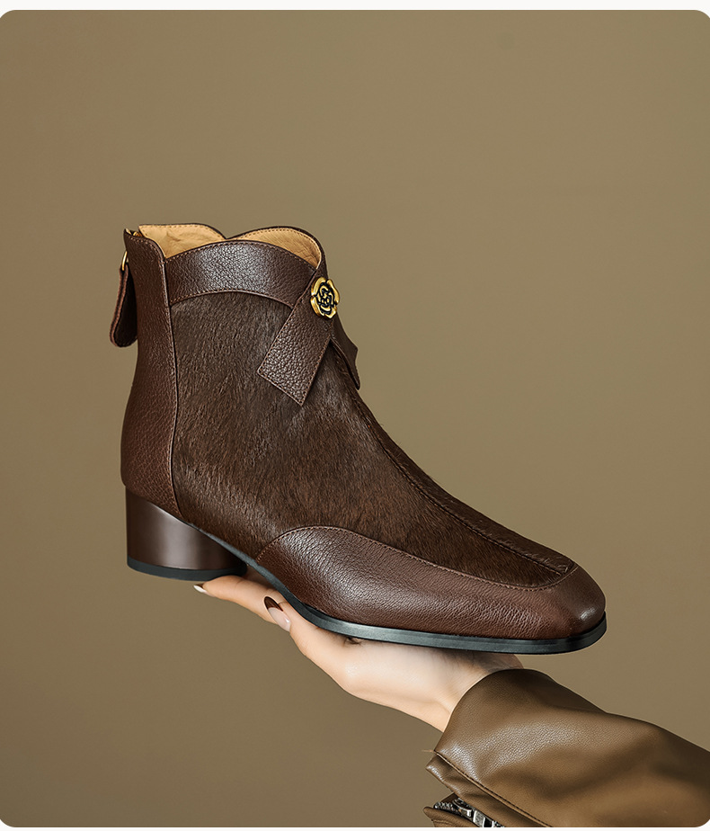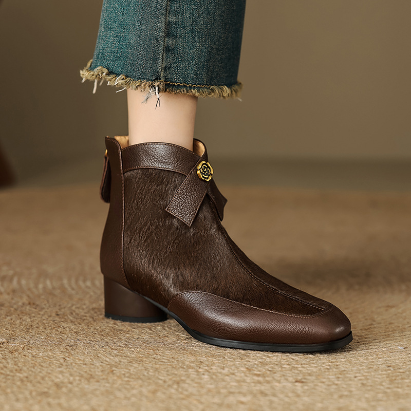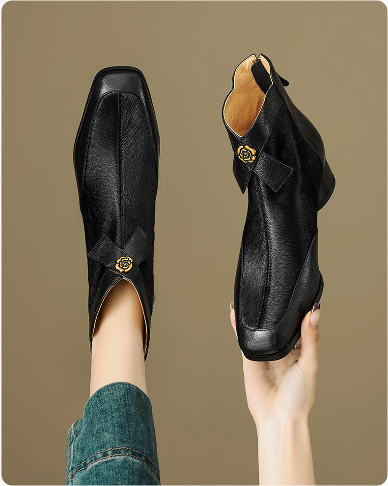 거대한 좋은 짧은 부츠 여성의 봄과 가을 싱글 부츠 2024 새로운 사각형 활 미드 힐 두꺼운 가죽 백 지퍼 기모