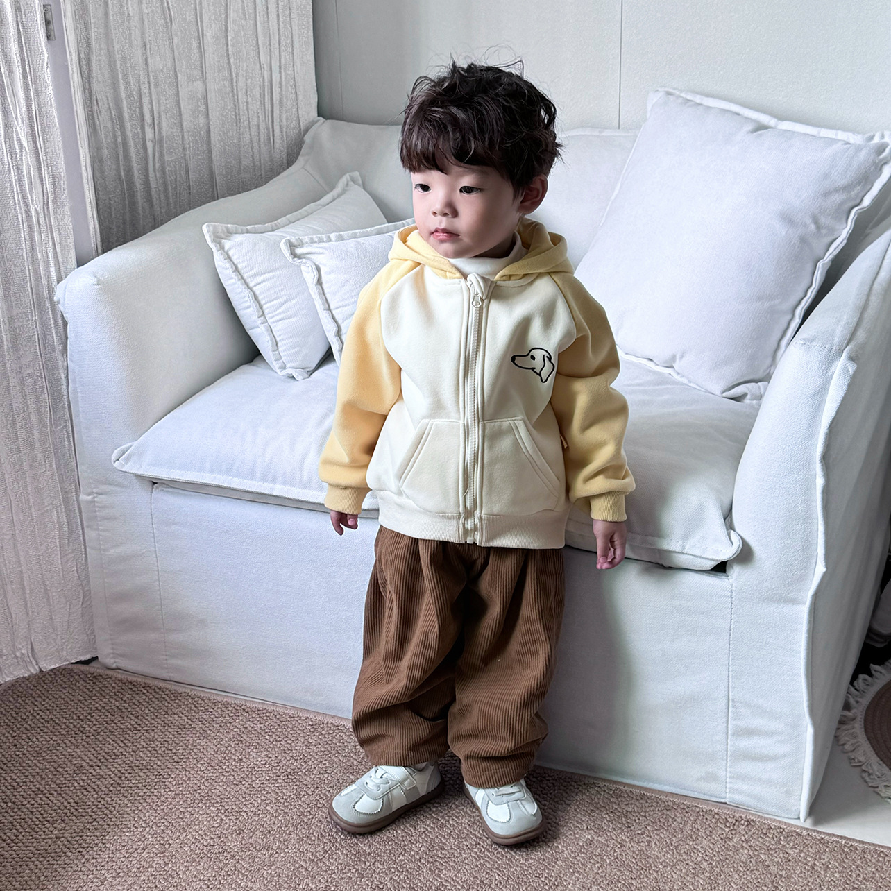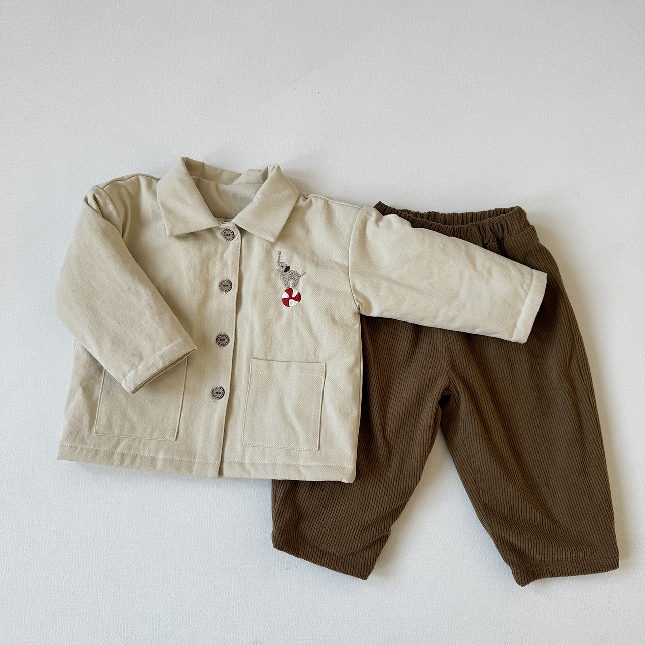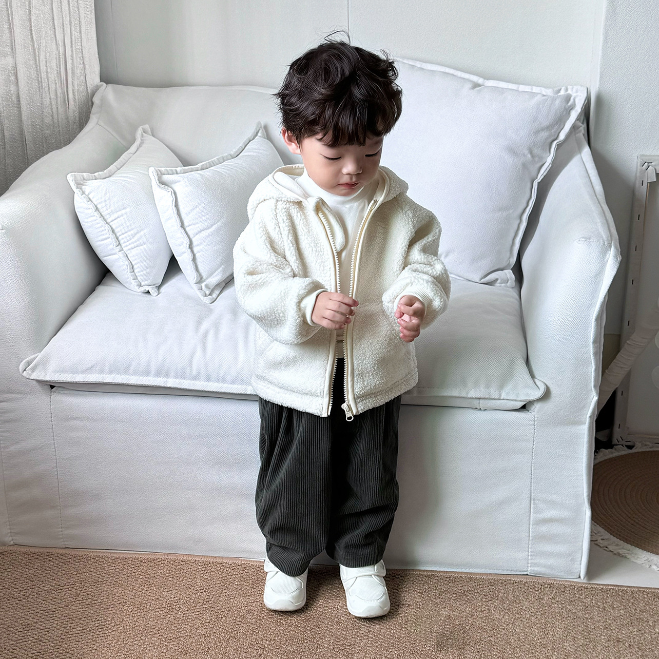 面布是灯芯绒的,很软很舒服,里布是摇粒绒的,做的是两层套绒,不是复合面料,更加的厚实保暖,两个颜色很好搭配,非常适合秋冬。