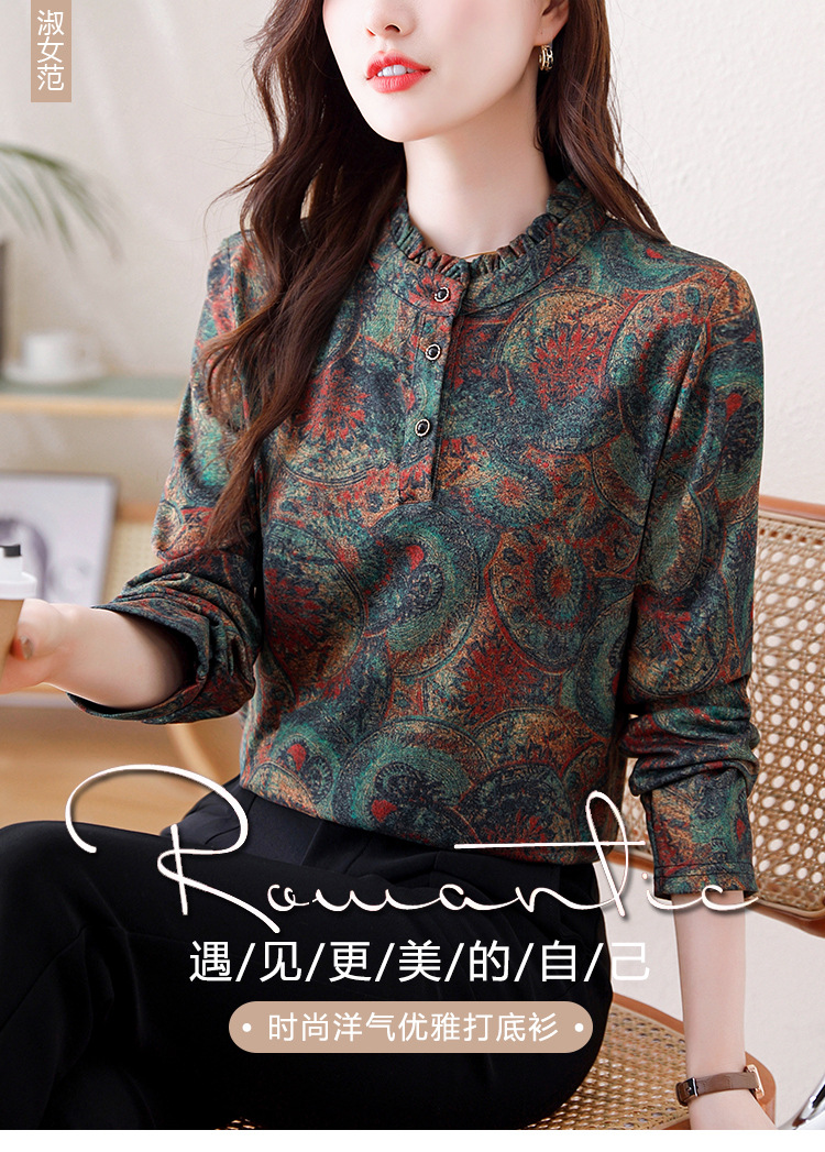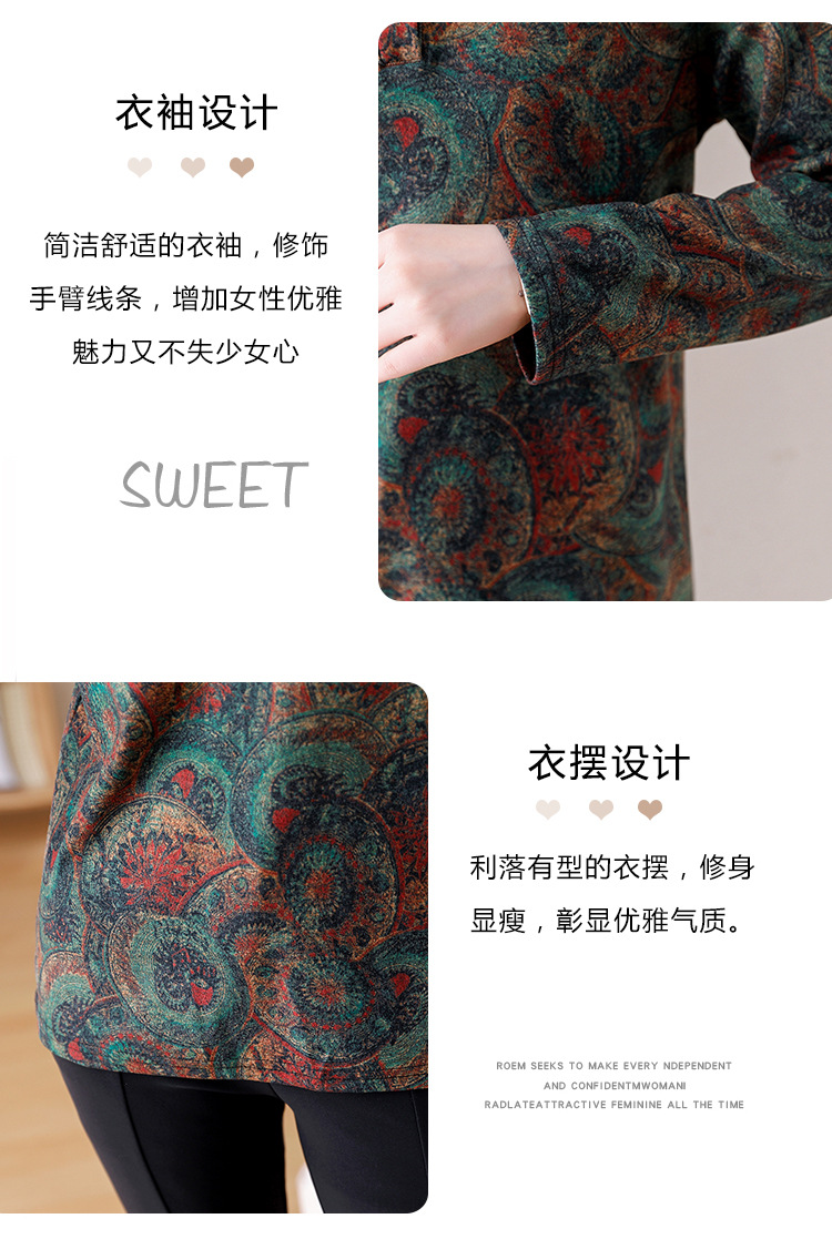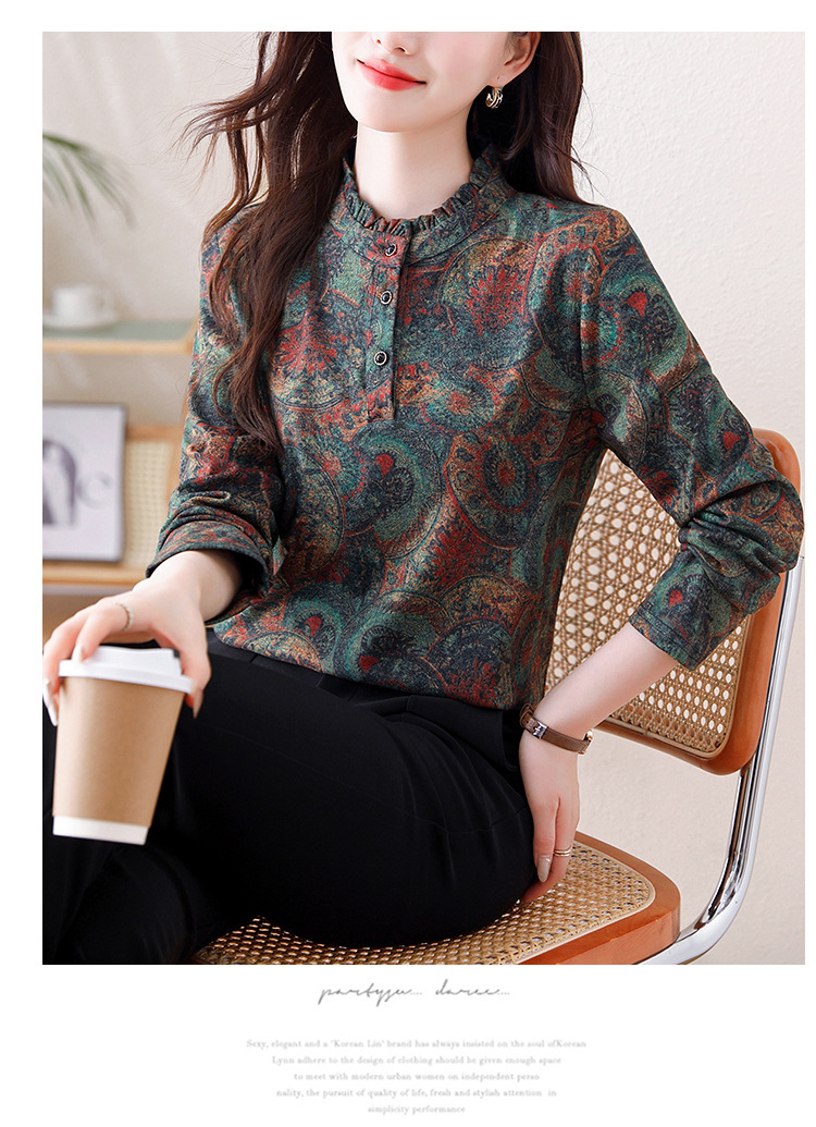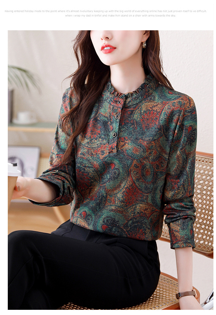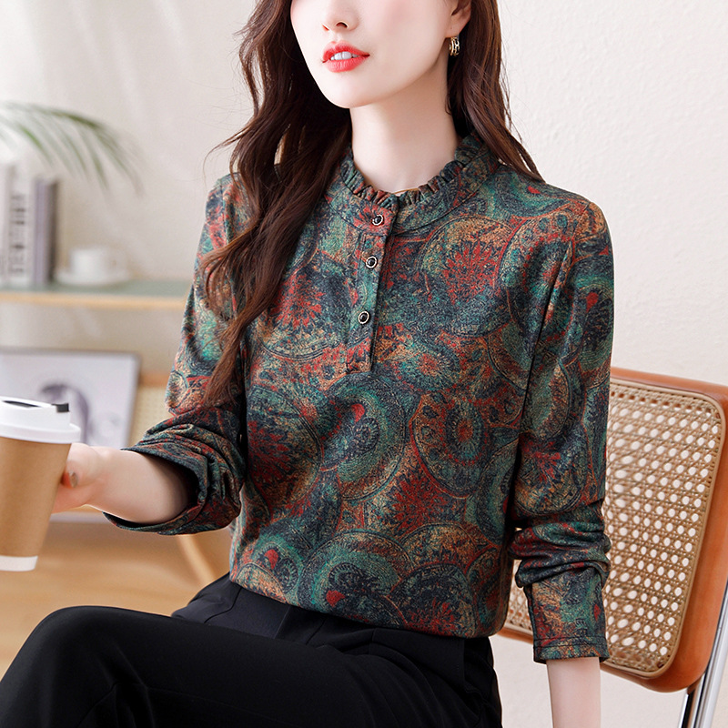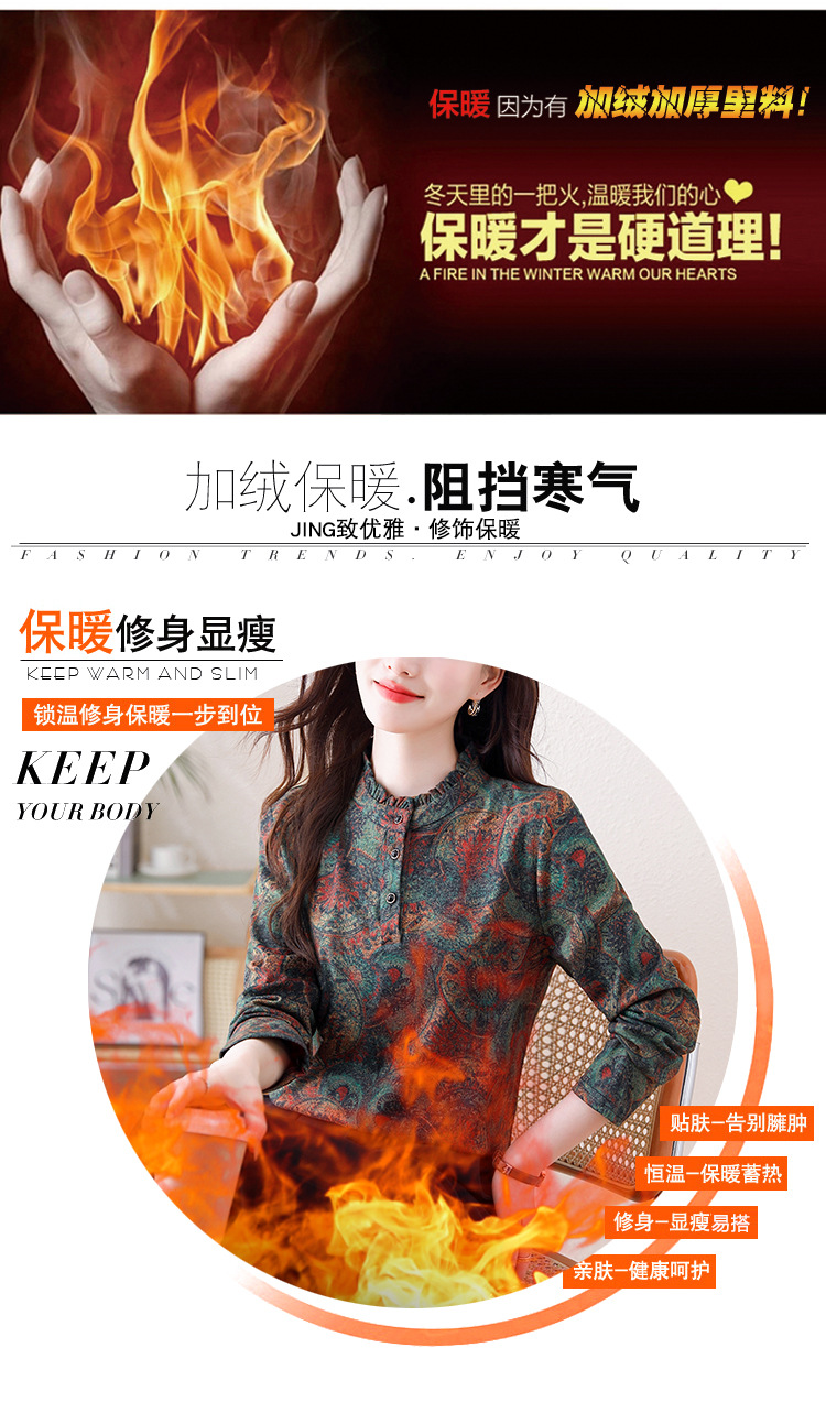 2024 년 가을과 겨울 새로운 긴팔 인쇄 모든 경기 어머니의 나이 감소 칼라 아오 벨벳 따뜻한 백킹 셔츠 여성용 탑