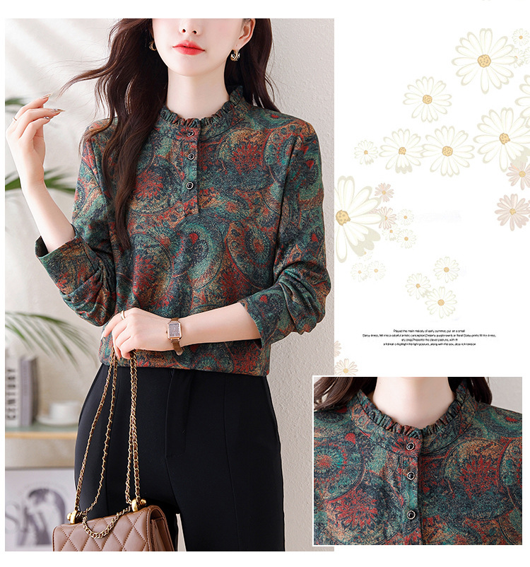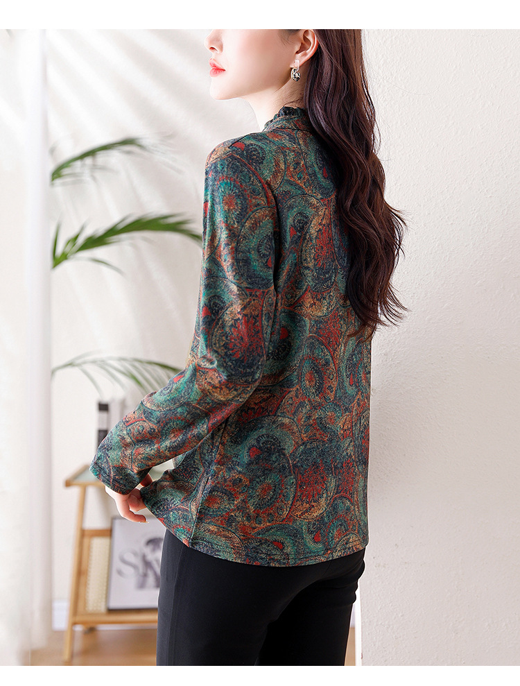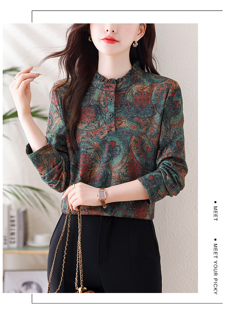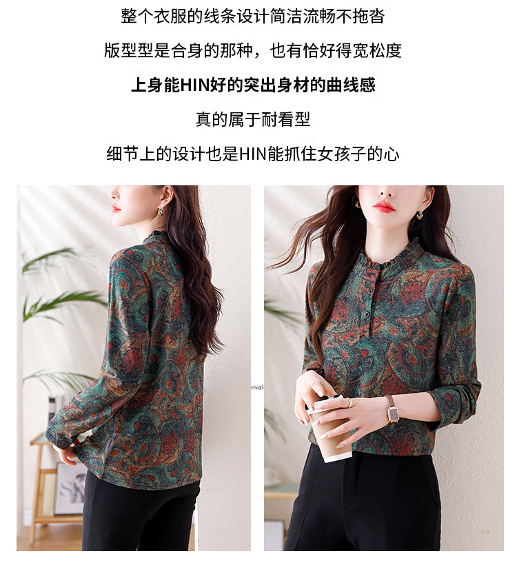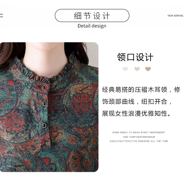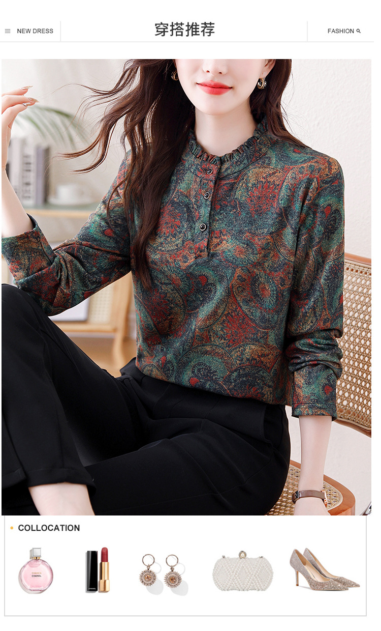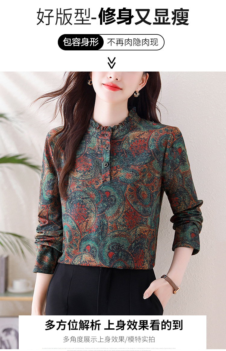 2024 년 가을과 겨울 새로운 긴팔 인쇄 모든 경기 어머니의 나이 감소 칼라 아오 벨벳 따뜻한 백킹 셔츠 여성용 탑