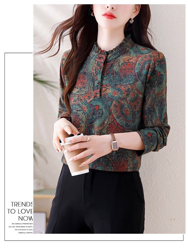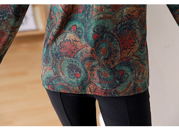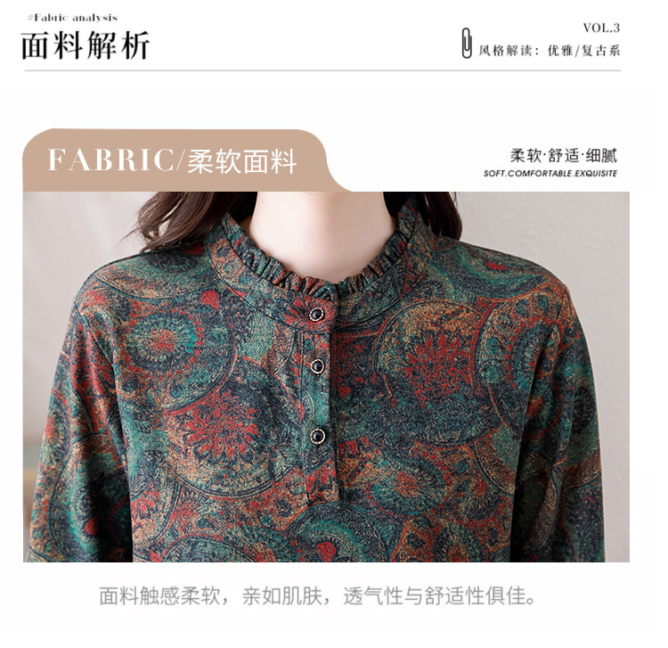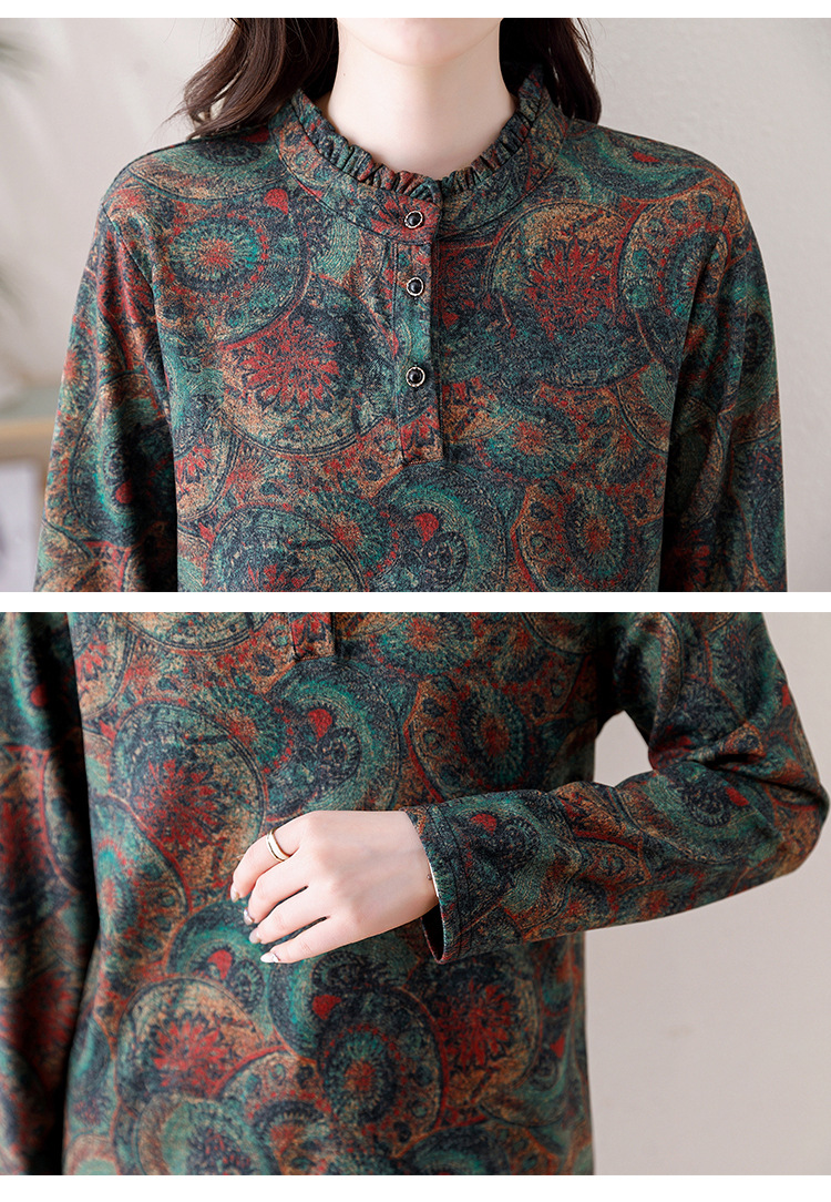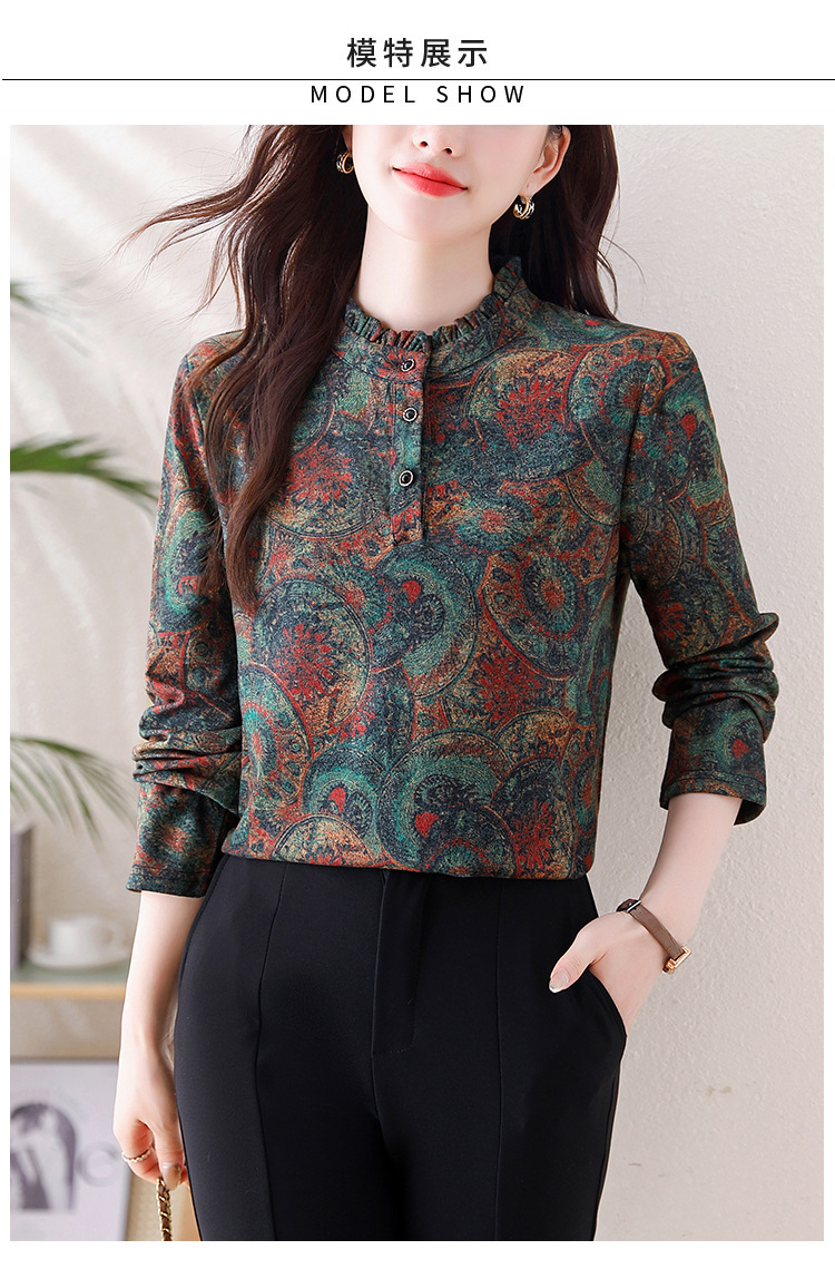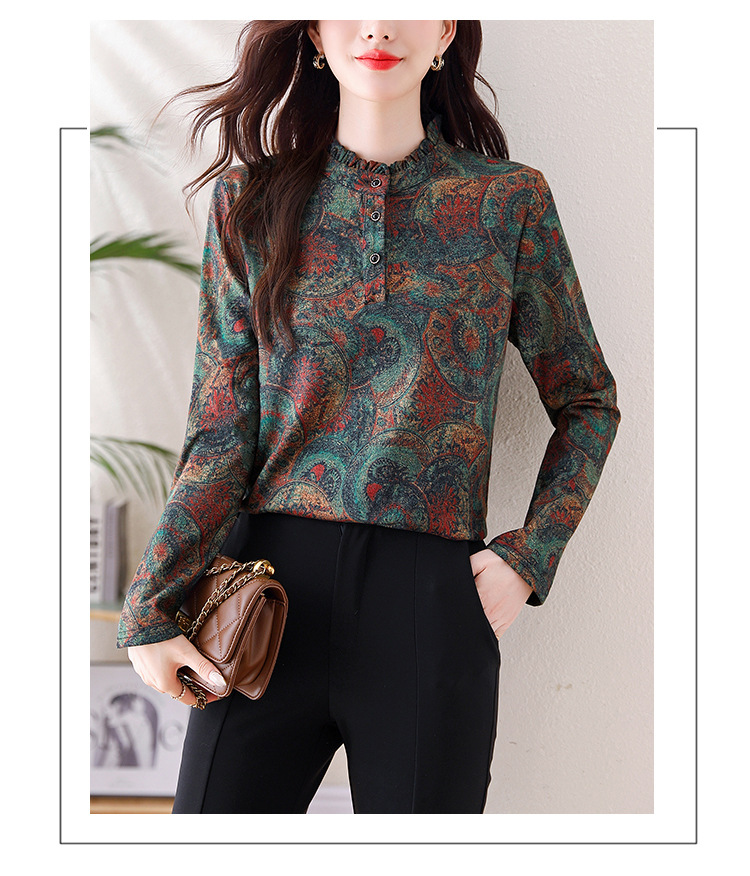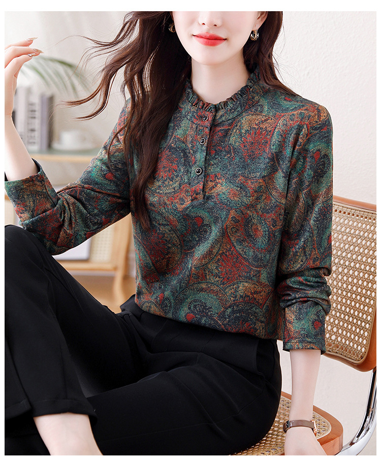 2024 년 가을과 겨울 새로운 긴팔 인쇄 모든 경기 어머니의 나이 감소 칼라 아오 벨벳 따뜻한 백킹 셔츠 여성용 탑
