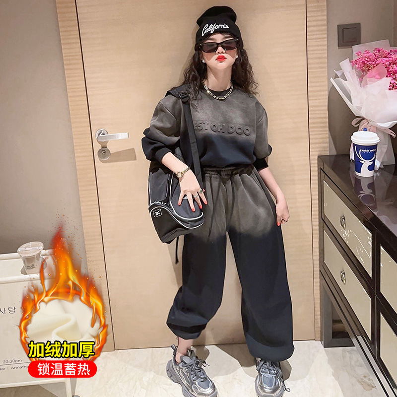 어린이 땀 여자 스포츠 세트 2 조각 유행 옷 가을과 겨울 소년의 넓은 다리 바지 2024 년 재즈 댄스 새로운 스타일스토어 가기