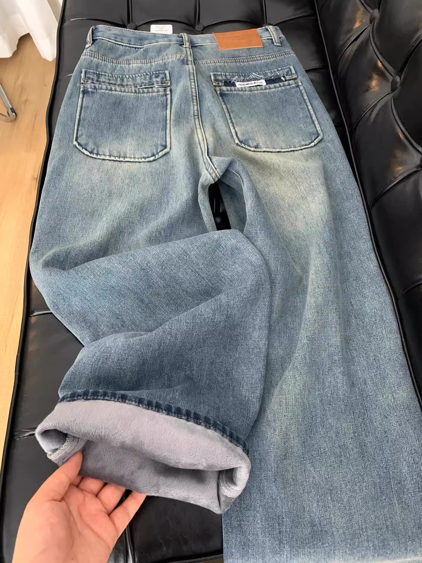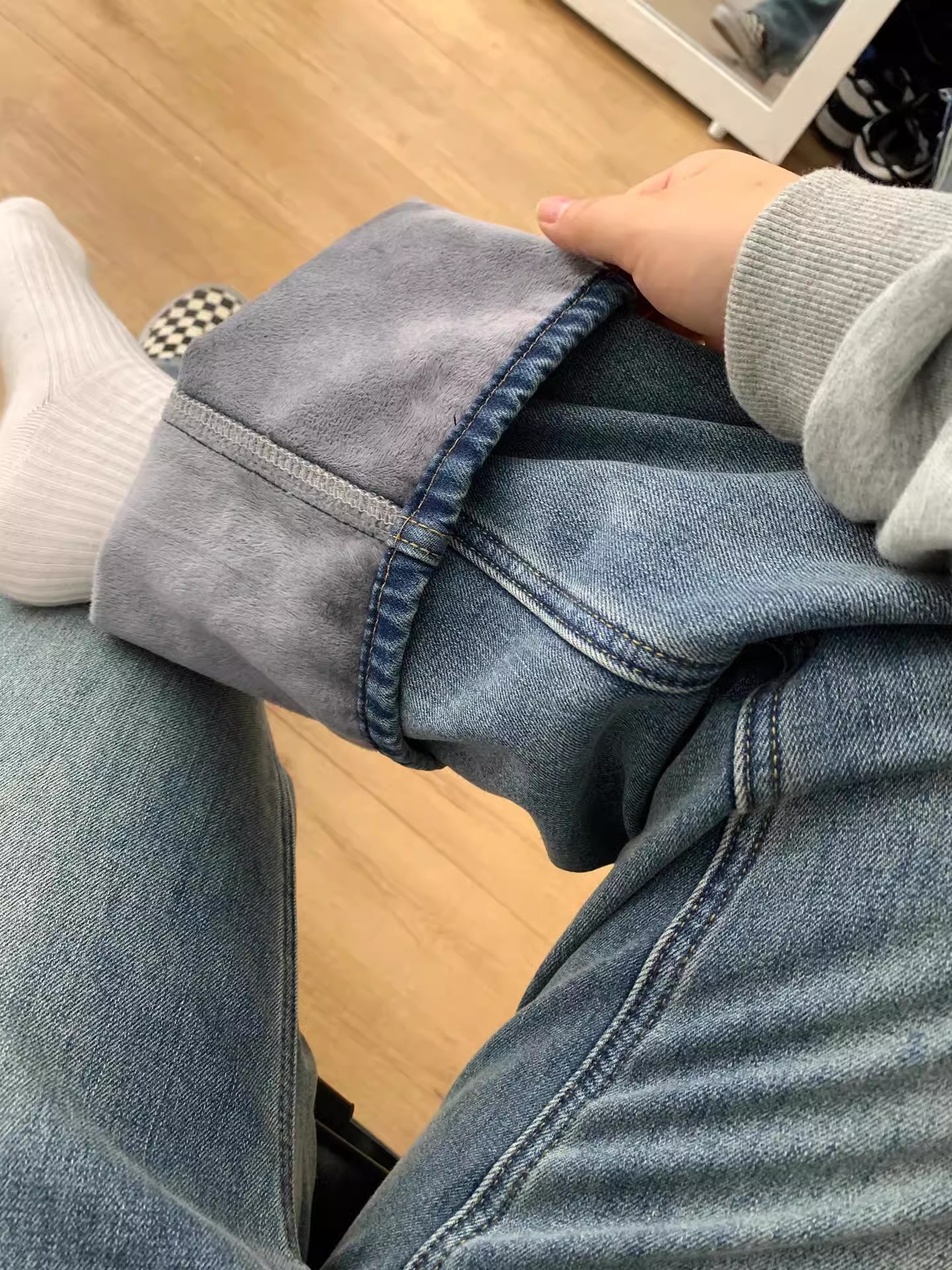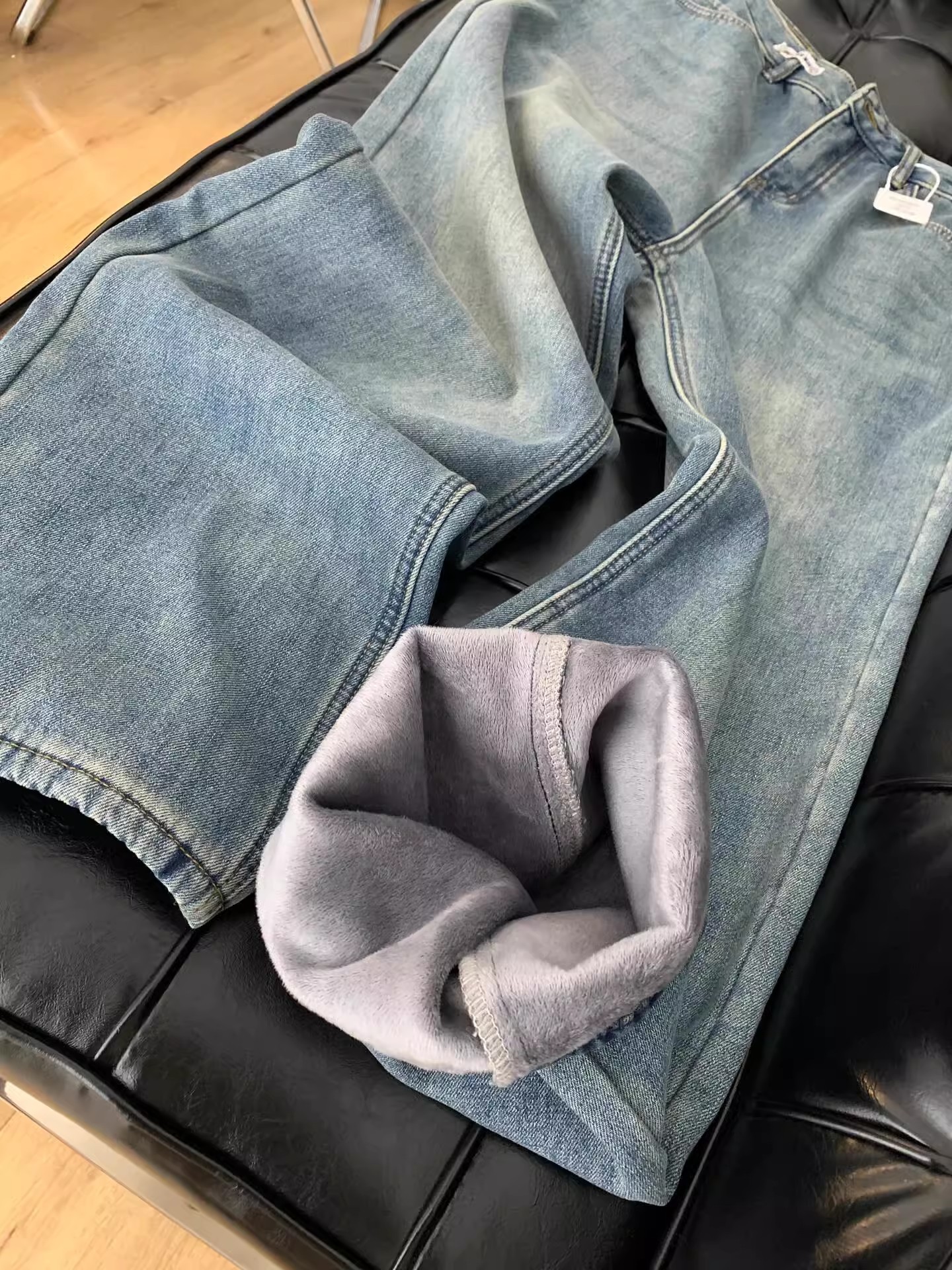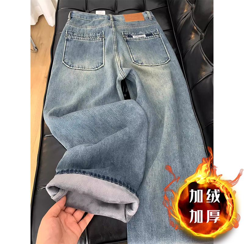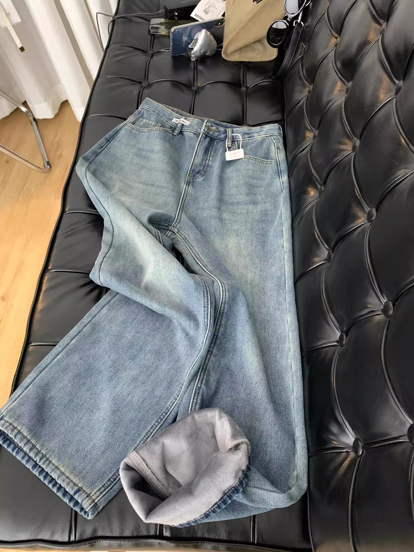 플러스 사이즈 기모 두꺼운 스트레이트 청바지 여성용 가을 및 겨울 아메리칸 스타일 레트로 통통녀 느슨한 씻기 좁은 넓은 다리 바지스토어 가기