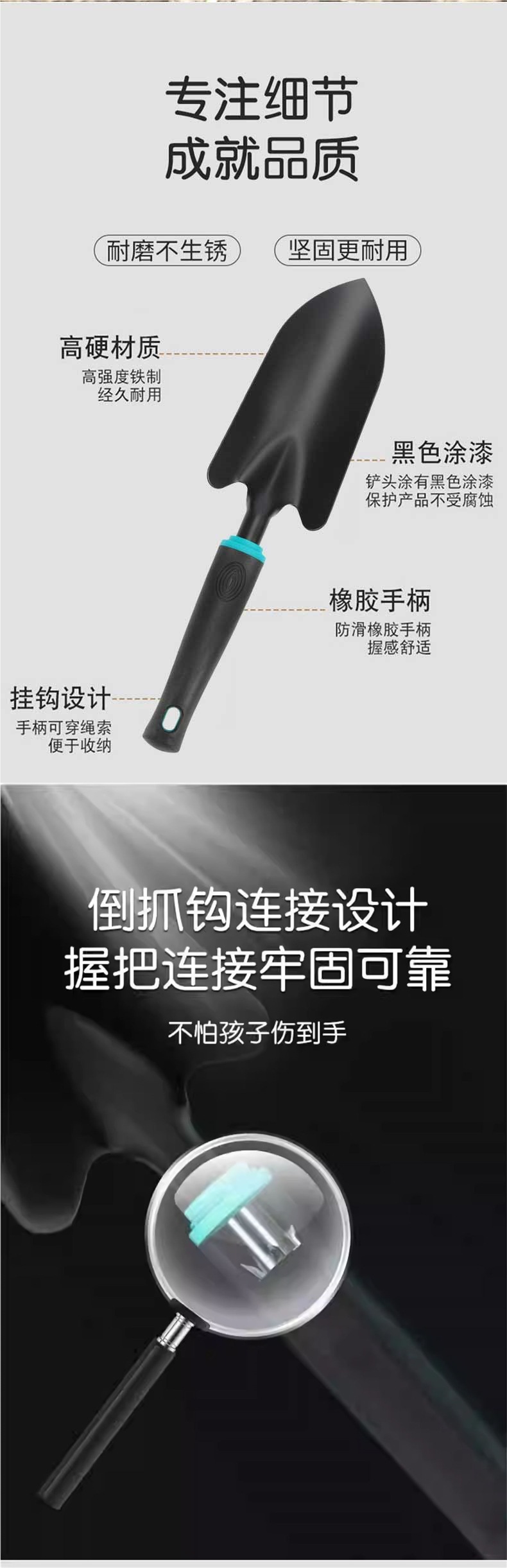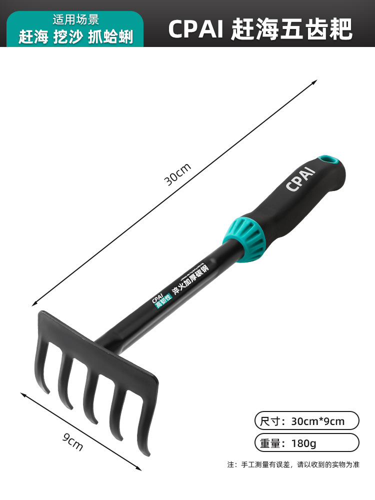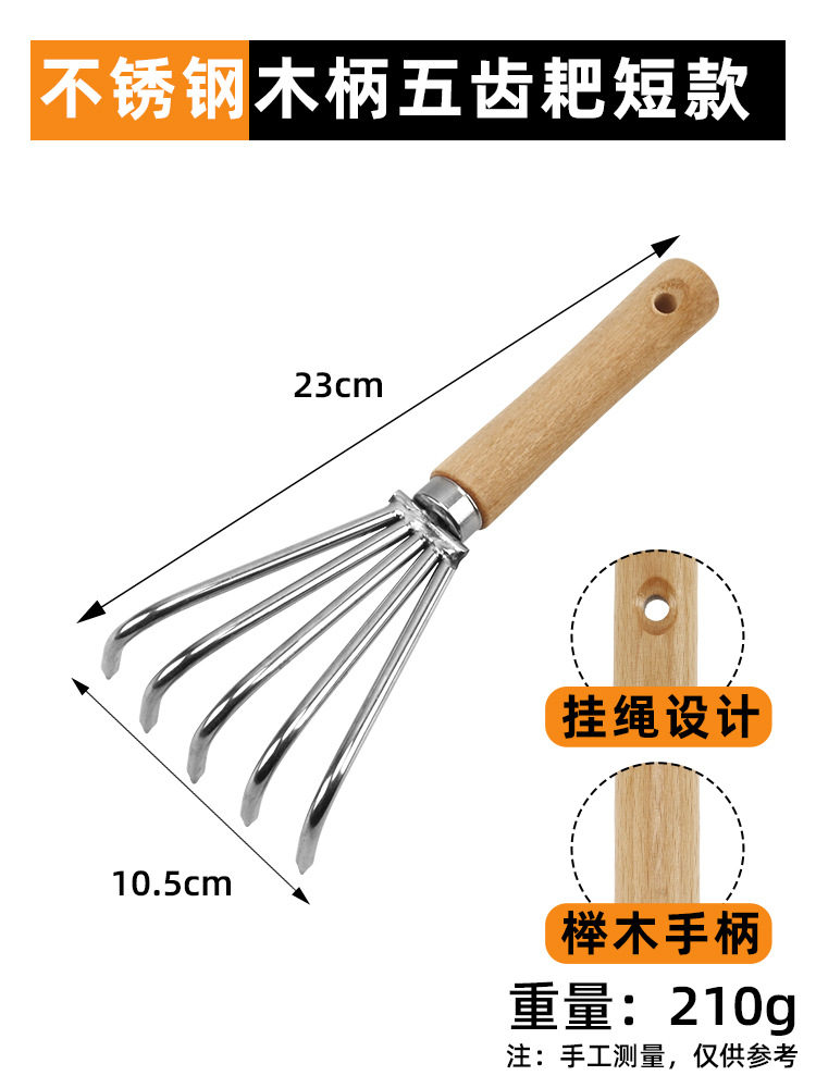 • [고급 스테인레스 스틸] 나무 손잡이가 달린 짧은 5개 톱니 조개 갈퀴