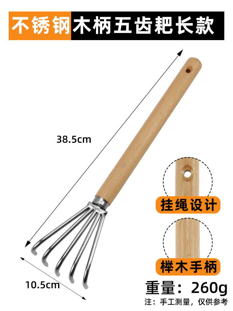 • [고급 스테인레스 스틸] 나무 손잡이가 달린 긴 5개 톱니 조개 갈퀴