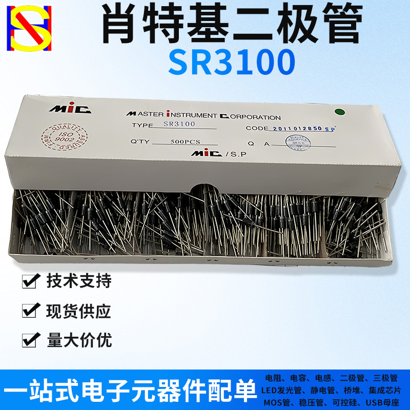 一站式电子元器件BOM配单SR3100 插件肖特基二极管 DO-27 散装/编排带/定型剪切短脚