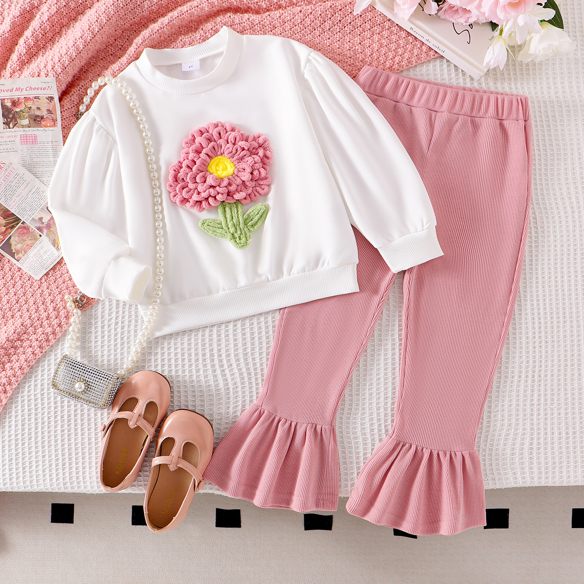 2025 대외 무역 국경 폭발 봄과 가을 유럽과 미국 스타일 소녀 크루 넥 긴 소매 3 차원 꽃 탑 솔리드 컬러 벨 바지