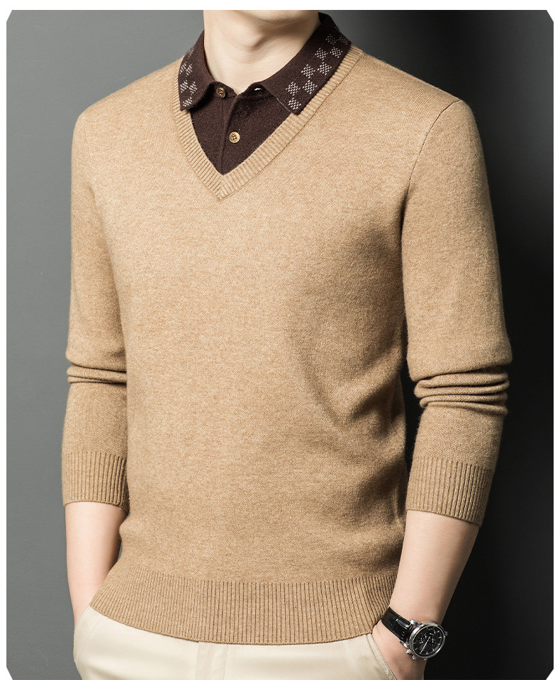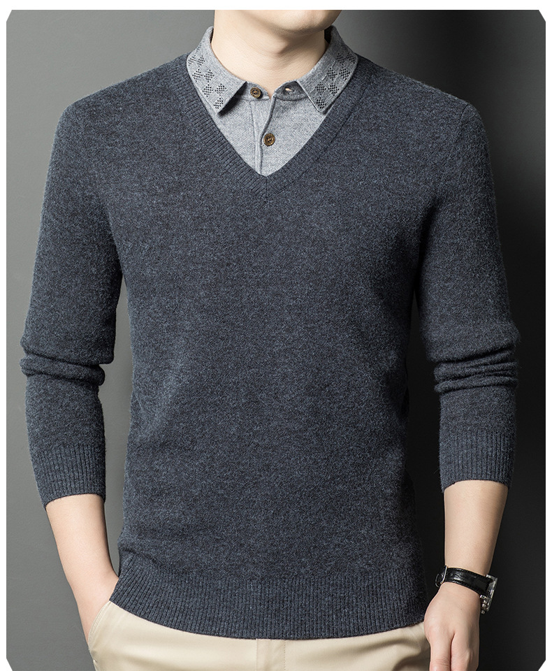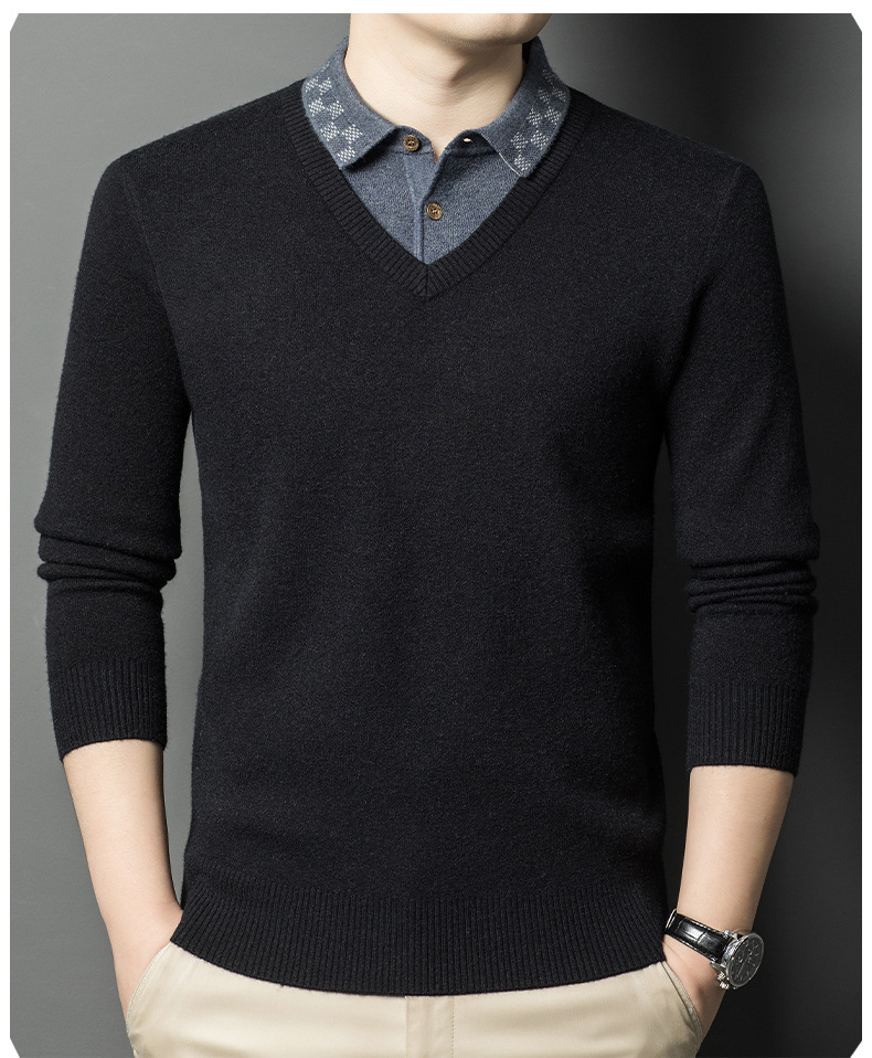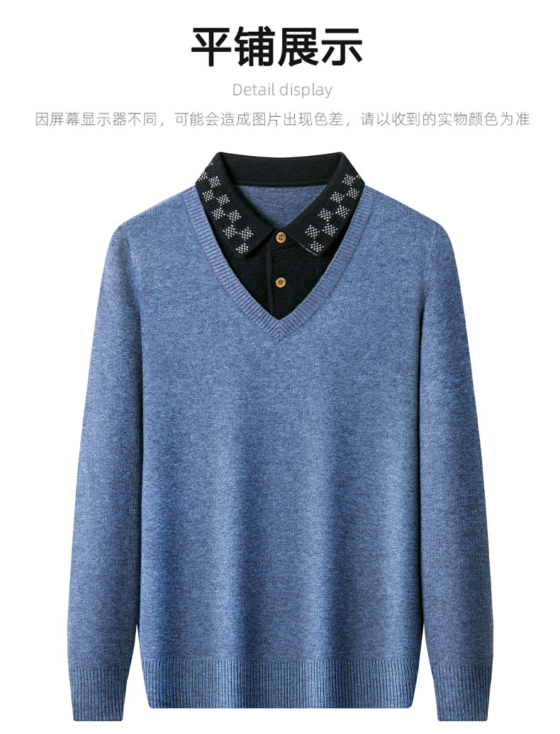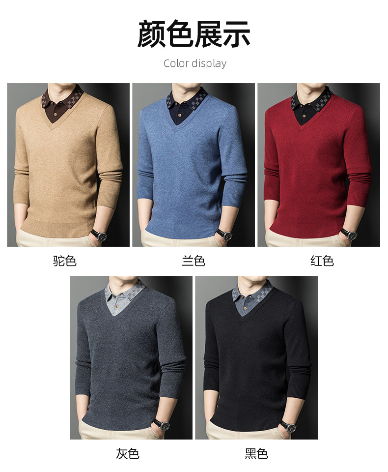 2024 봄과 가을 새로운 가짜 두 단색 스티칭 스웨터 셔츠 칼라 풀오버 패션 캐주얼 바지 셔츠 남성 의류스토어 가기