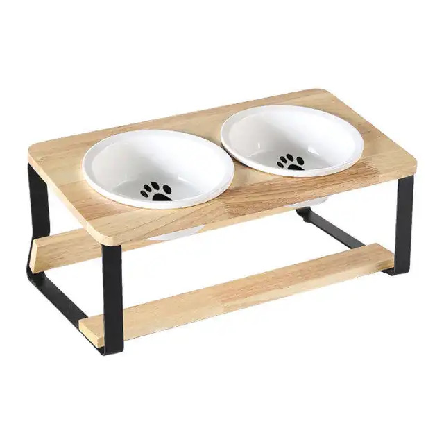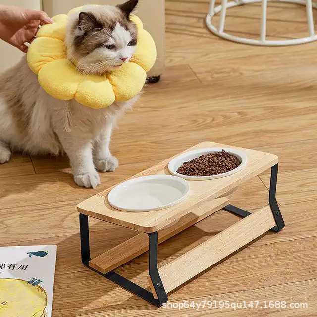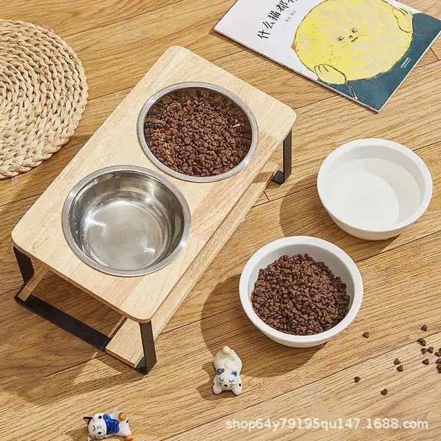 국경 간 나무 애완 동물 고양이 그릇 랙 더블 보울 비스듬한 목 보호 고양이 음식 냄비 랙 안티 노크 애완 동물 피더스토어 가기