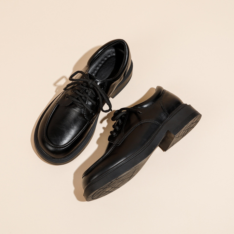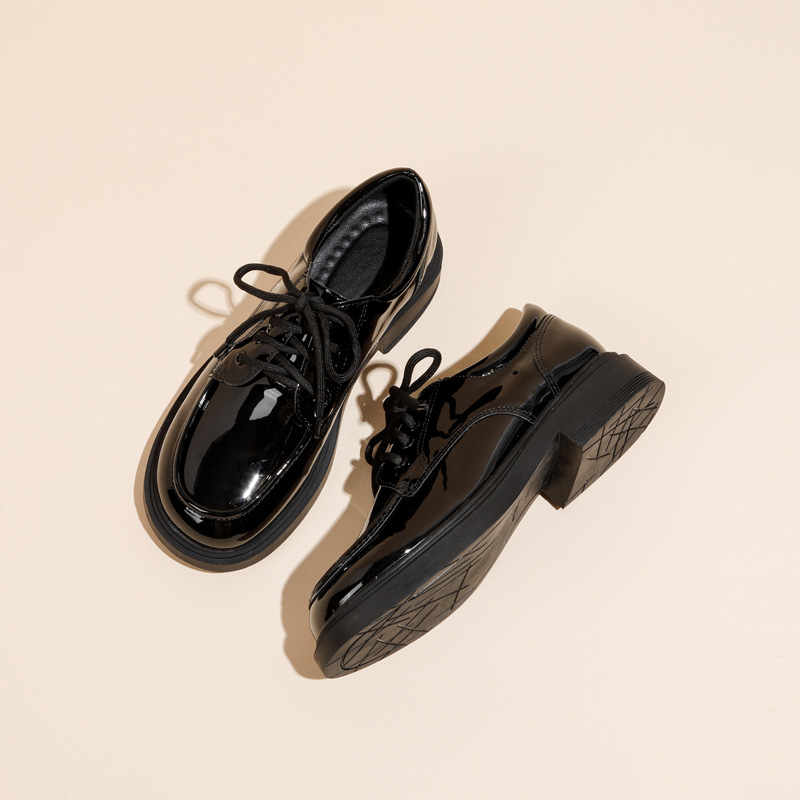 블랙 가죽 신발 여성의 2024 봄 새로운 가죽 로퍼 레이스 업 두꺼운 하단 특허 가죽 영국 스타일 올 매치 싱글 레이어 신발스토어 가기