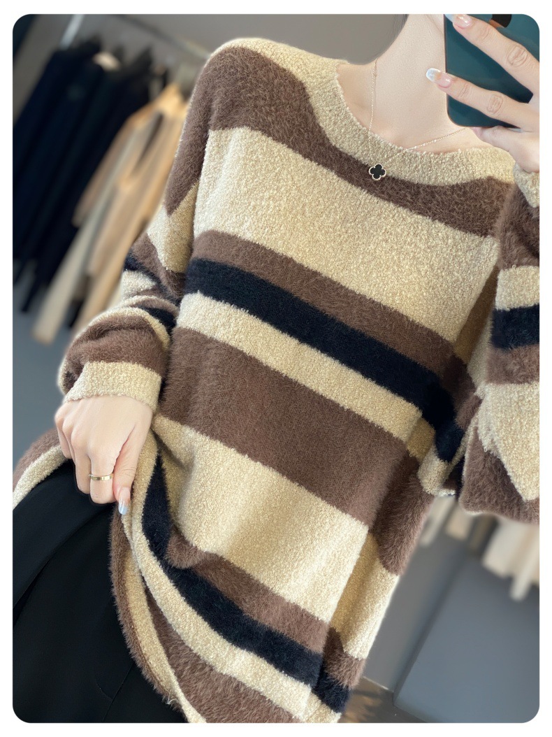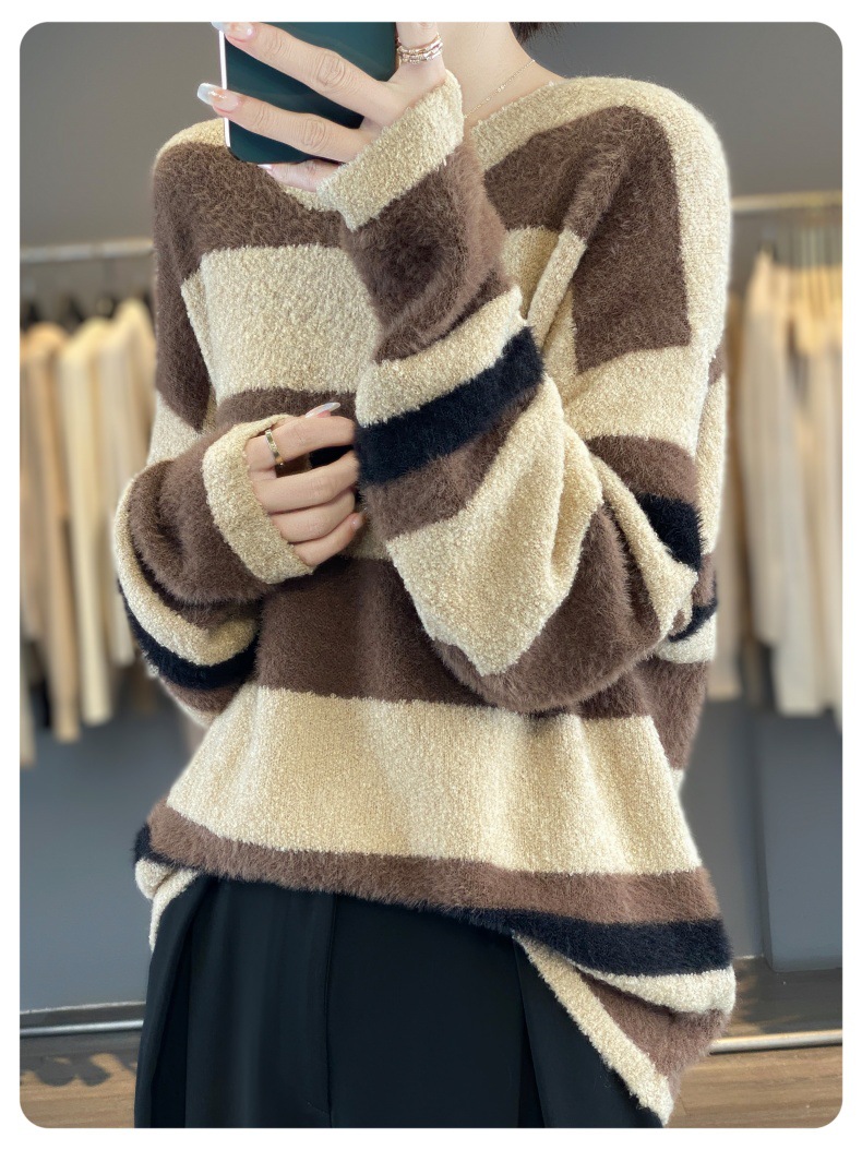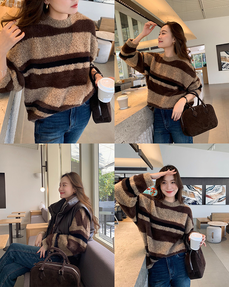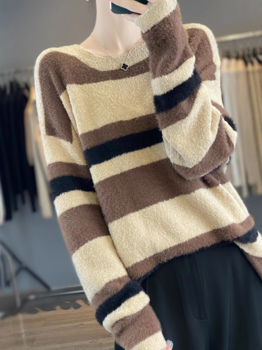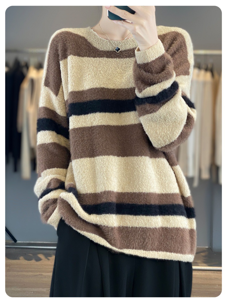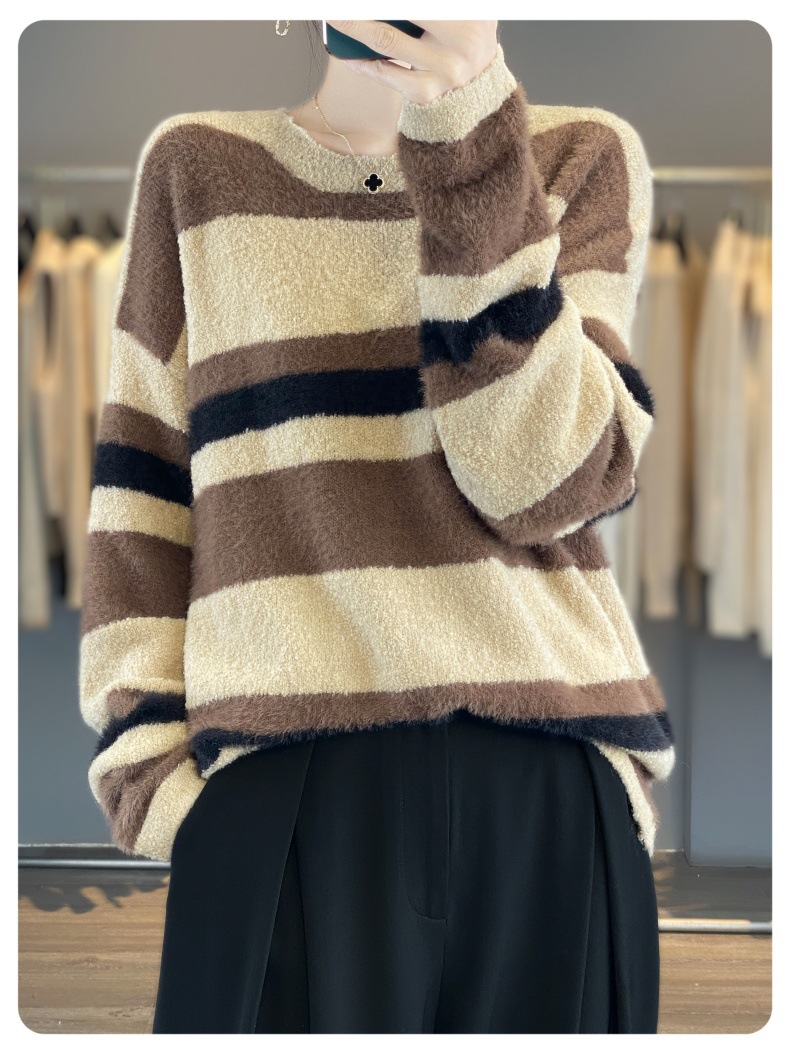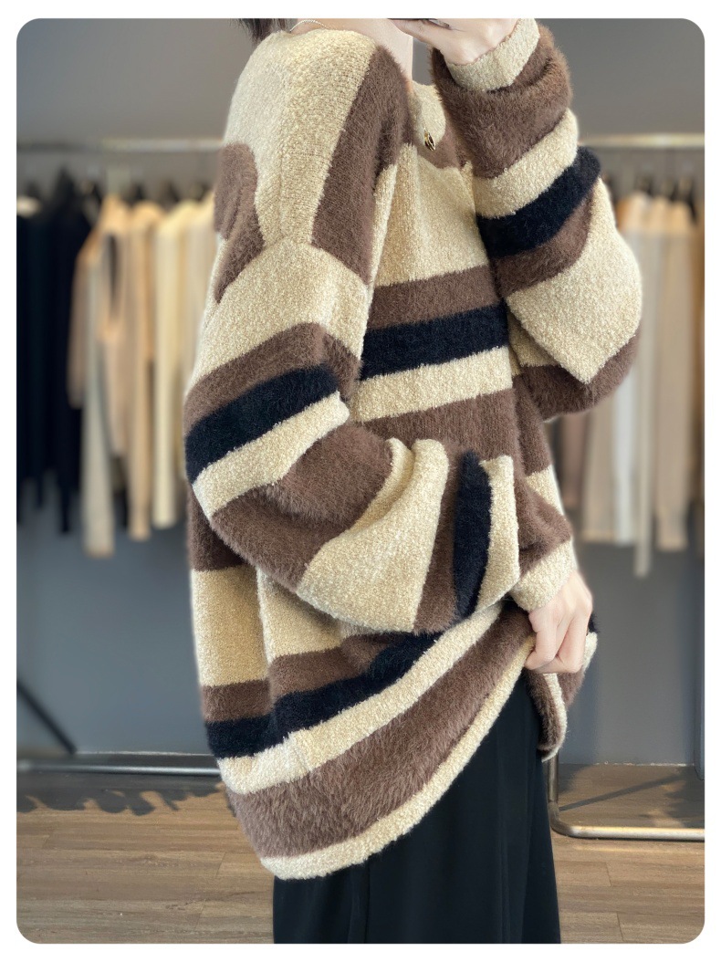 Tiramisu 루프 모방 밍크 울 와이드 게으른 스타일 대비 컬러 스트라이프 크루 넥 니트 스웨터