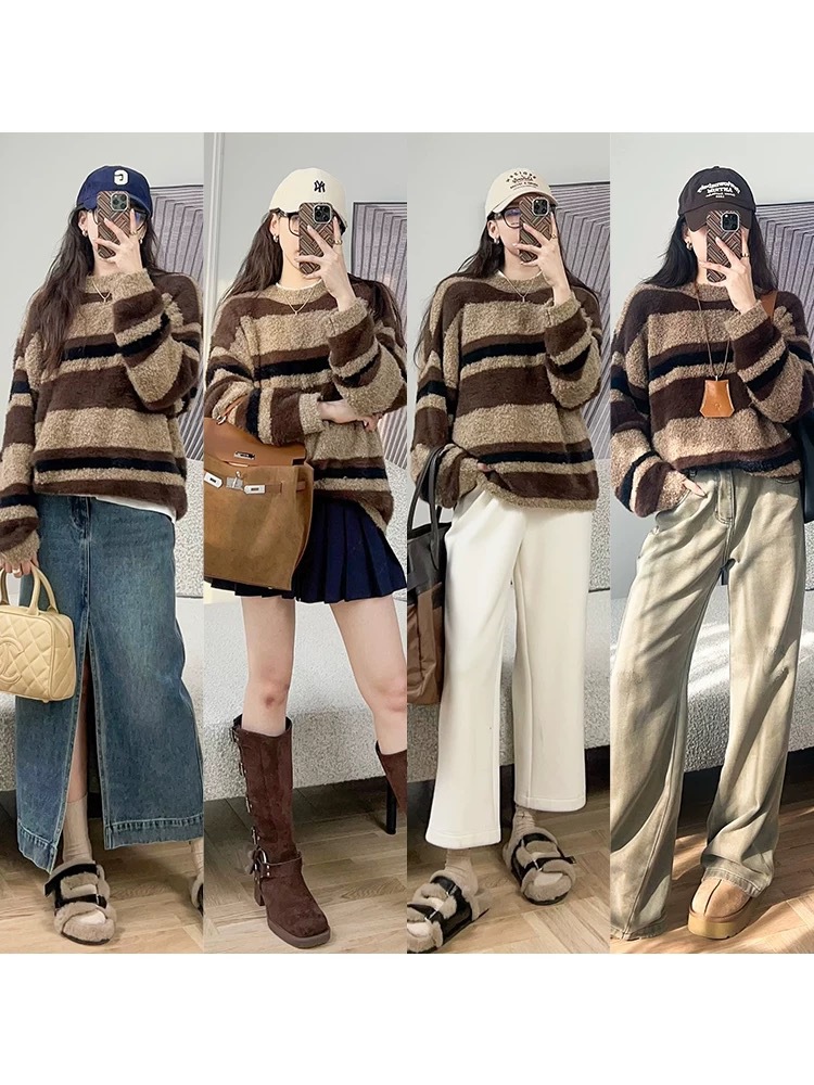 Tiramisu 루프 모방 밍크 울 와이드 게으른 스타일 대비 컬러 스트라이프 크루 넥 니트 스웨터스토어 가기