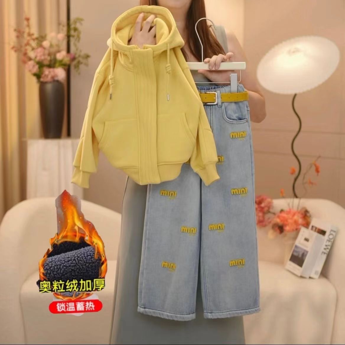 소녀들의 가을과 겨울 플러스 벨벳 세트 2024 새로운 스타일 중대형 어린이 두꺼운 후드 스타일리시 한 조각 벨벳 청바지 트렌디스토어 가기