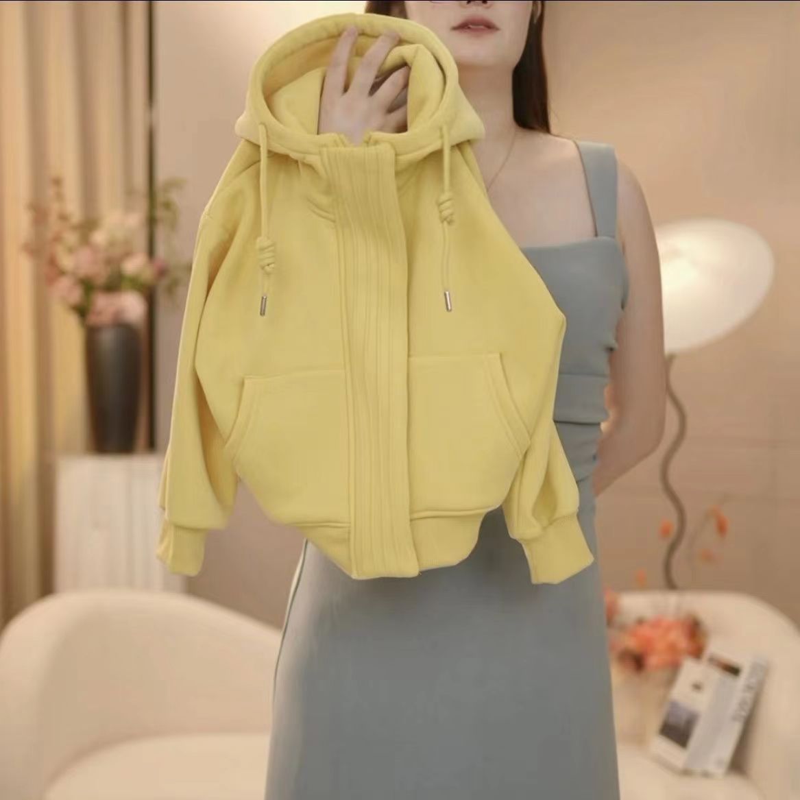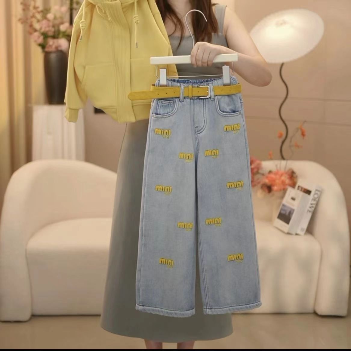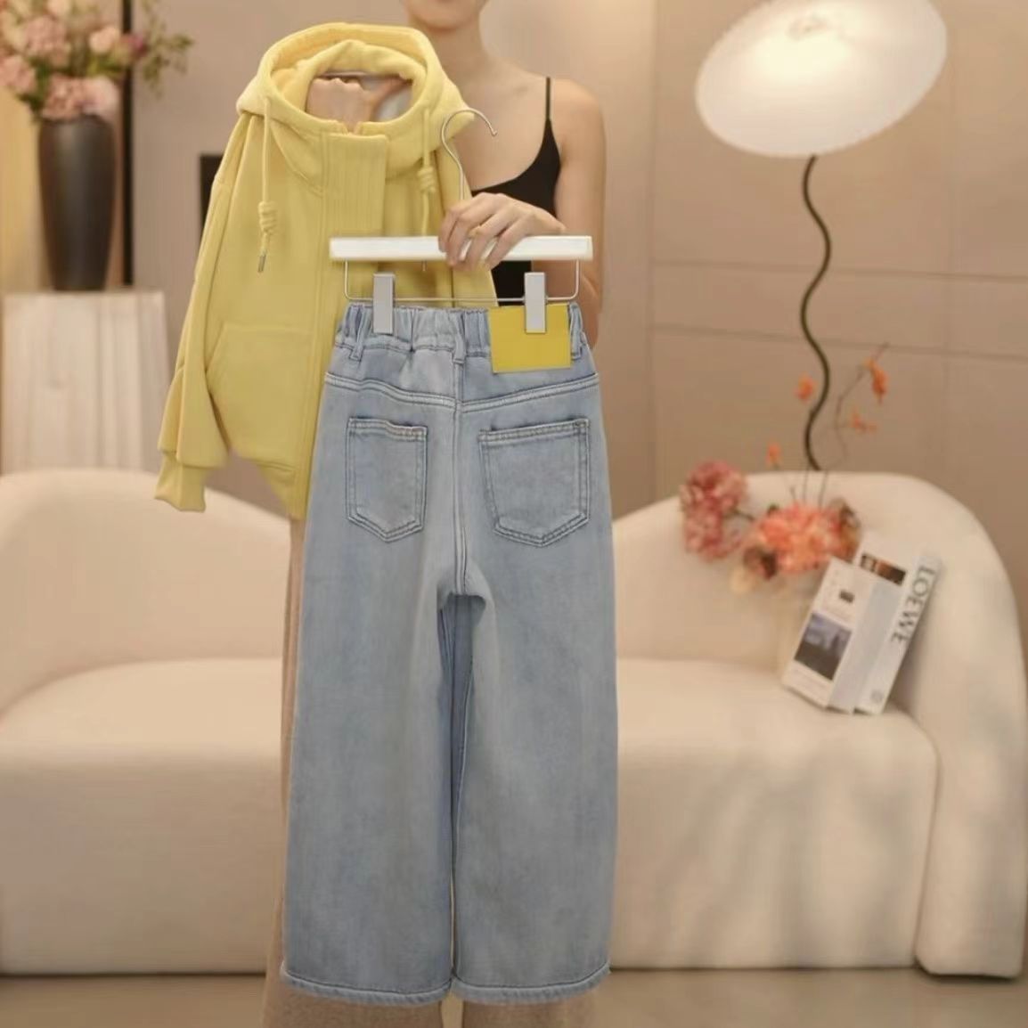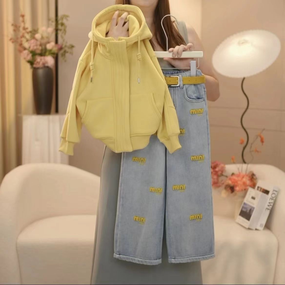 • 벨벳 옐로우 후드 스웨트셔츠 + 청바지