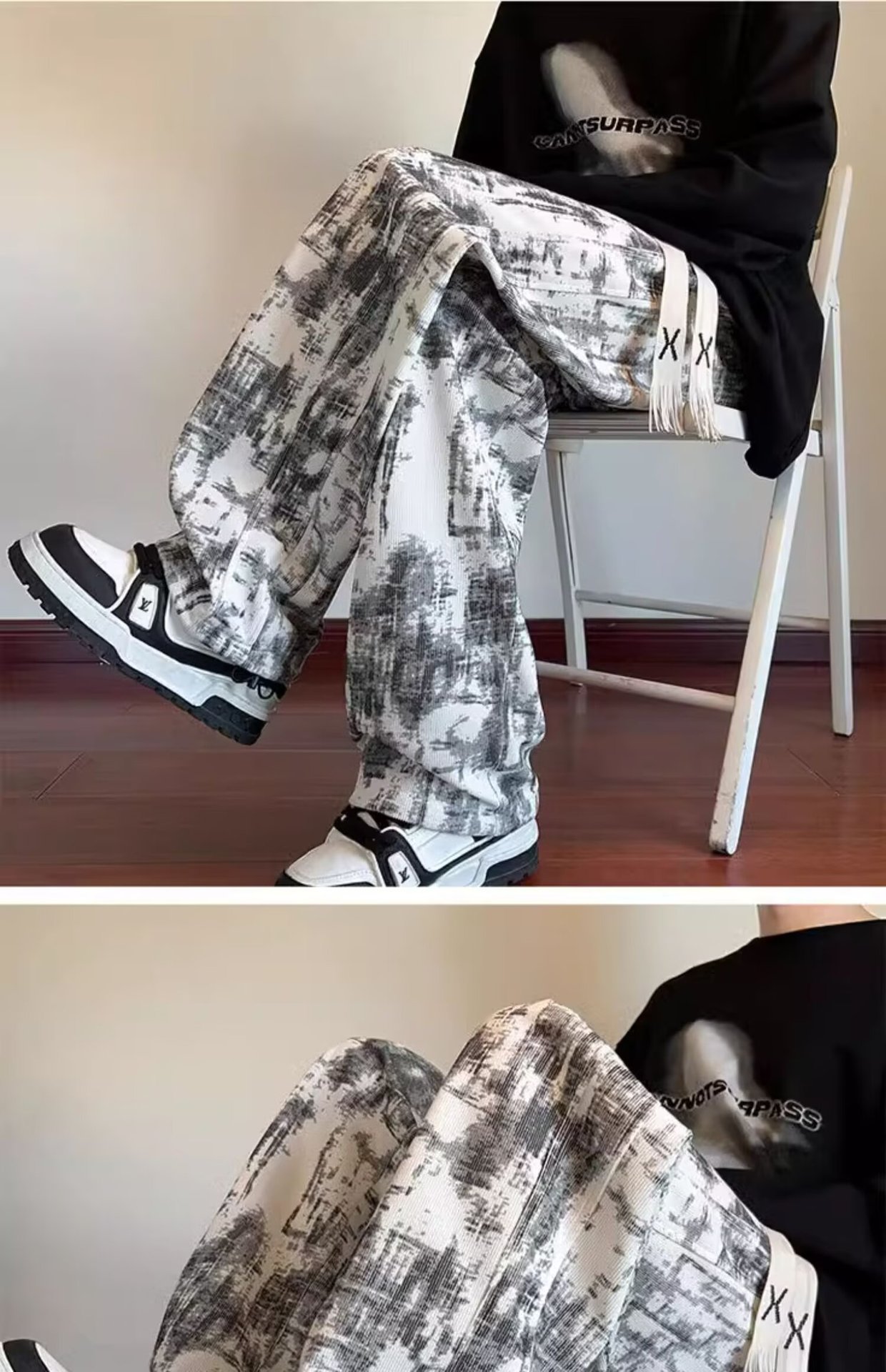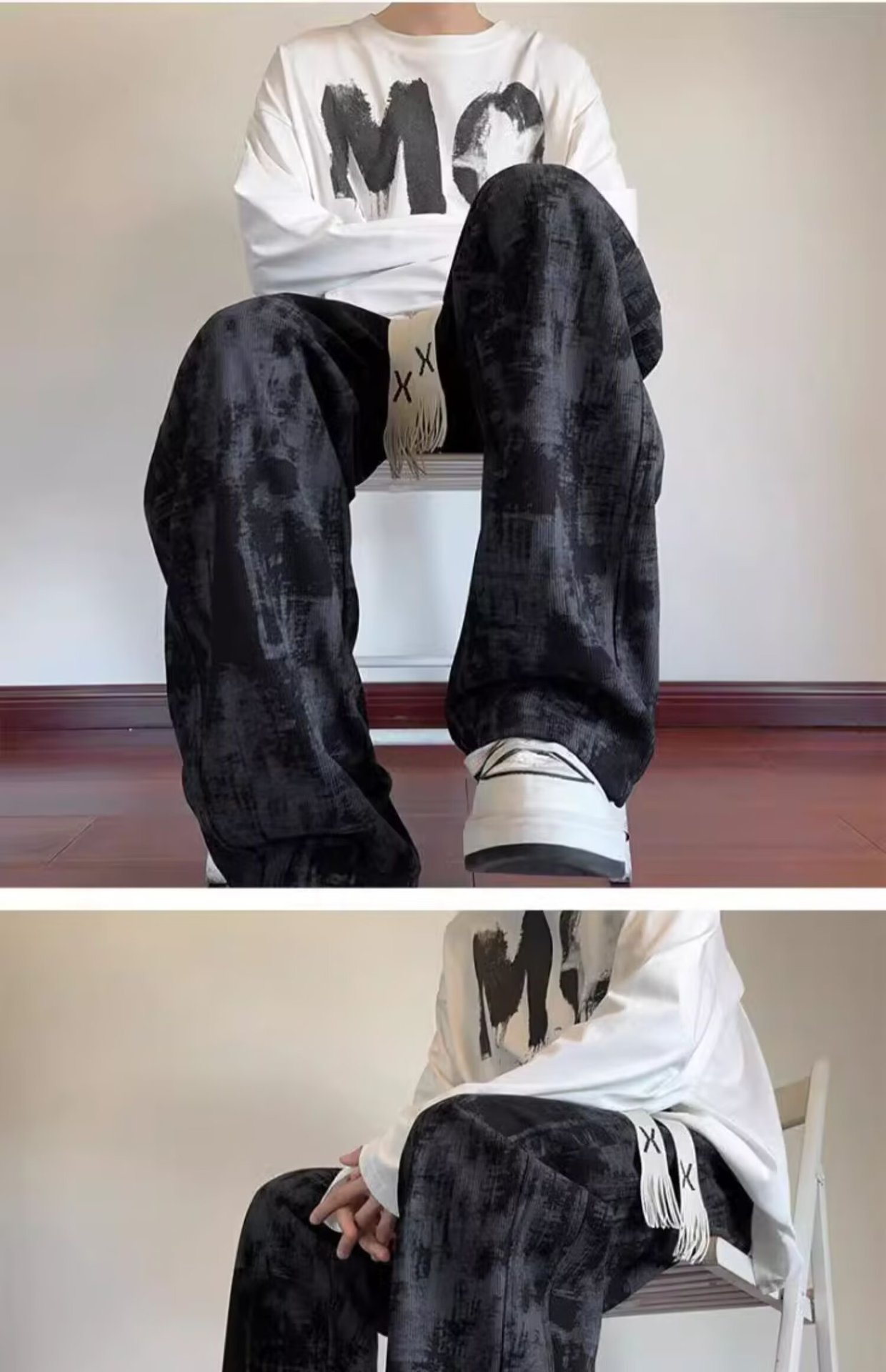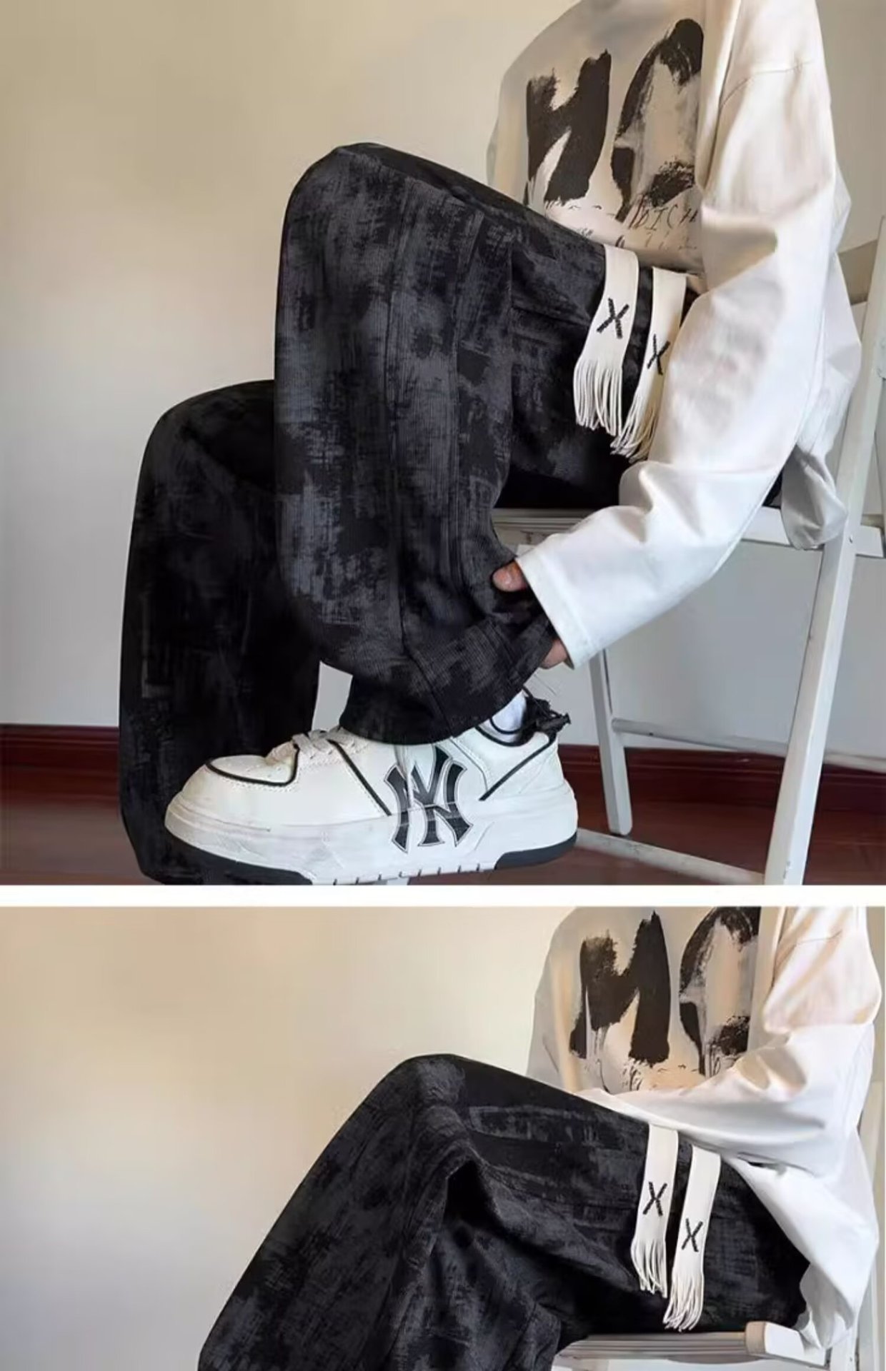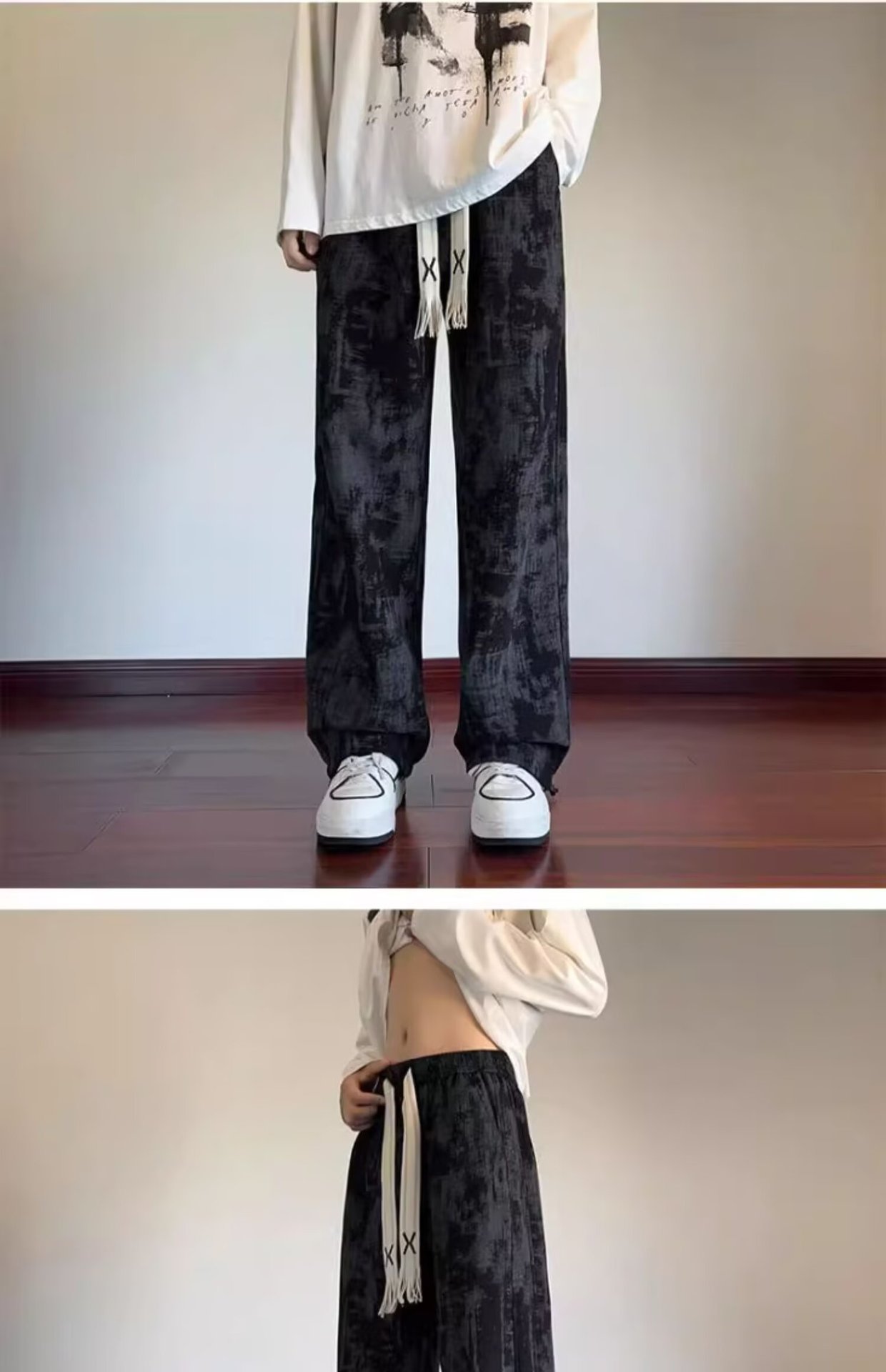 미국 타이 다이 캐주얼 바지 남자의 가을과 겨울 기모 두껍게 그려진 넓은 다리 바지 느슨한 슬리밍 스트레이트 스포츠 바지스토어 가기