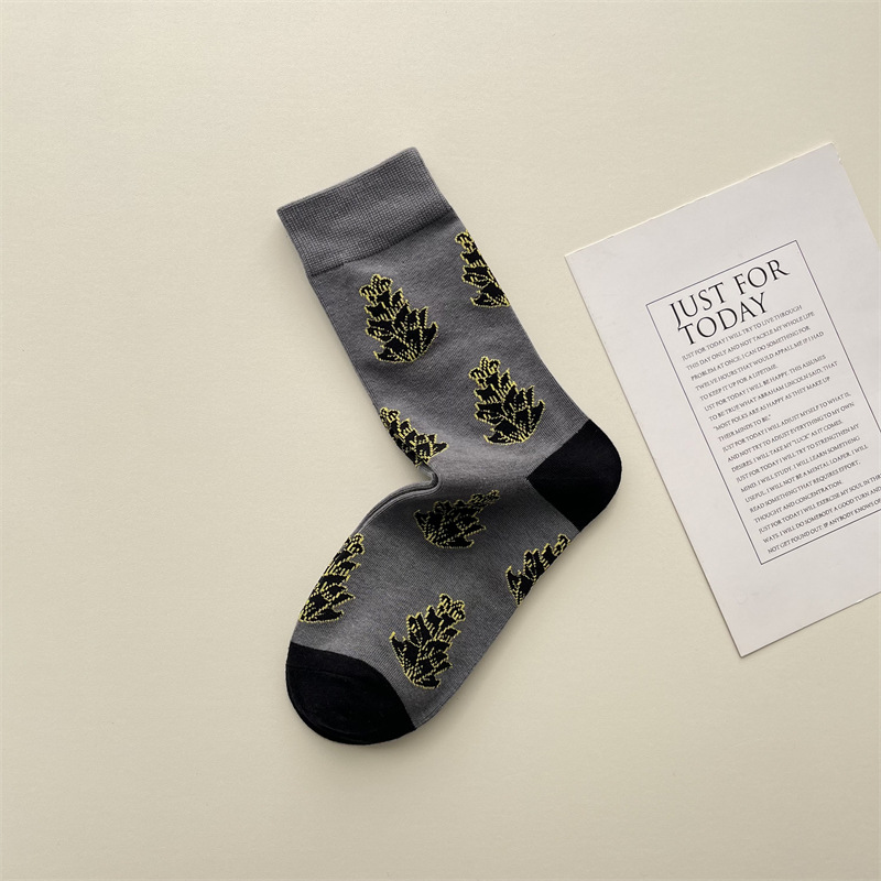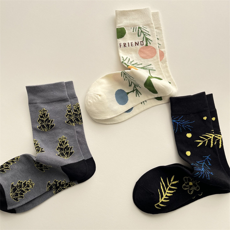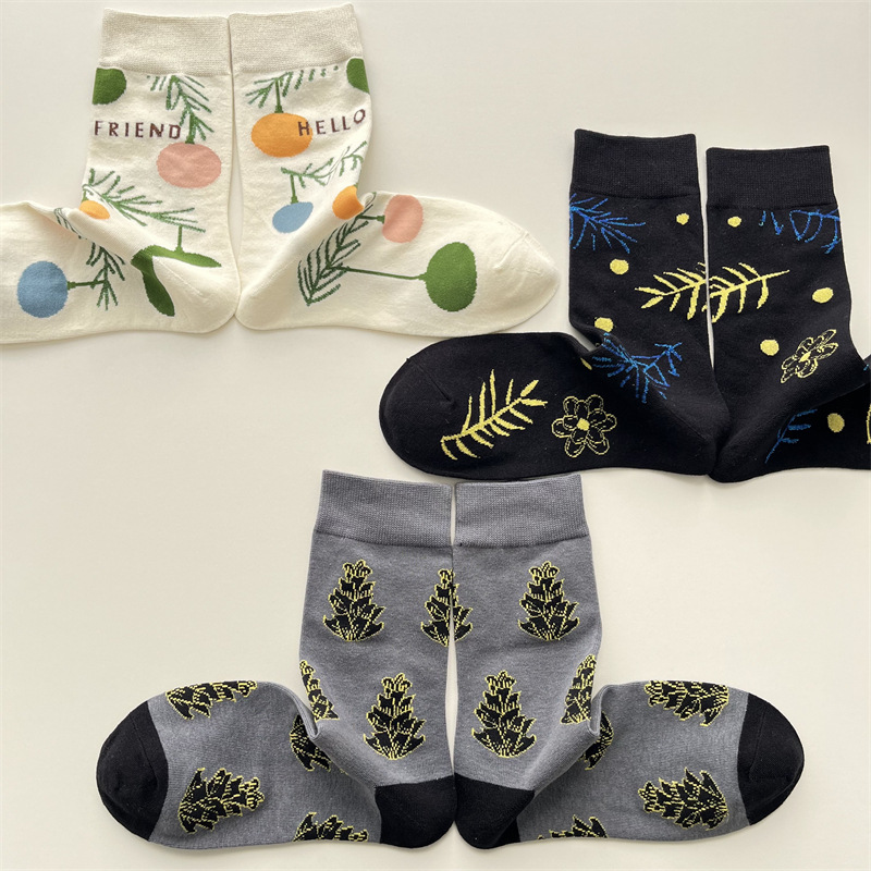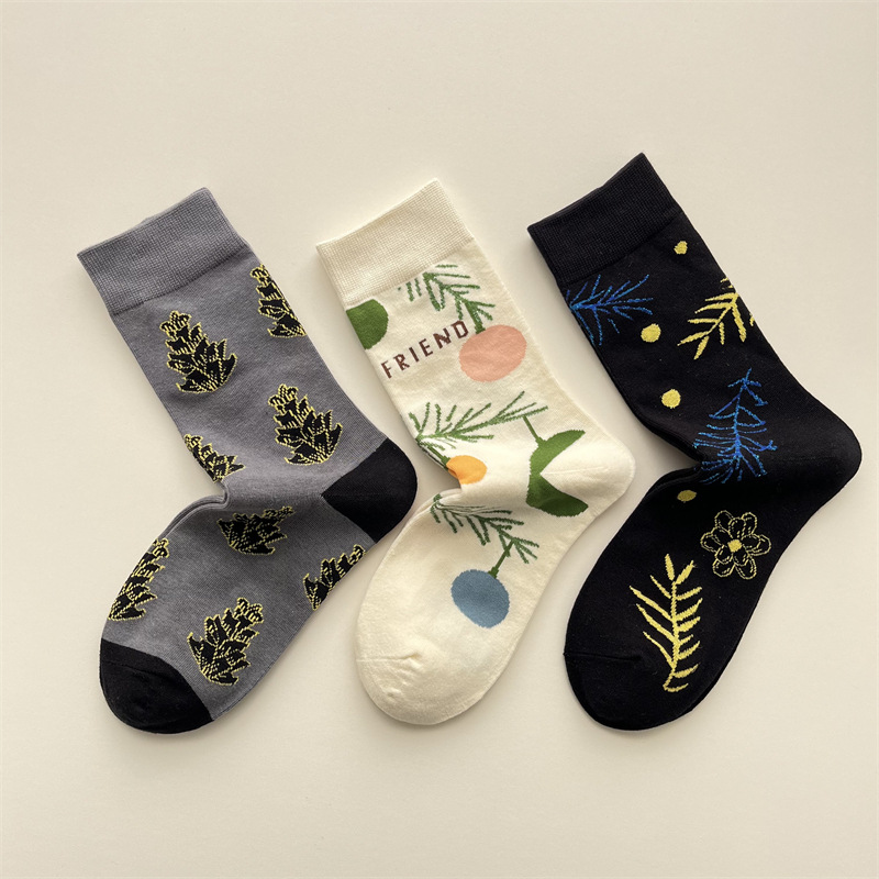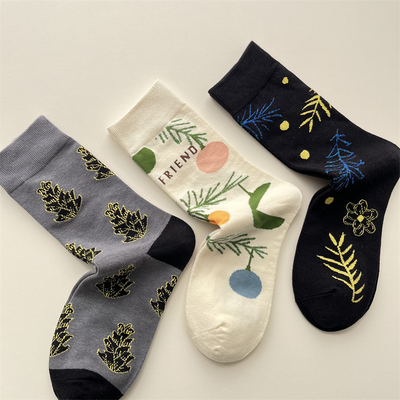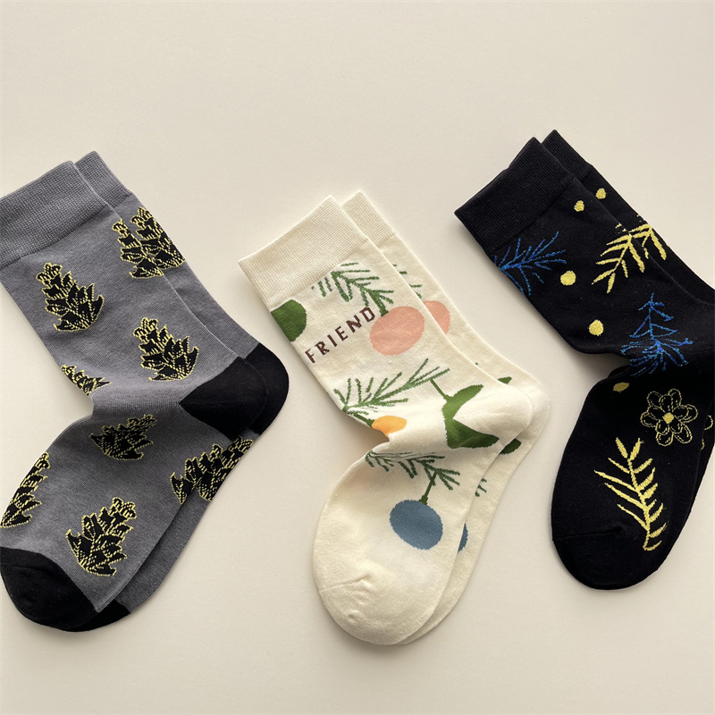 가을과 겨울 밝은 실크 자카드 잎 양말 여성 일본 빈티지 식물 꽃 중간 양말