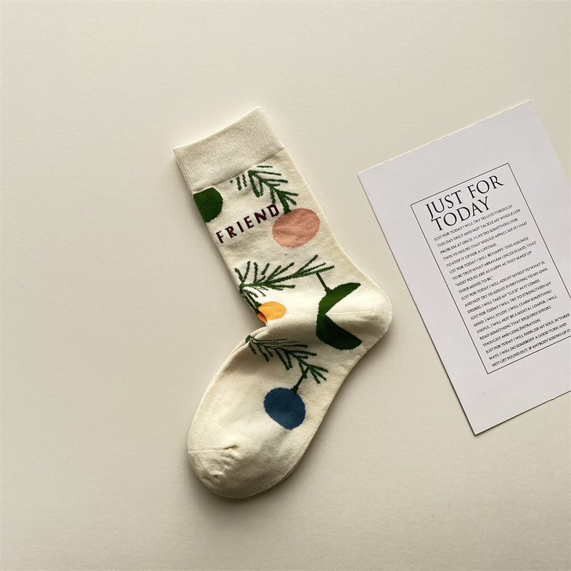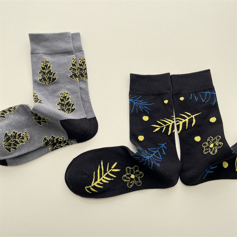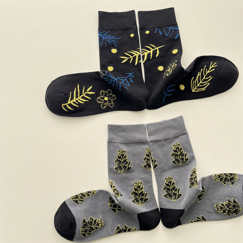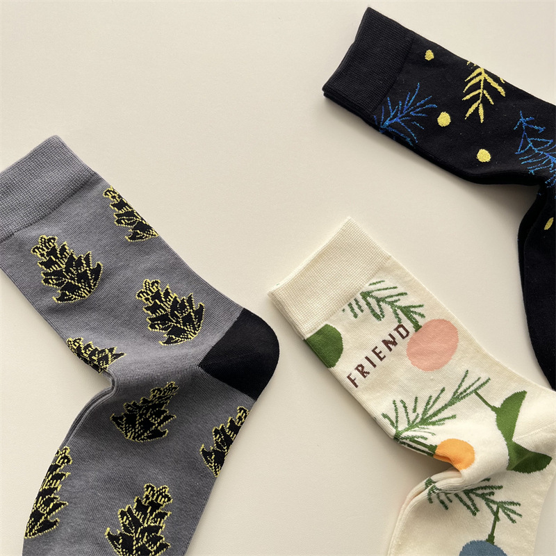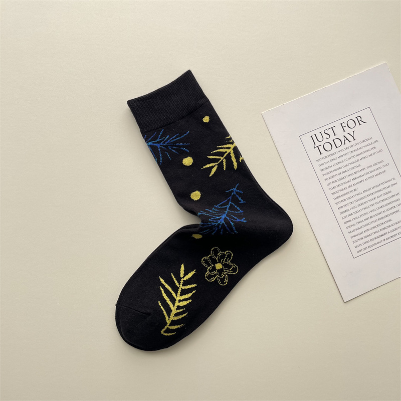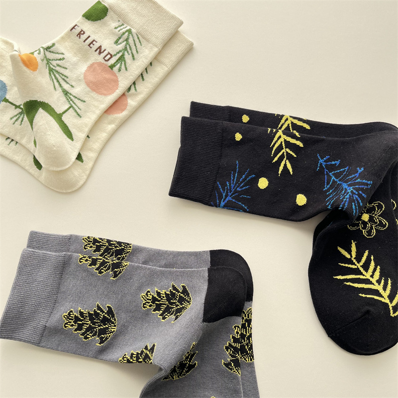 가을과 겨울 밝은 실크 자카드 잎 양말 여성 일본 빈티지 식물 꽃 중간 양말