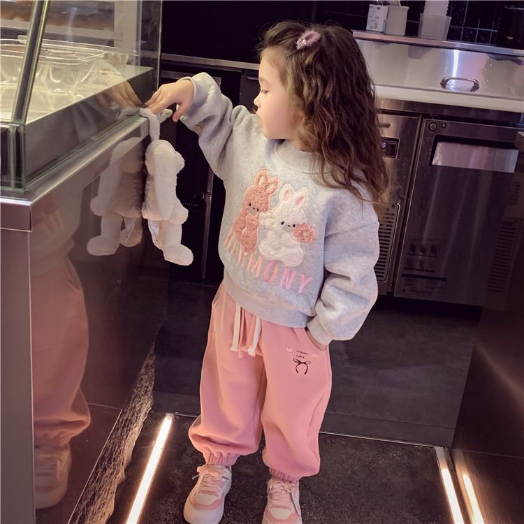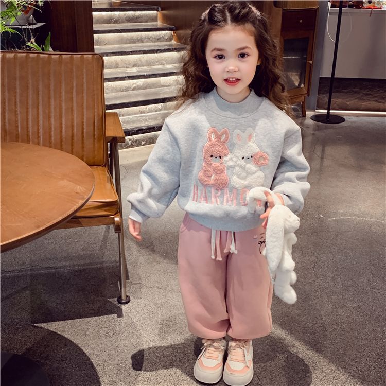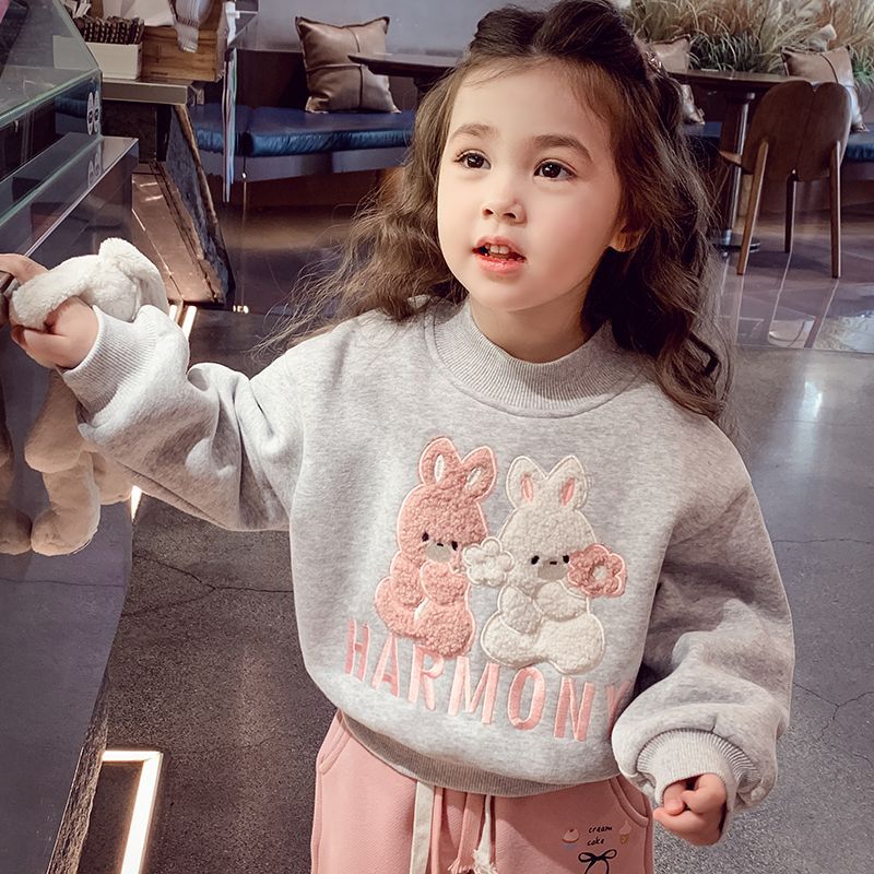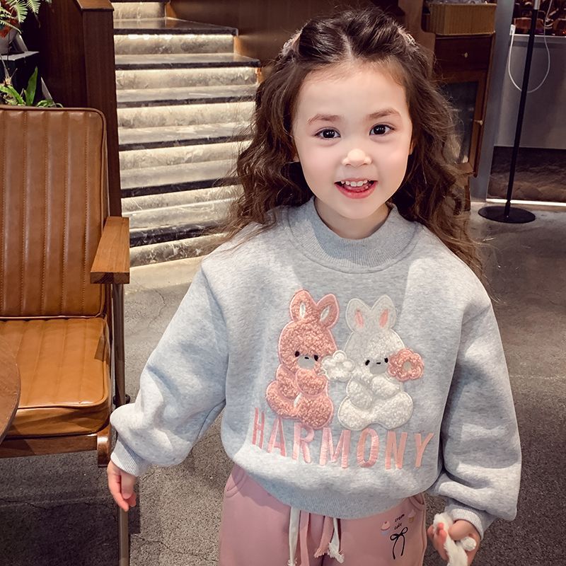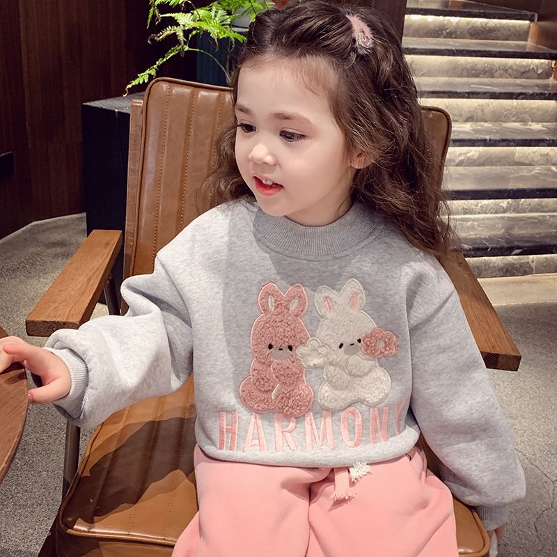 여자 기모 스웨터 겨울 2024 새로운 스타일 어린이 만화 토끼 스웨터 소녀 올매치 베이스 셔츠