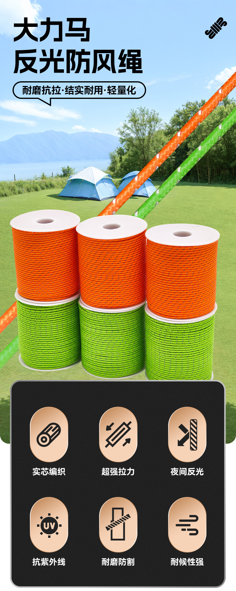 재고 Dalima 2mm 반사 바람 로프 텐트 야외 캠핑 고강도 하늘 커튼 로프 캠핑 방풍 조명 로프