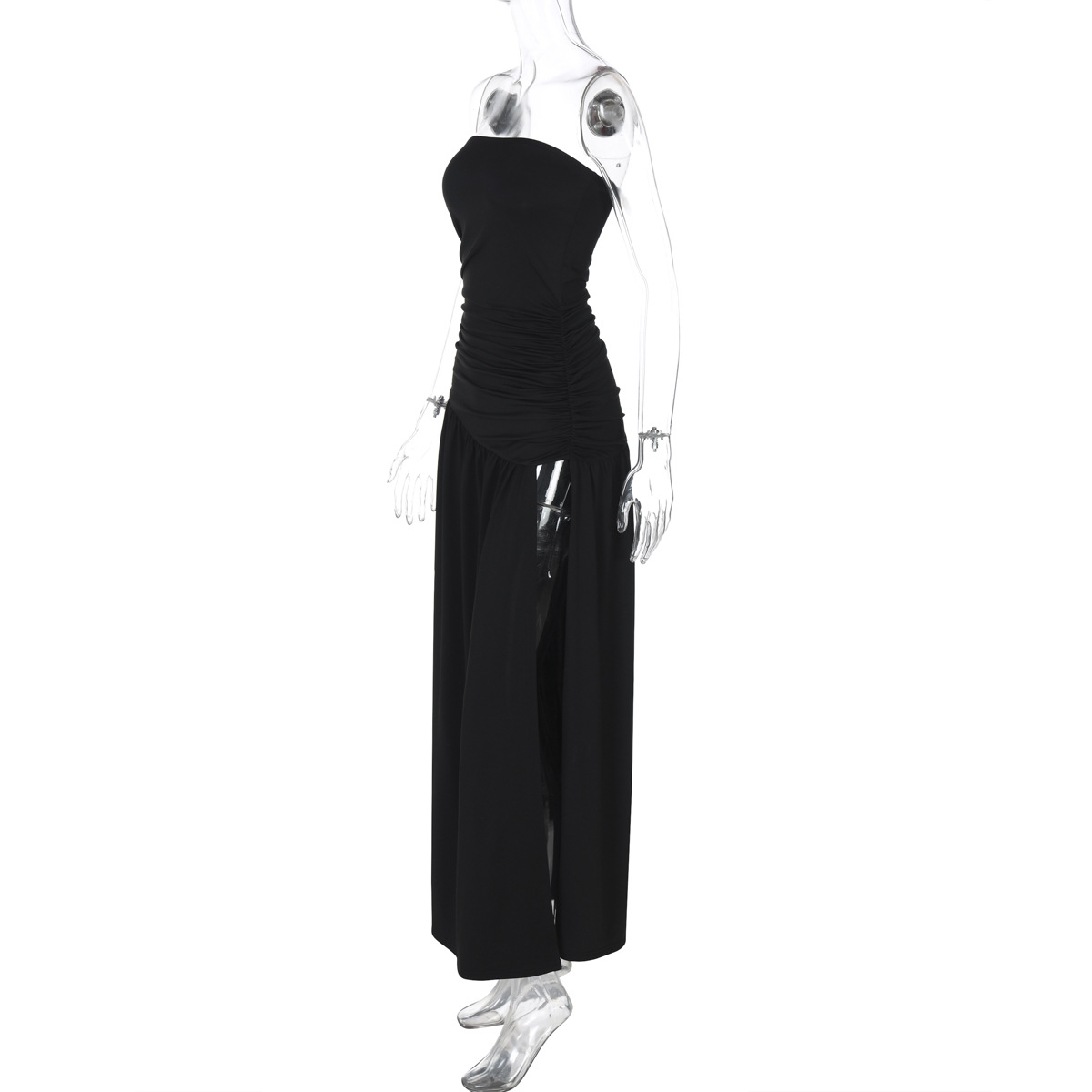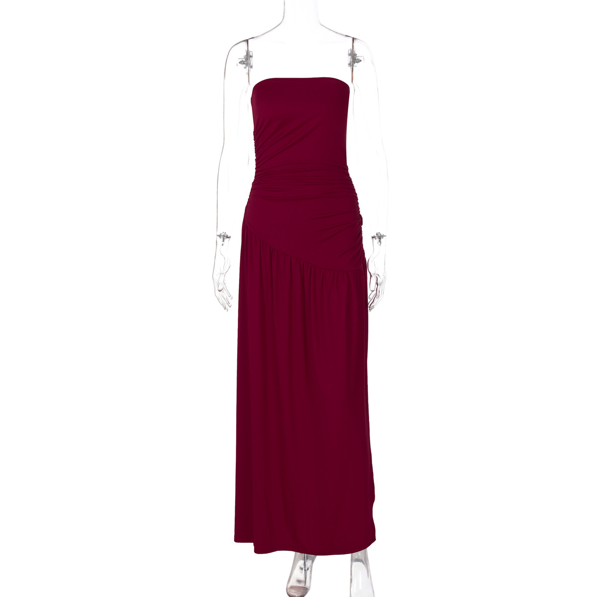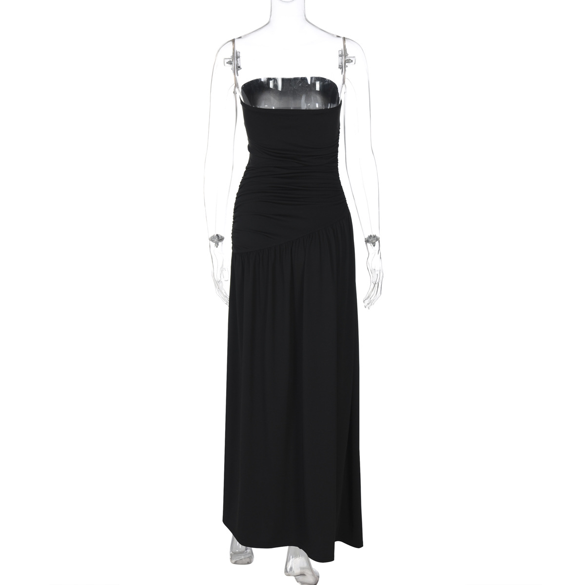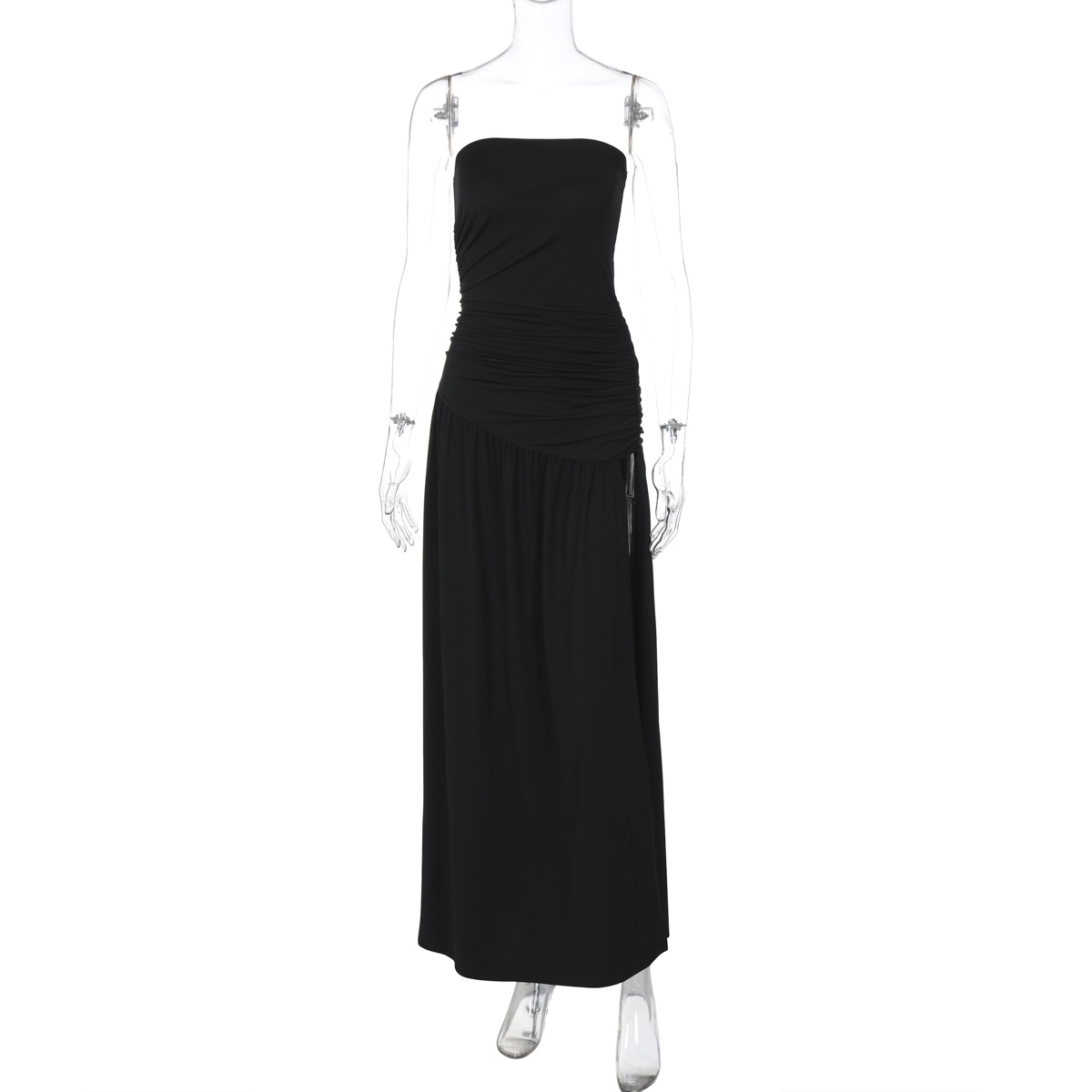 유럽과 미국 스타일 2025 봄, 여성의 새로운 단색 기질 튜브 길이 원피스 주름 분할 패션 원피스스토어 가기