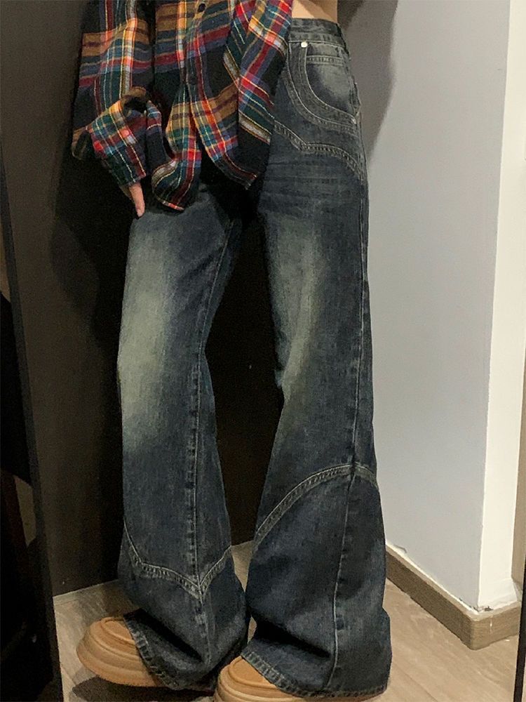 빈티지 아메리칸 스타일 하이 스트리트 스티칭 플라 드 청바지 여성의 겨울 높은 허리 느슨한 디자인 스트레이트 바지스토어 가기