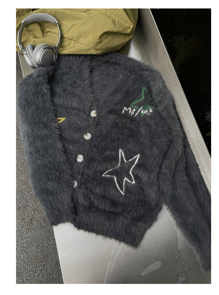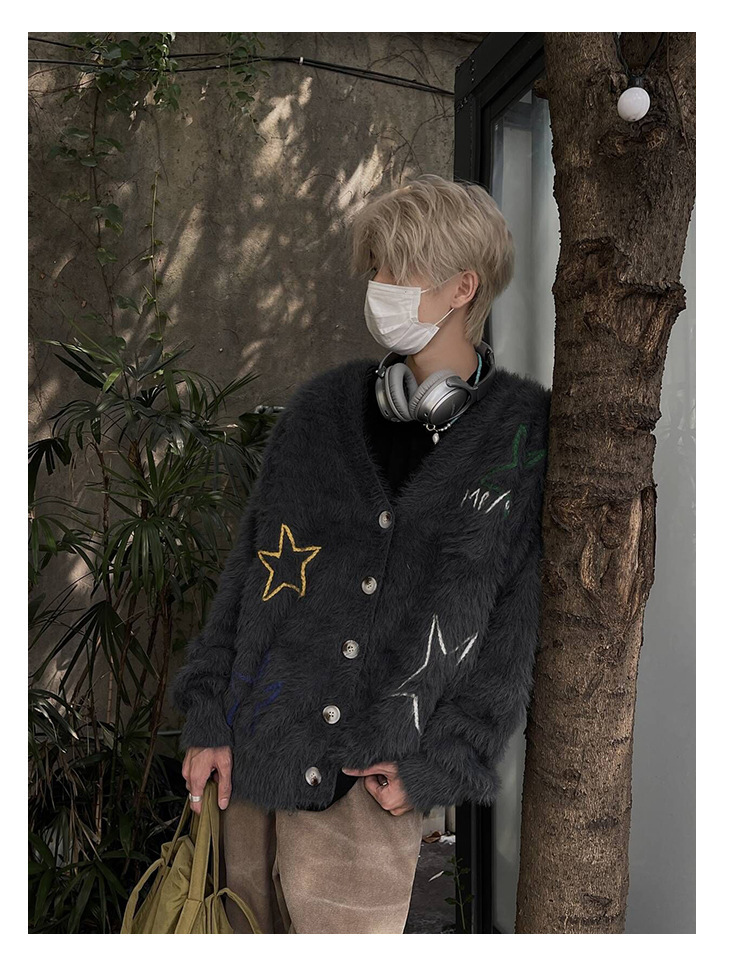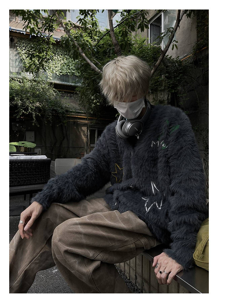 남자 2024 가을 겨울 미국 레트로 스타 자수 카디건 스웨터 남자 패셔너블 루즈 올 매치 탑 재킷