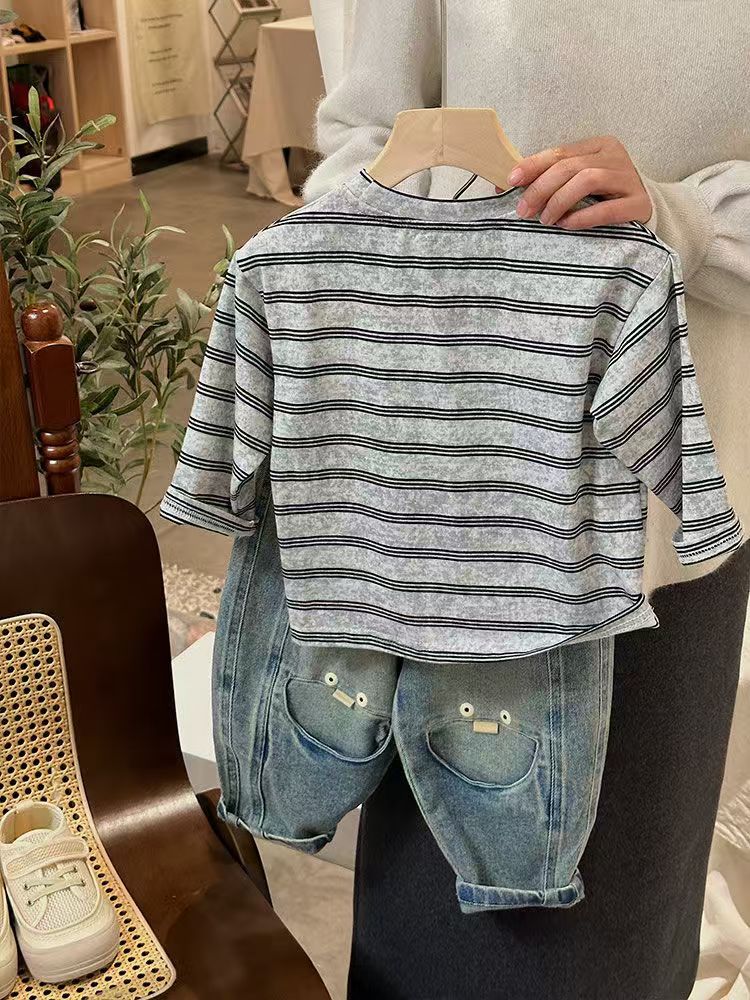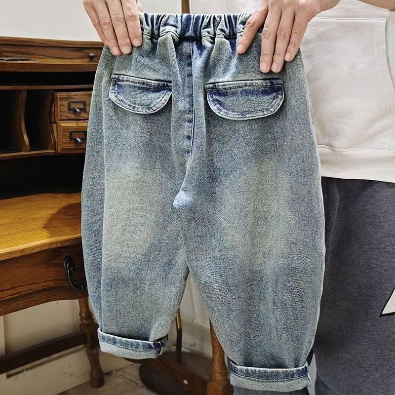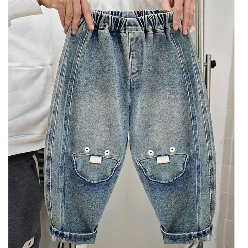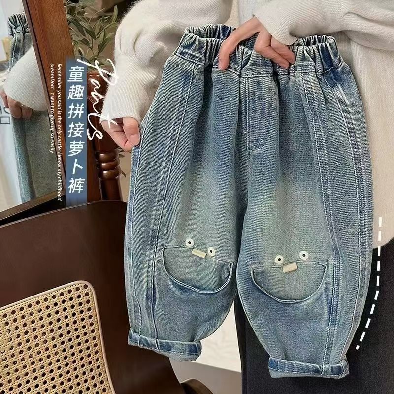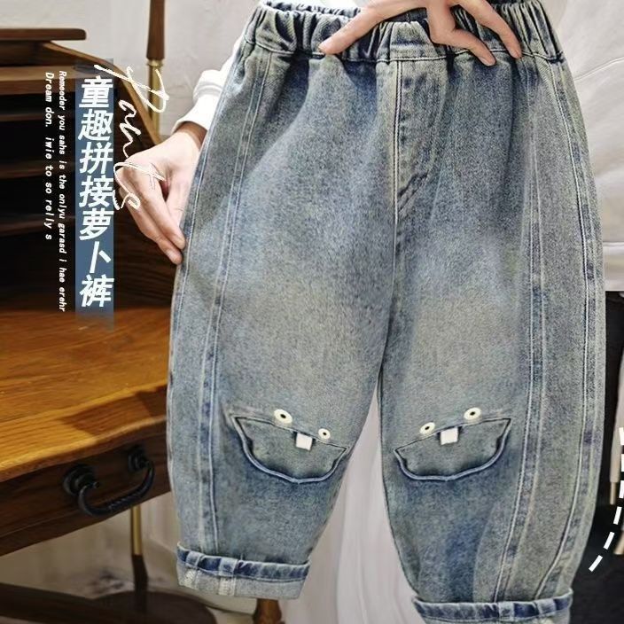 어린이 청바지 2024 봄과 가을 새로운 소년과 소녀 맞춤형 아동용 바느질 당근 바지 어린이 느슨한 올매치 트렌디스토어 가기