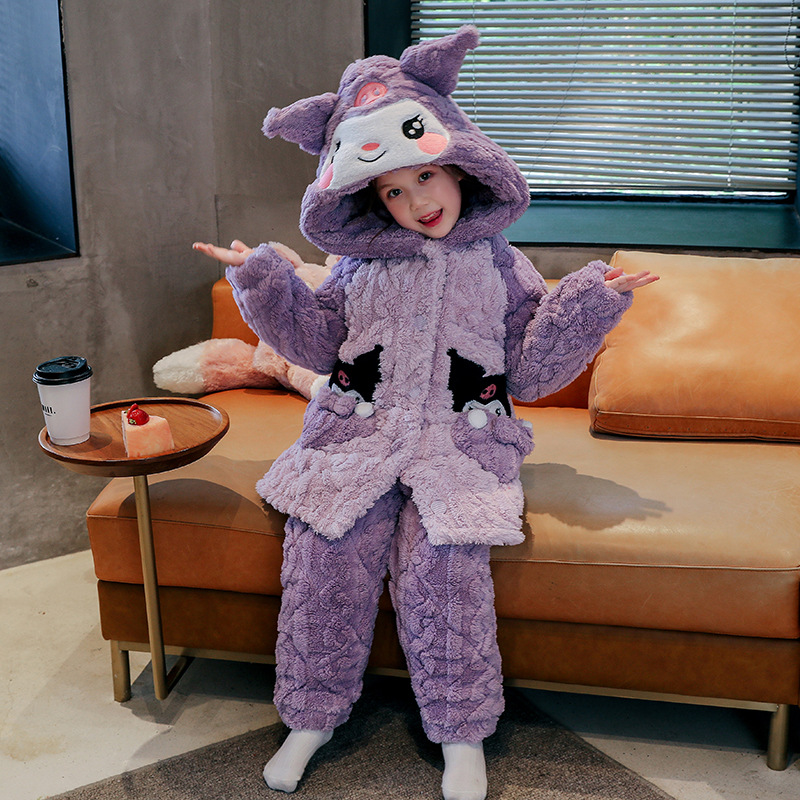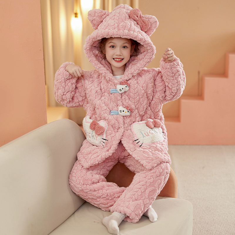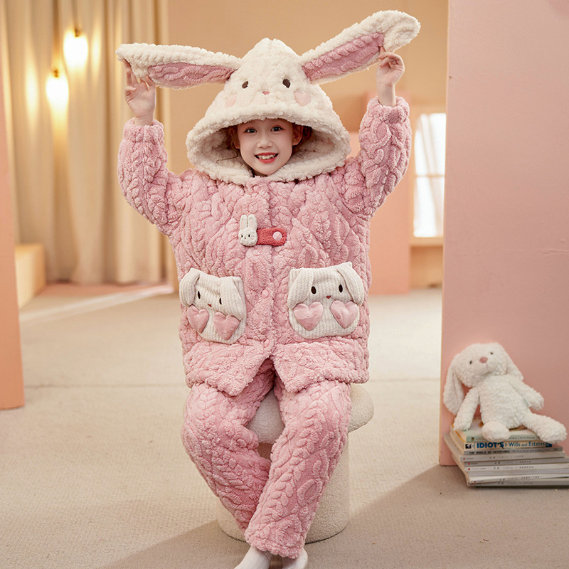 어린이 산호 양털 잠옷 소녀 기모 두꺼운 겨울 큰 어린이 만화 3 층 면화 포장 홈 의류 세트