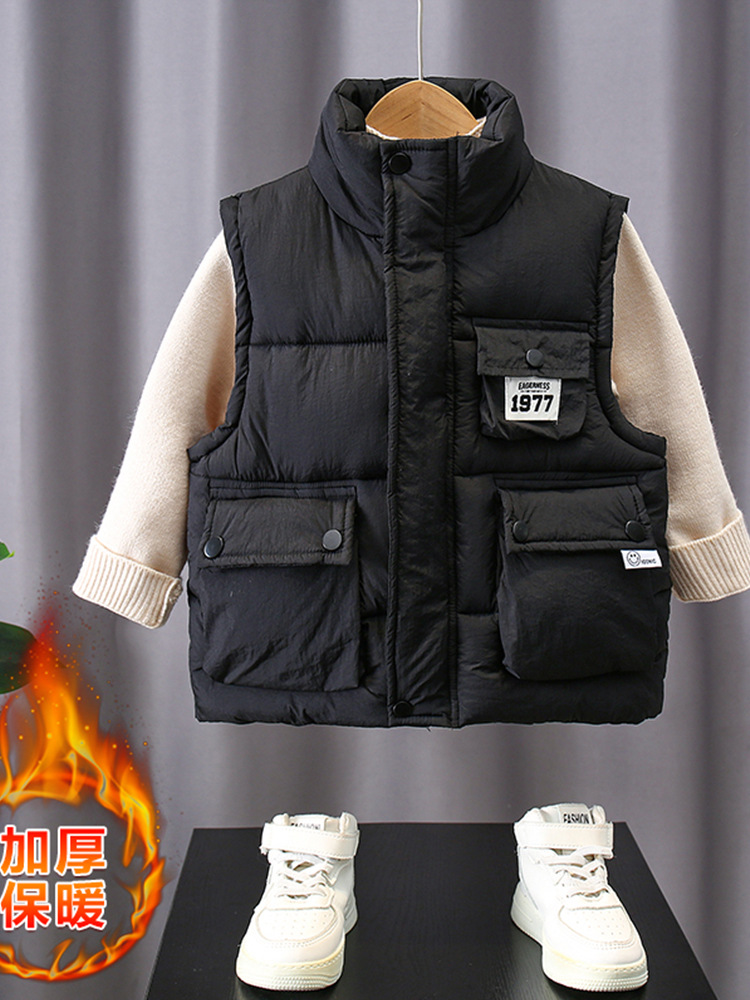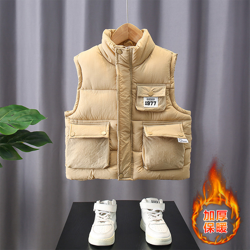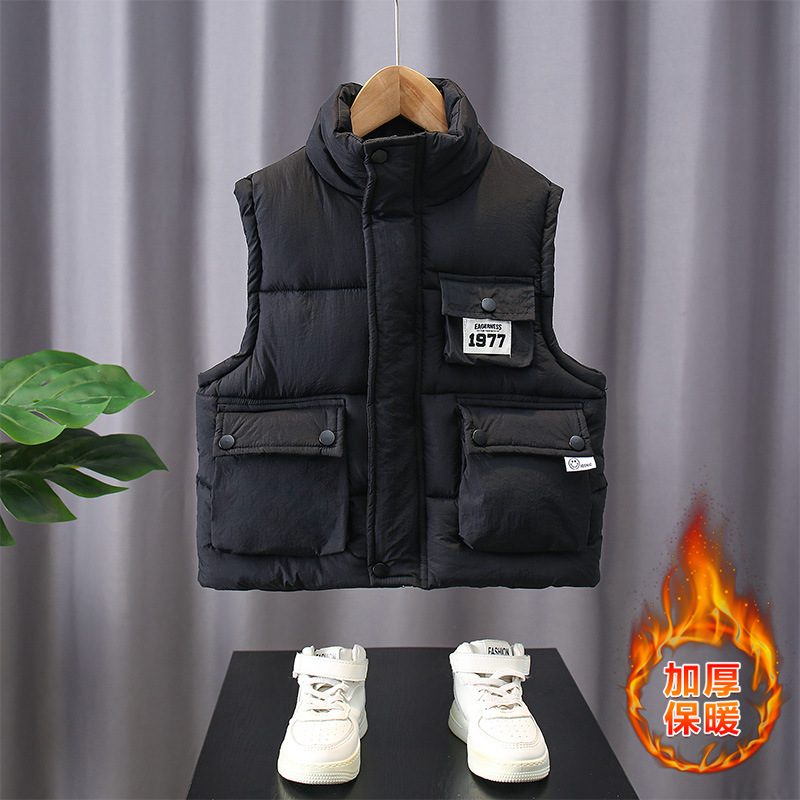 소년 조끼 어린이 2024 년 새로운 가을과 겨울 아기 한국 스타일 유행 외부가 빈 옷을 입기 위해 두꺼운 면화 조끼