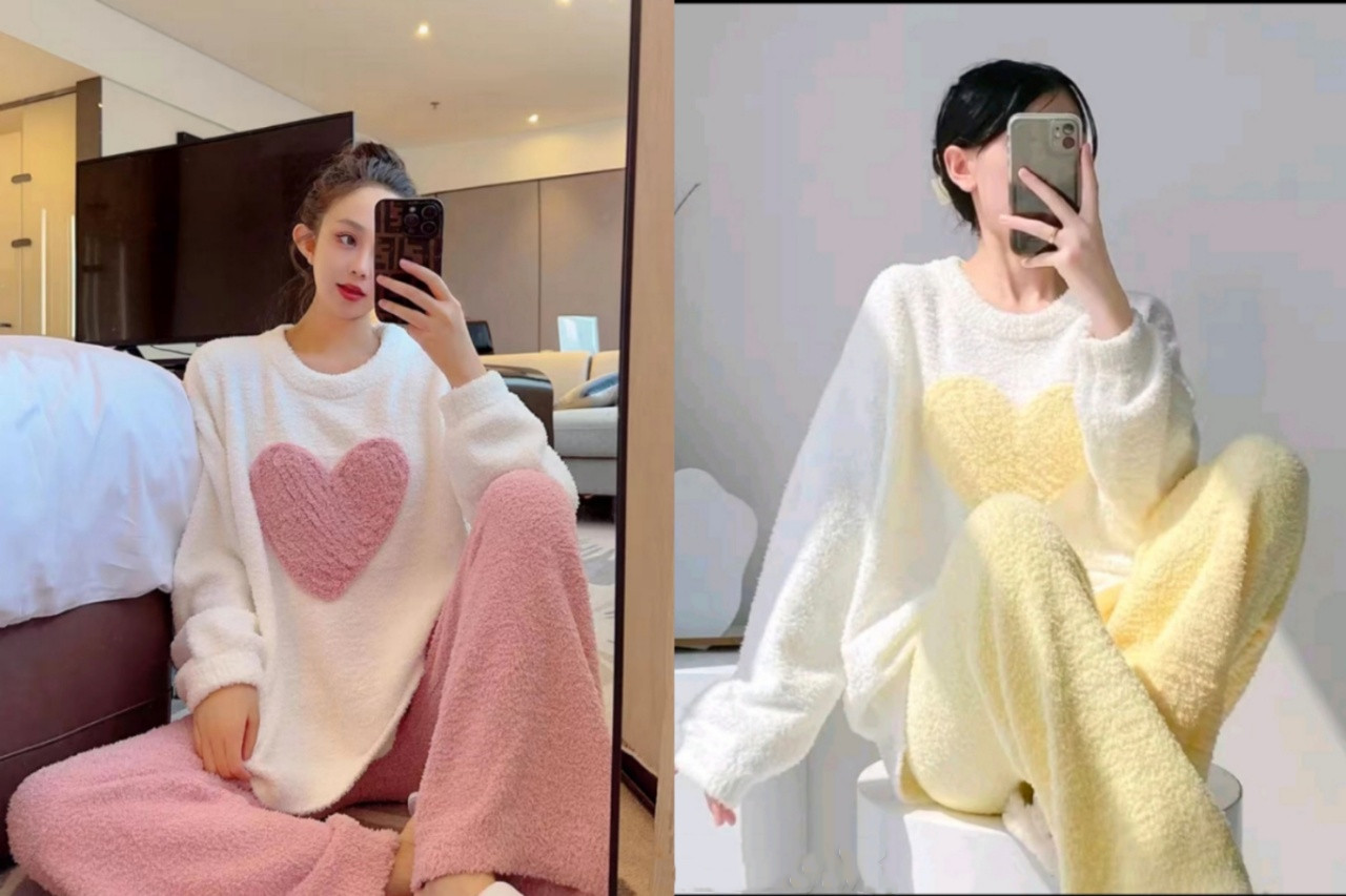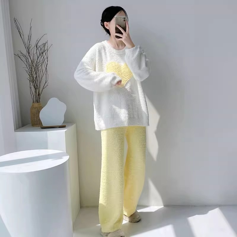 겨울 새로운 사랑 반쪽 벨벳 파자마 여성 느슨한 기모 따뜻한 달콤한 사랑스러운 스타일 홈 옷 투피스 세트