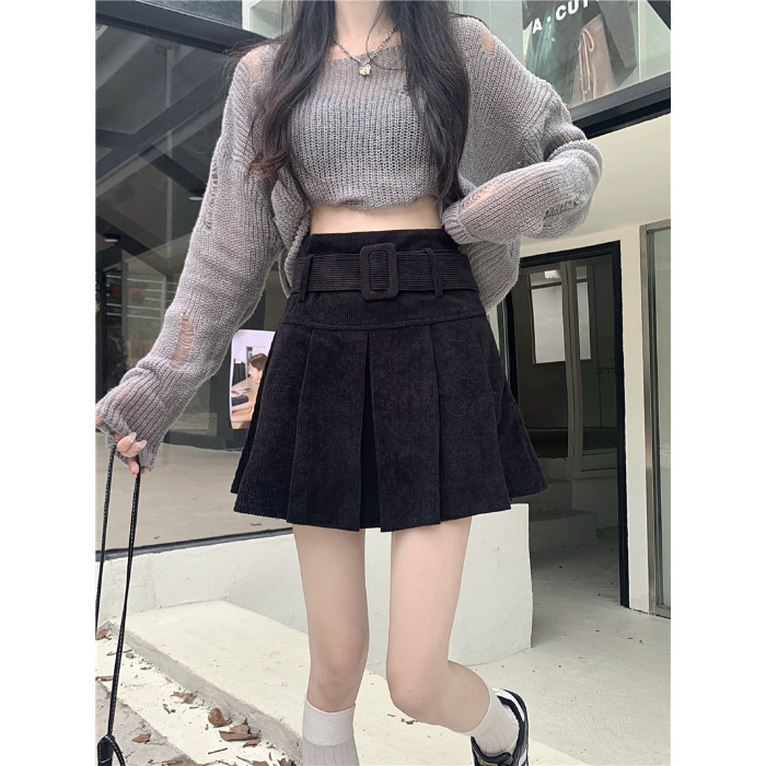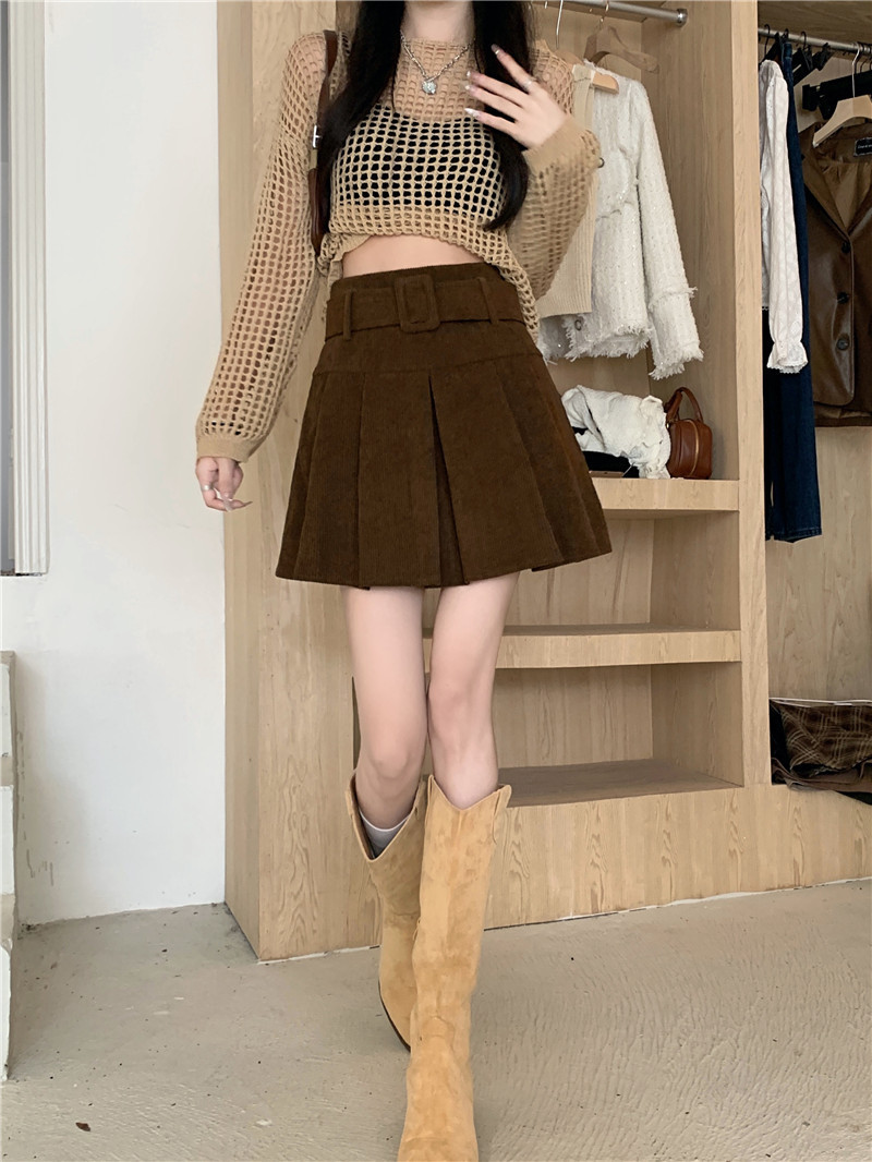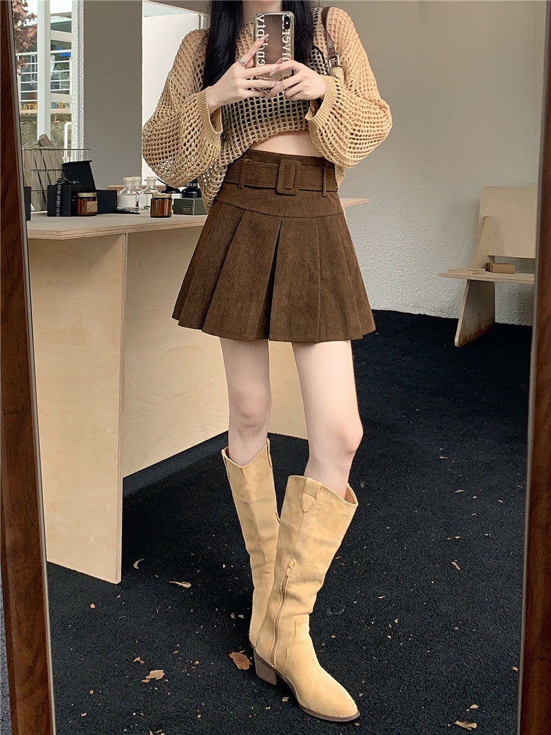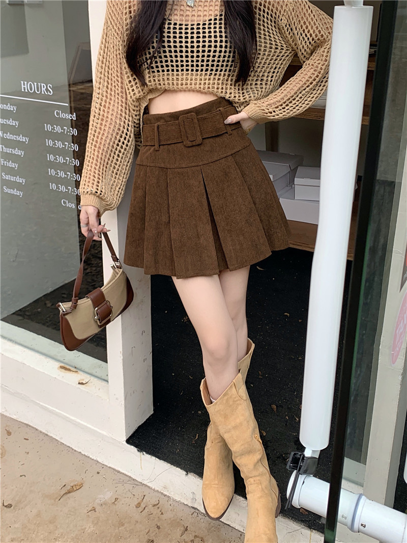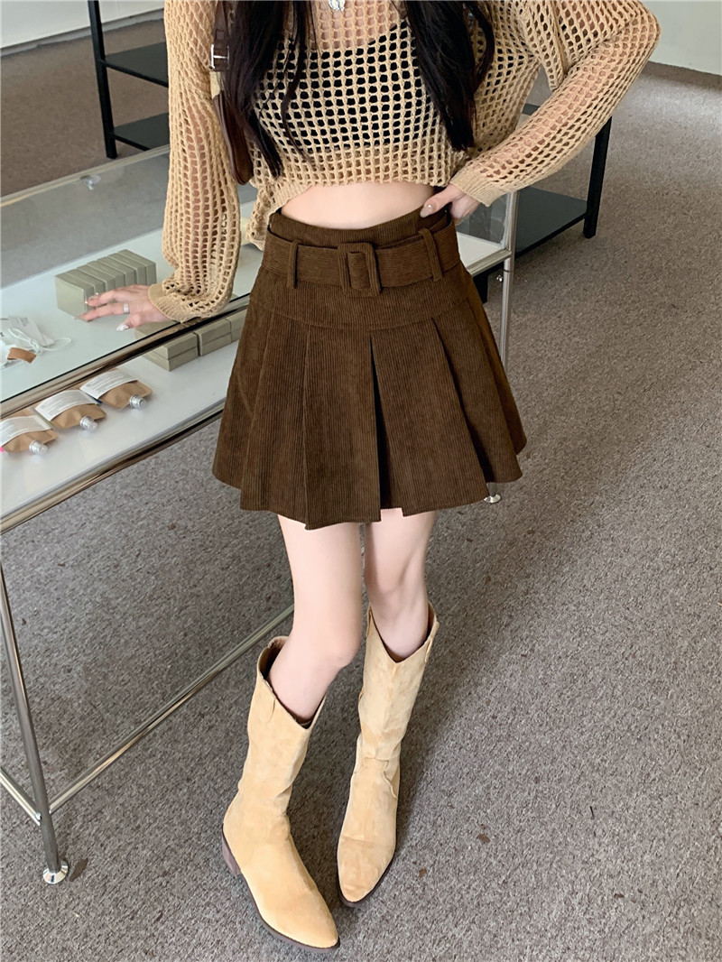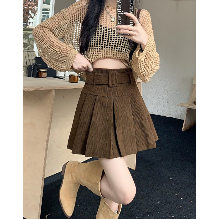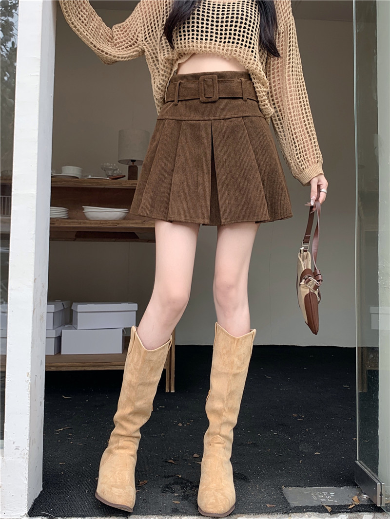크로스보더 여성용 봄가을 코듀로이 스커트 브라운 빅사이즈 통통한 여성용 하이웨이스트 컬리지 스타일 플리츠 스커트 슬림핏스토어 가기