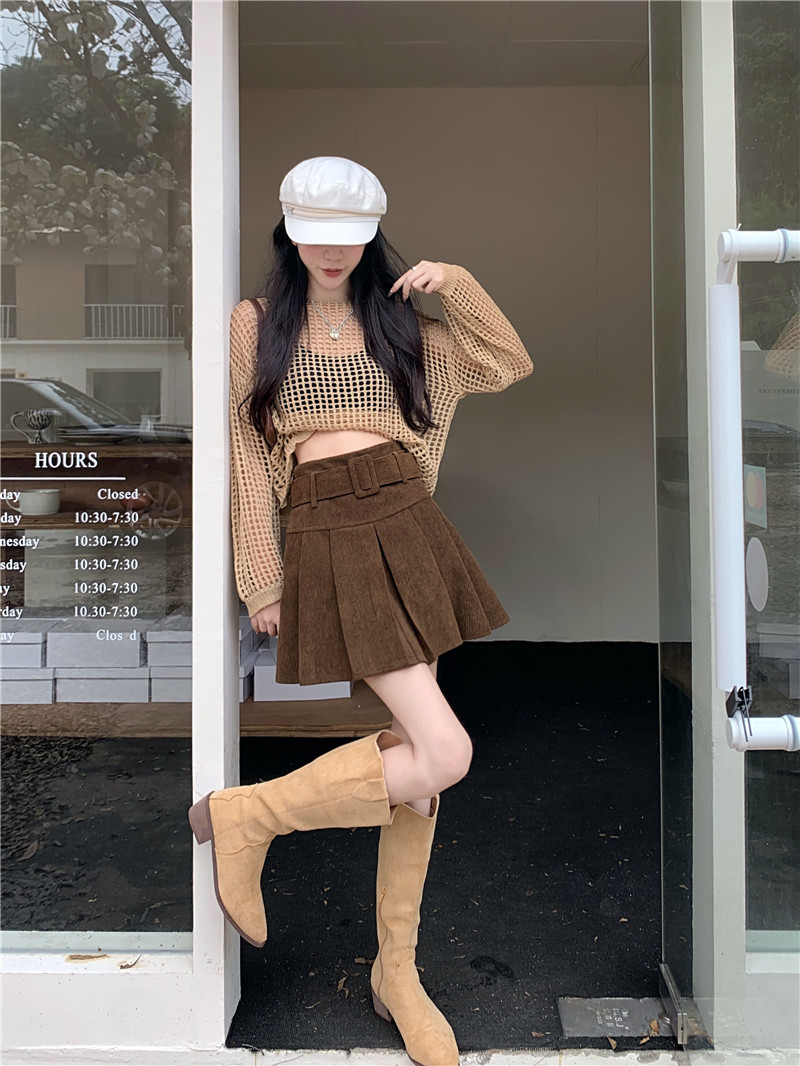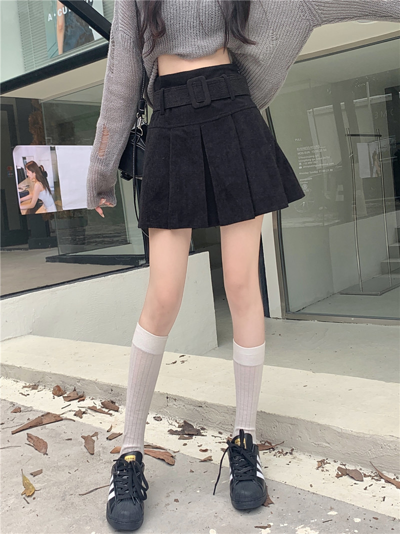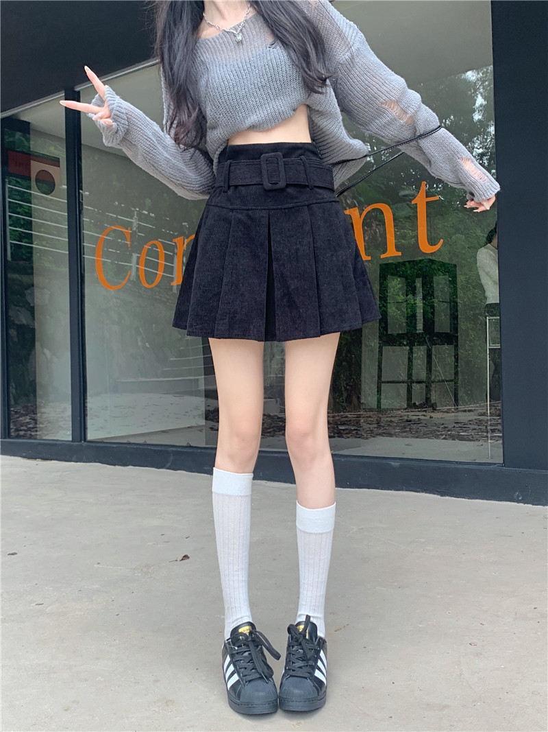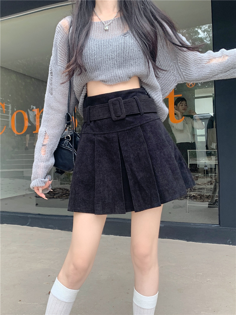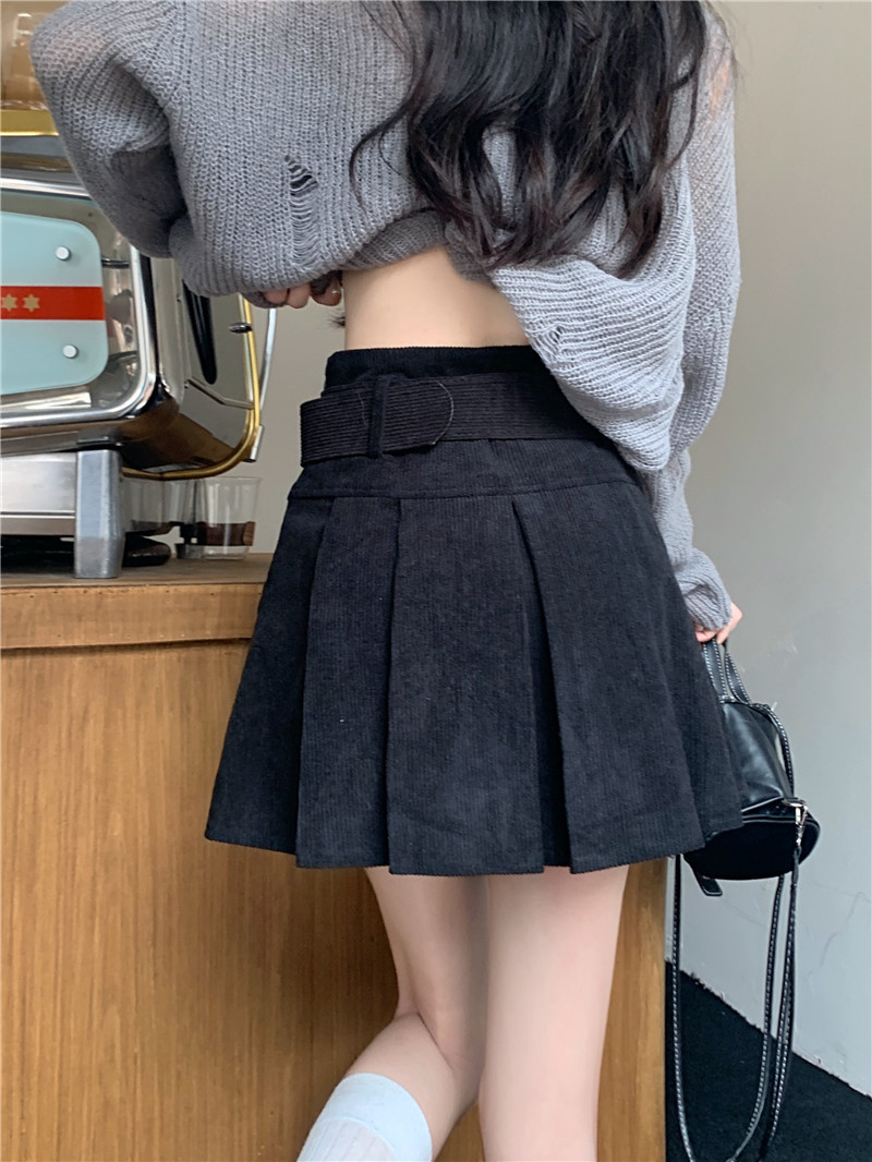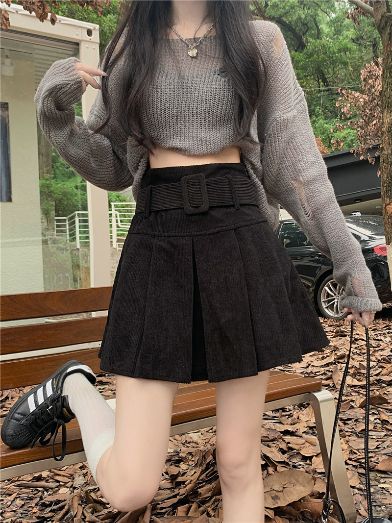 크로스보더 여성용 봄가을 코듀로이 스커트 브라운 빅사이즈 통통한 여성용 하이웨이스트 컬리지 스타일 플리츠 스커트 슬림핏스토어 가기