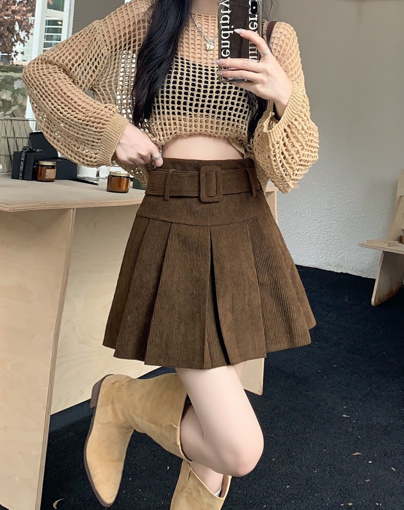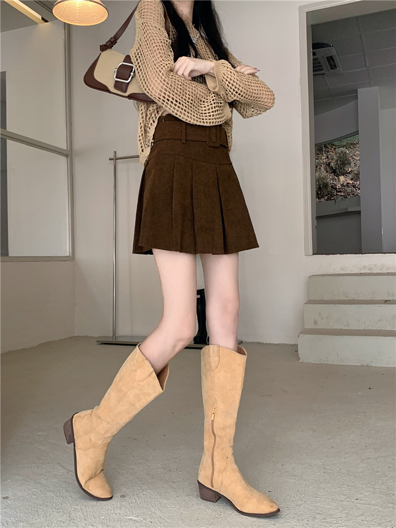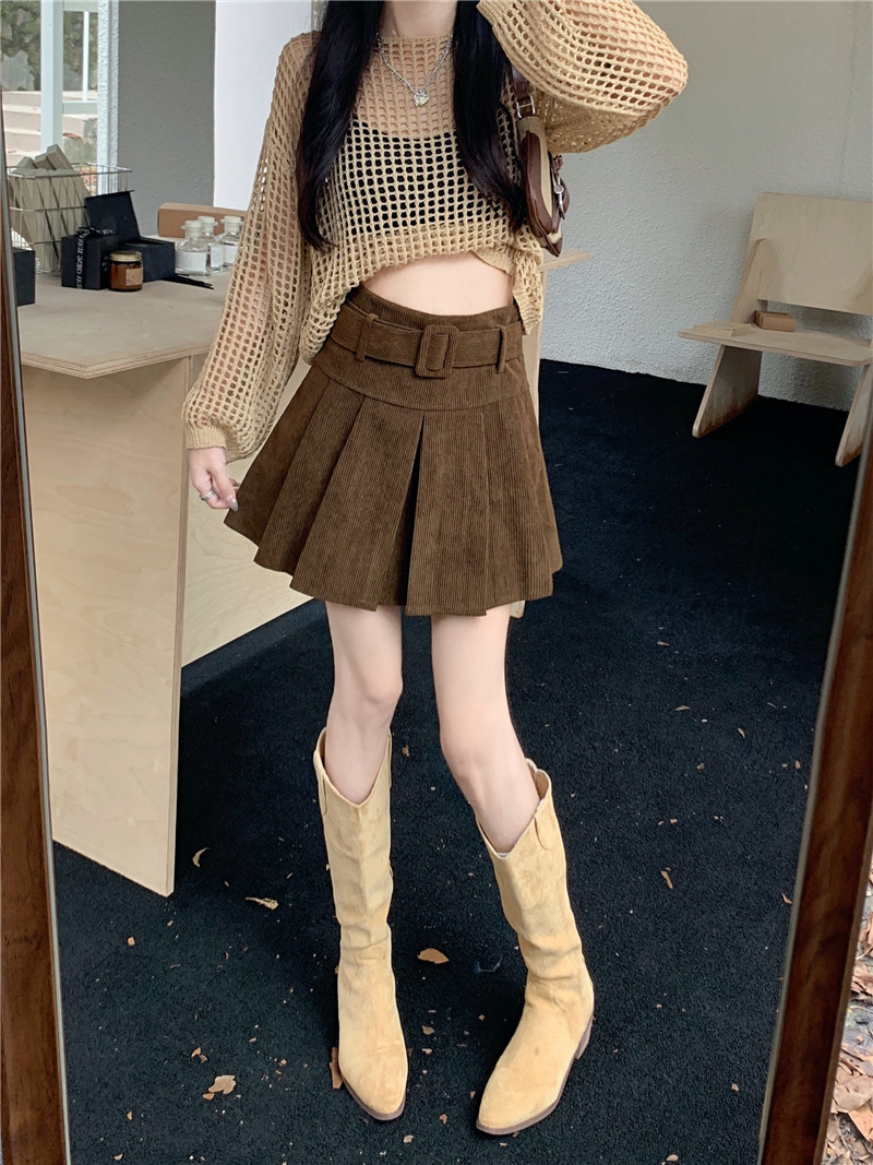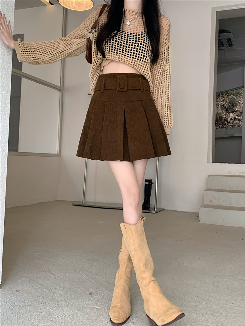 크로스보더 여성용 봄가을 코듀로이 스커트 브라운 빅사이즈 통통한 여성용 하이웨이스트 컬리지 스타일 플리츠 스커트 슬림핏