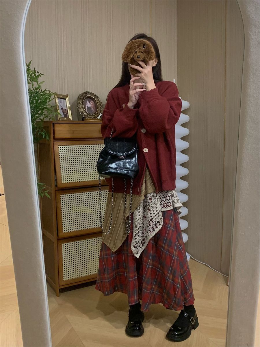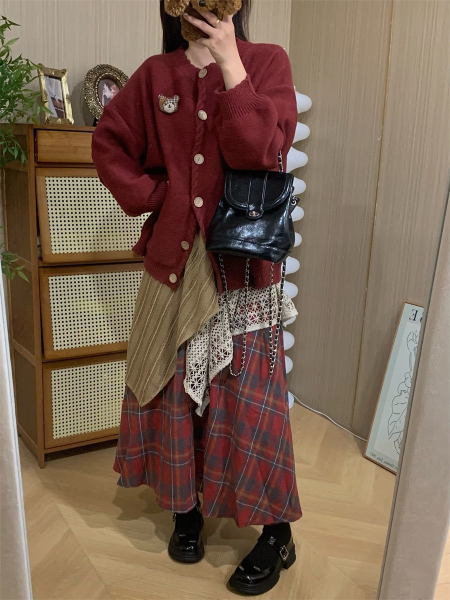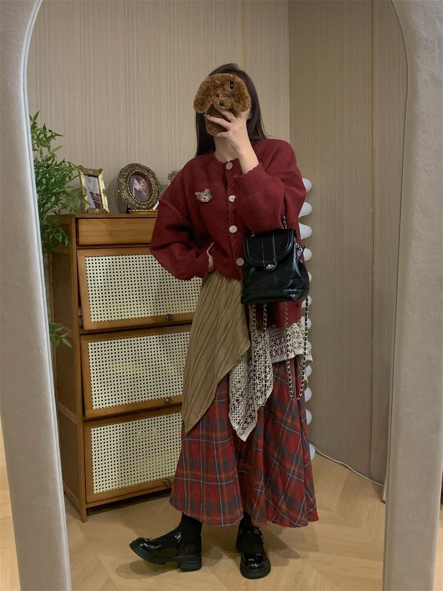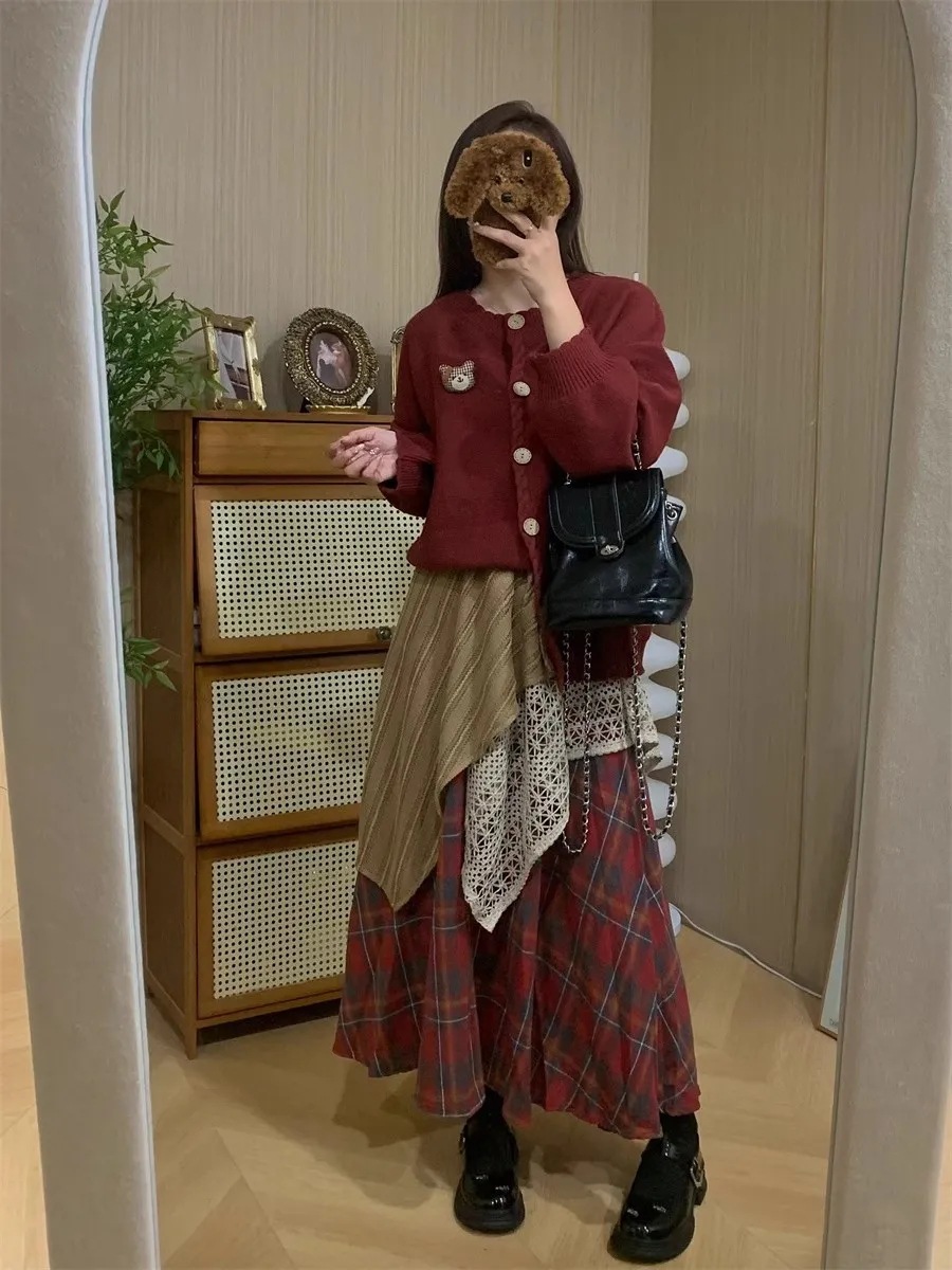 틈새 세트 게으른 스타일 빨간 스웨터 코트 여성 높은 허리 불규칙한 스티칭 격자 무늬 스커트 투피스 세트