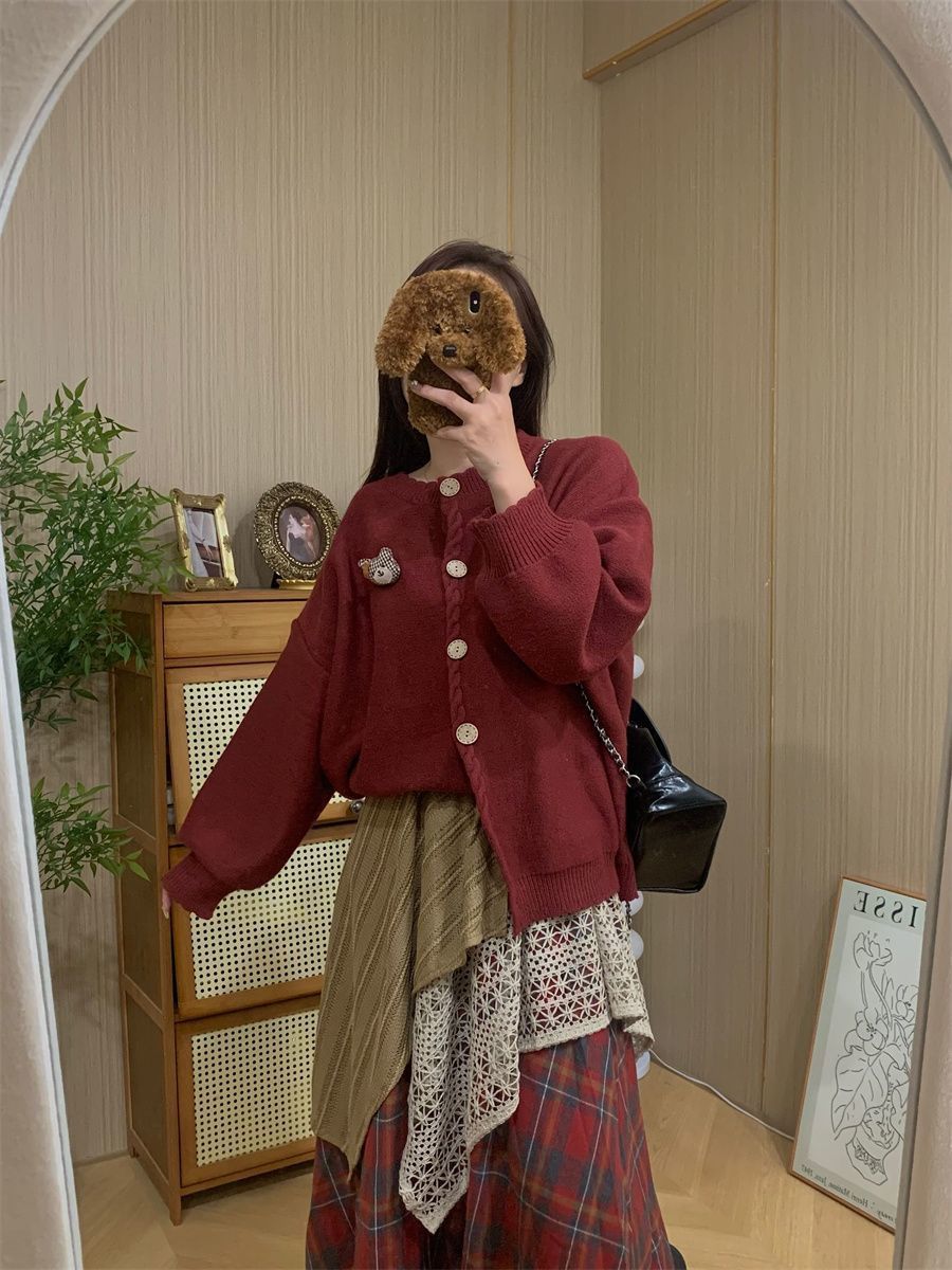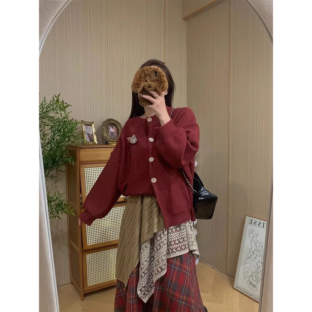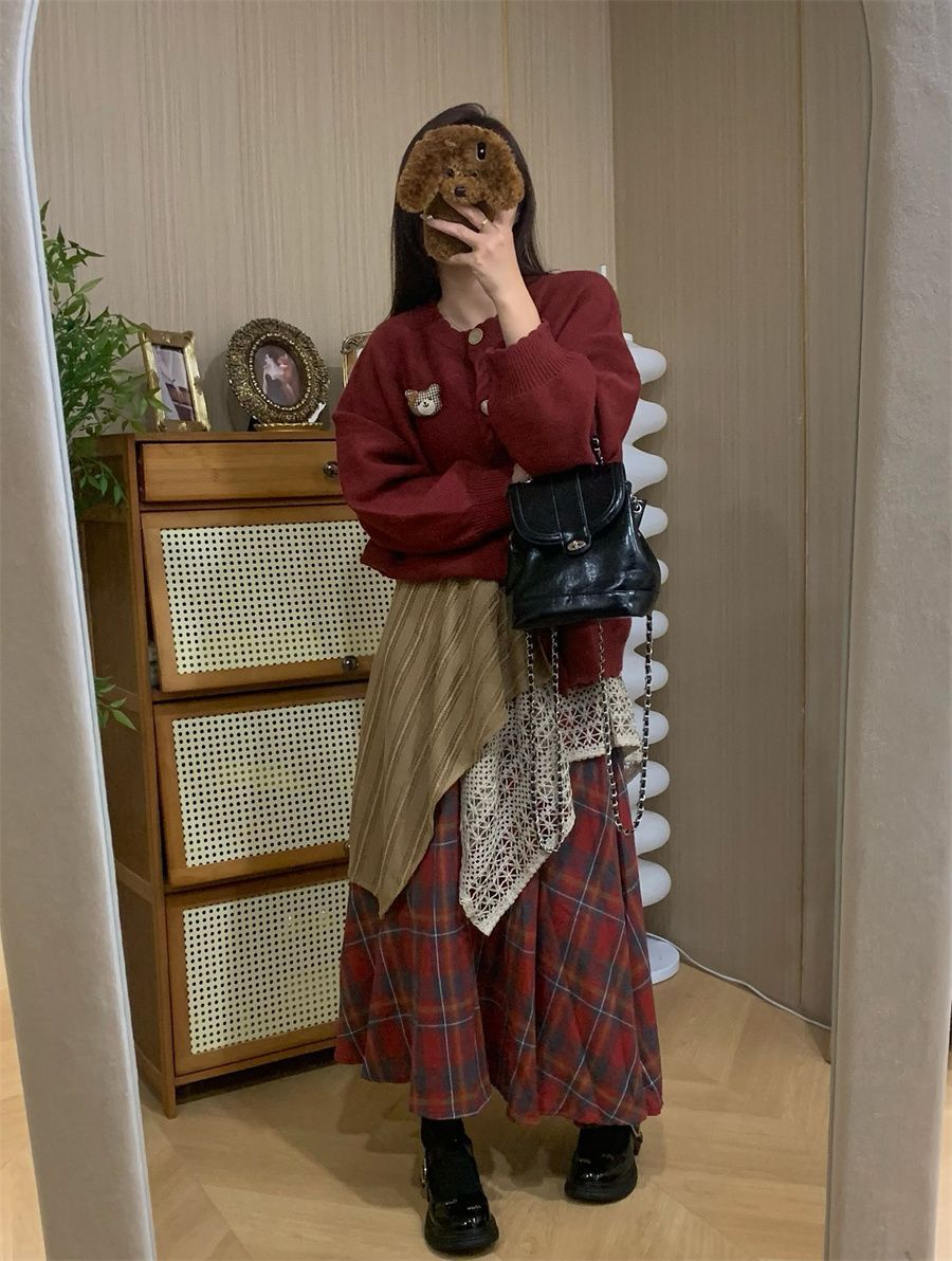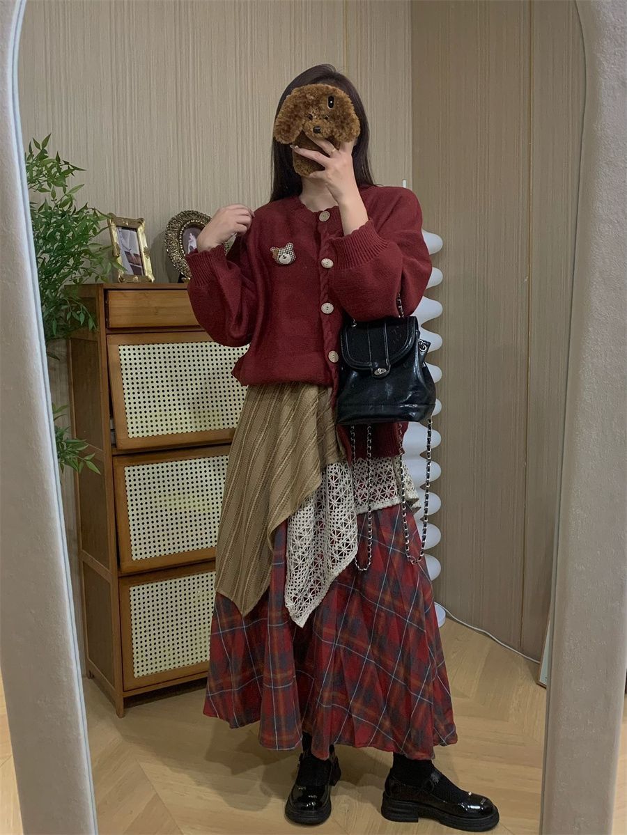 틈새 세트 게으른 스타일 빨간 스웨터 코트 여성 높은 허리 불규칙한 스티칭 격자 무늬 스커트 투피스 세트