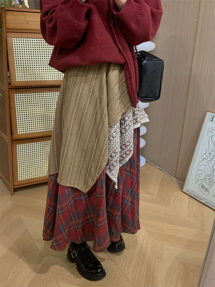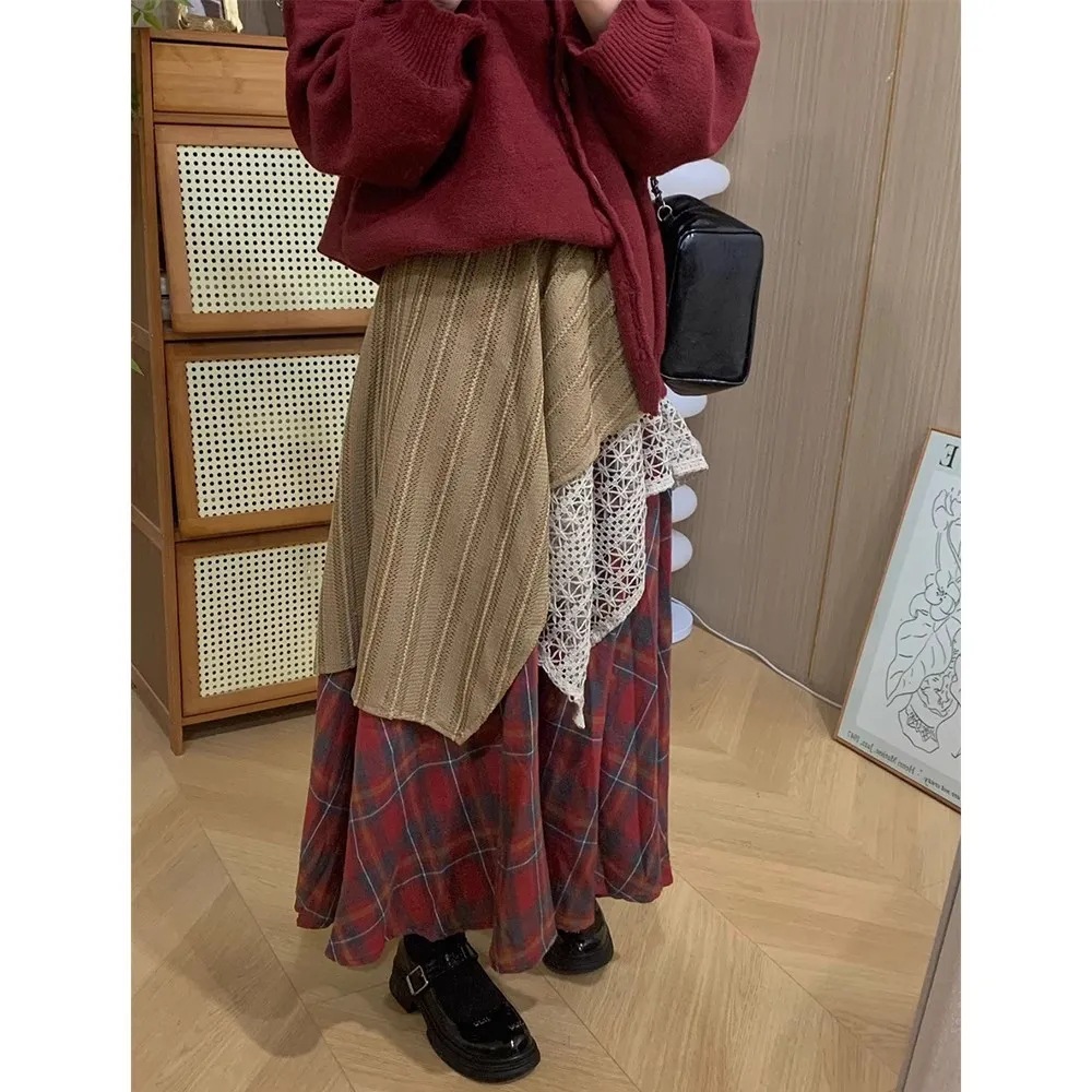 틈새 세트 게으른 스타일 빨간 스웨터 코트 여성 높은 허리 불규칙한 스티칭 격자 무늬 스커트 투피스 세트스토어 가기