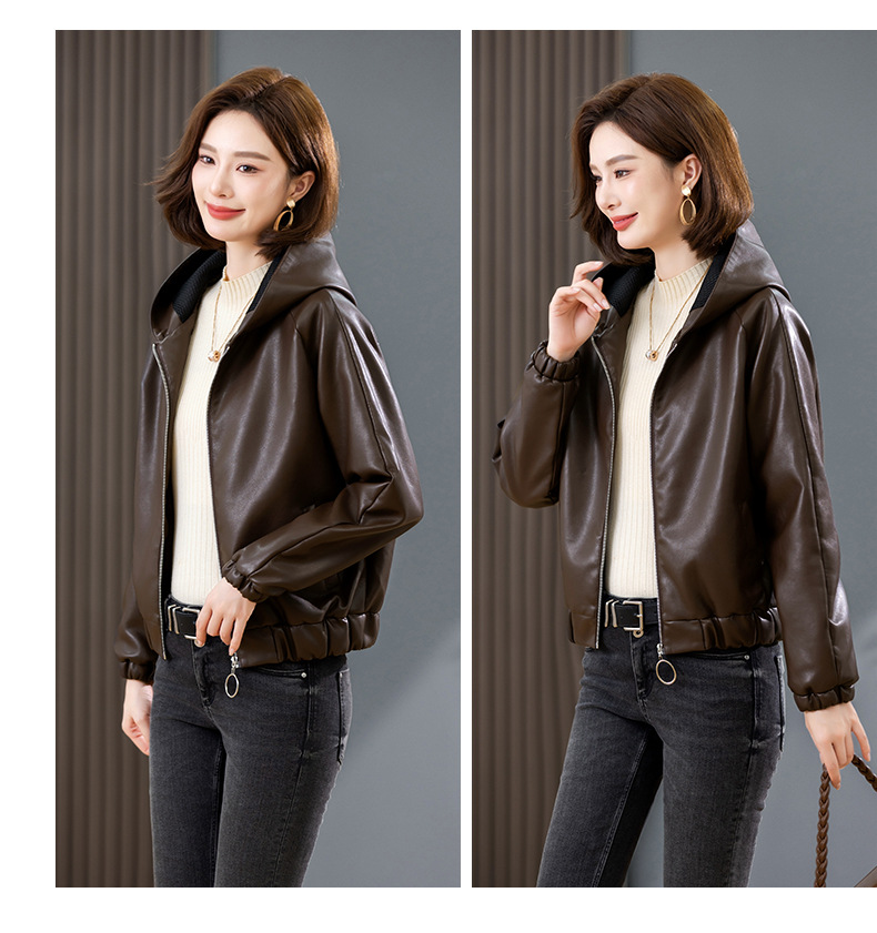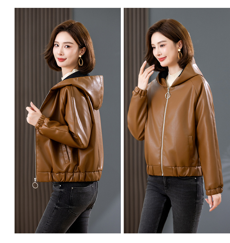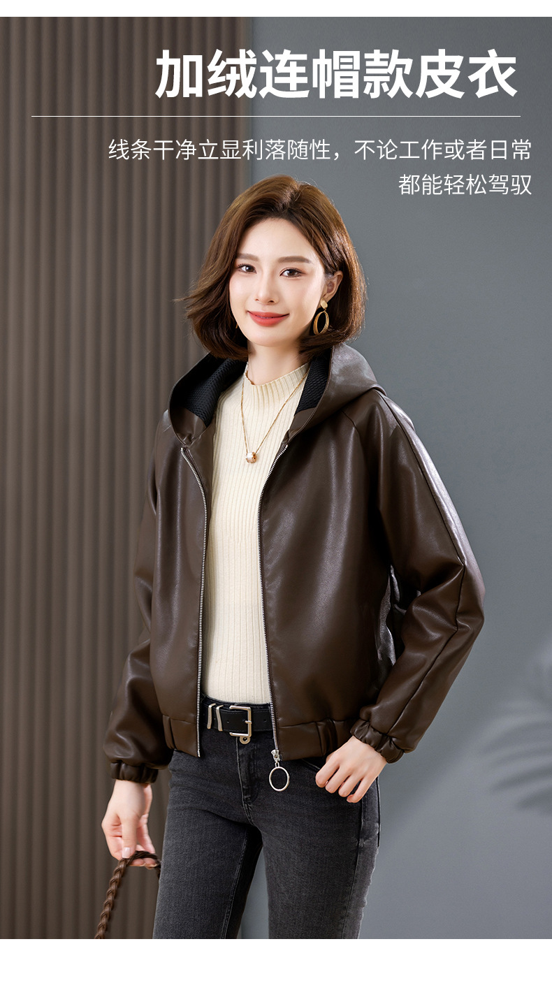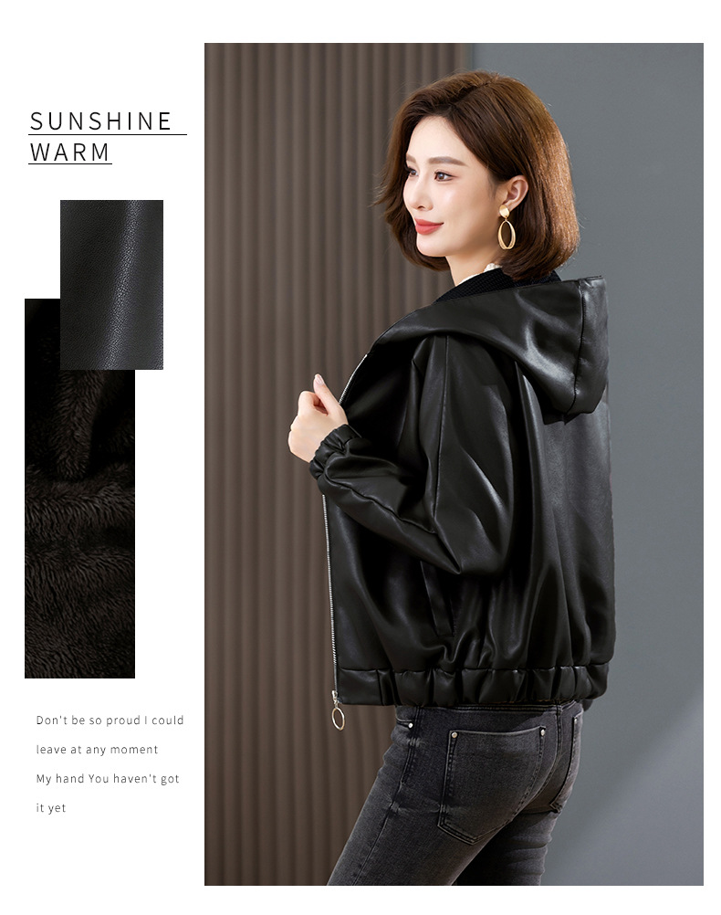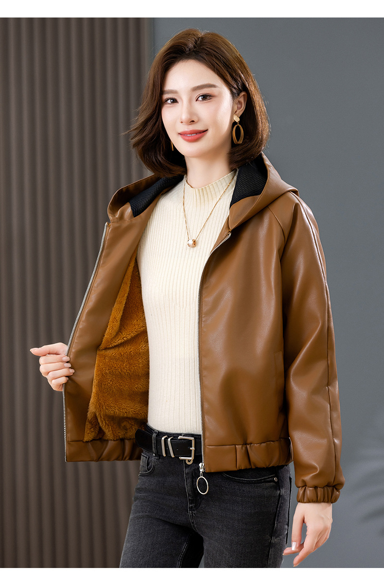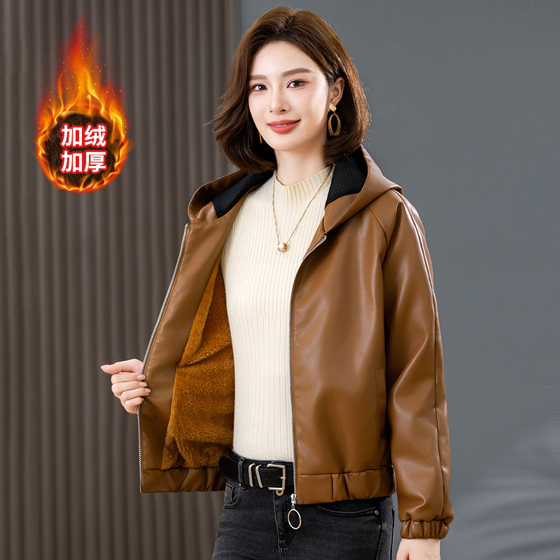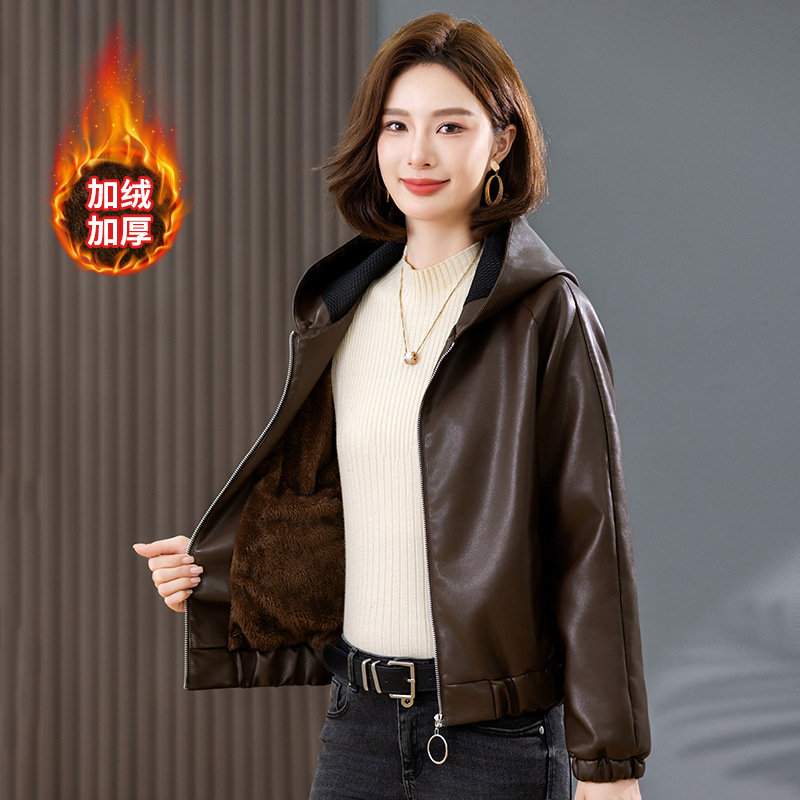 중년 어머니 기모 따뜻한 가죽 여성의 가을과 겨울 패션 짧은 느슨한 후드 가죽 자켓