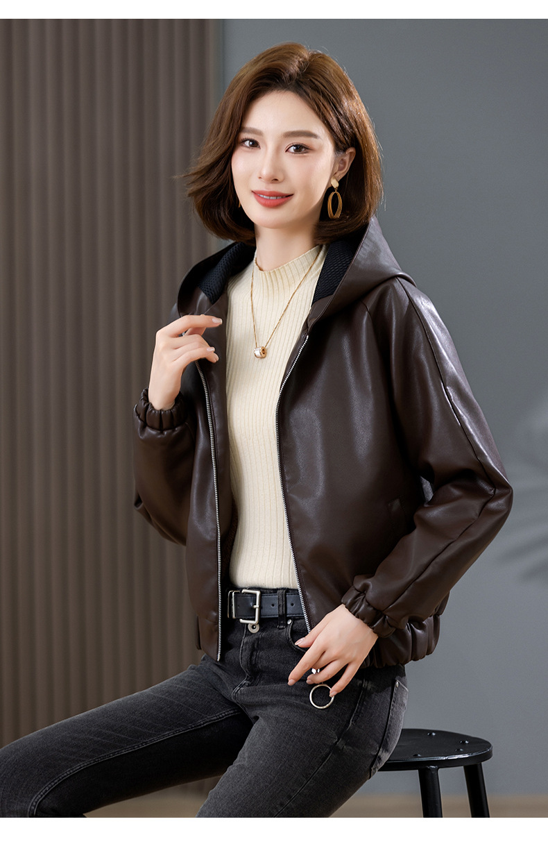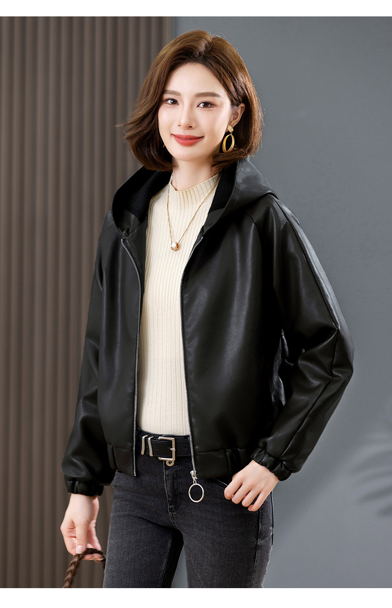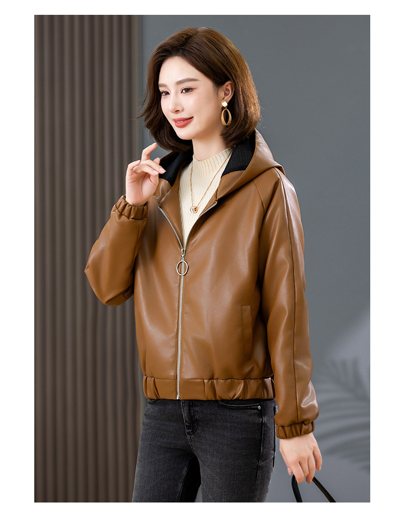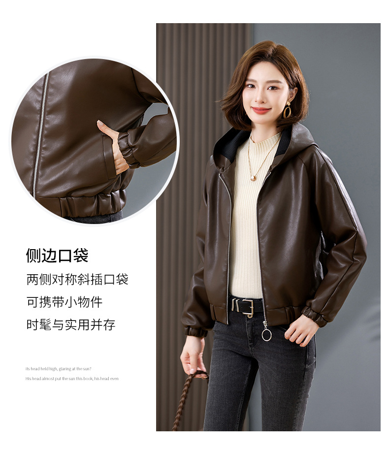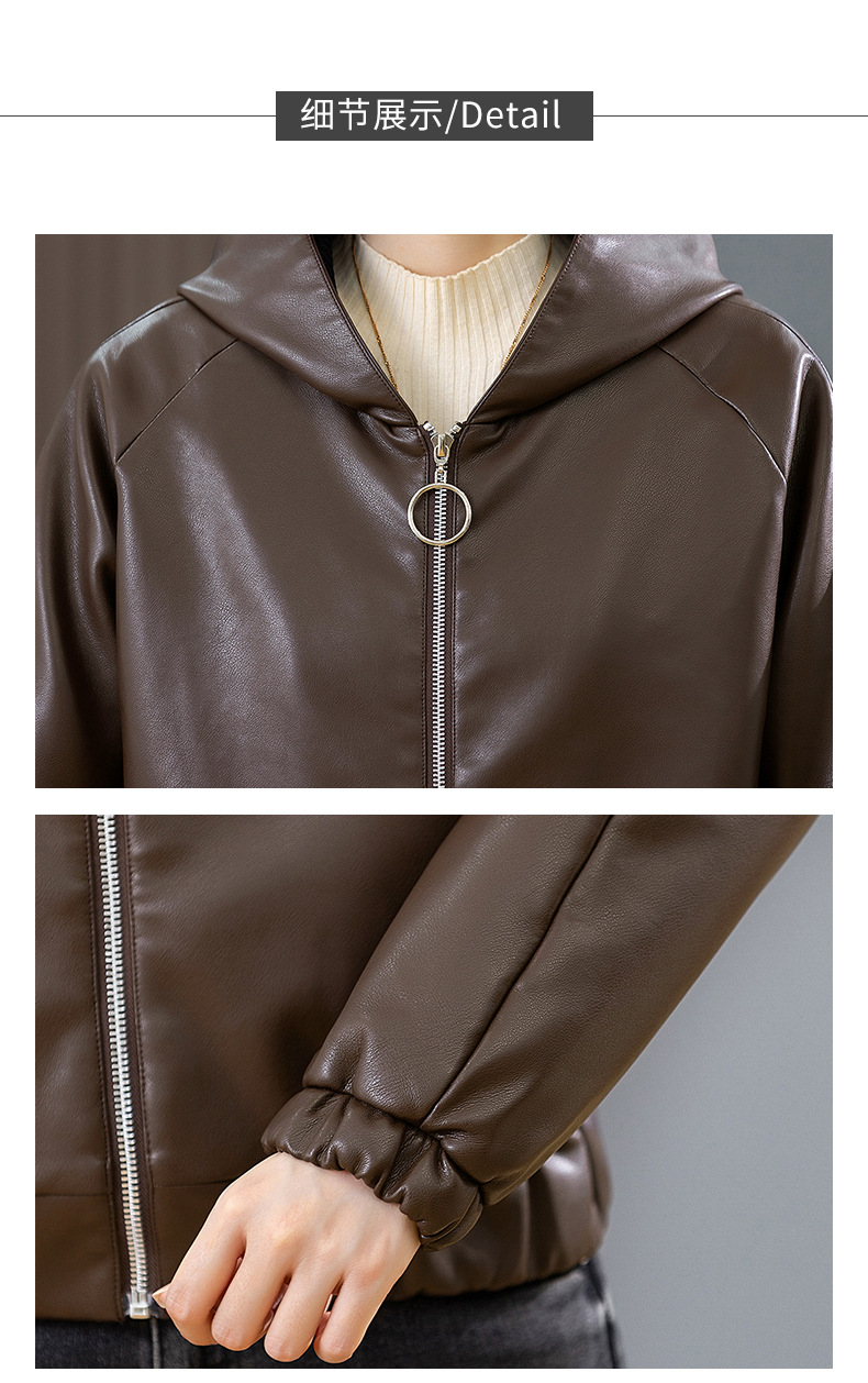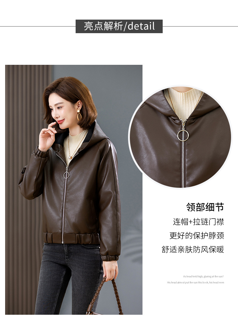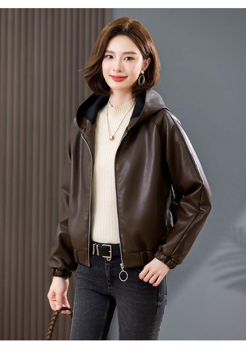 중년 어머니 기모 따뜻한 가죽 여성의 가을과 겨울 패션 짧은 느슨한 후드 가죽 자켓