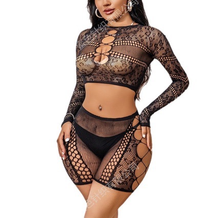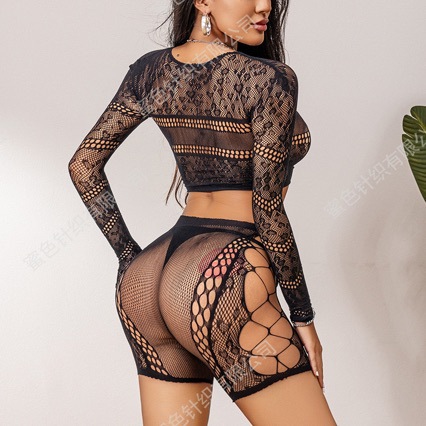 유럽과 미국 여성의 섹시한 란제리 분할 관점 가슴 빈 메쉬 옷 사이드 할로우 반바지 세트
