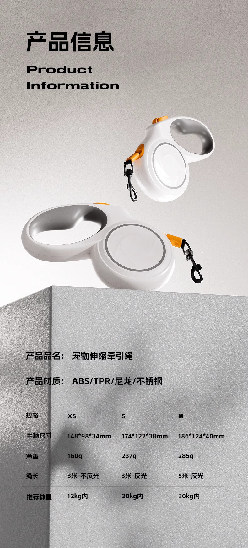• XS: 3M 로프 길이, 일반 무반사 로프, 12kg 미만의 개에게 권장