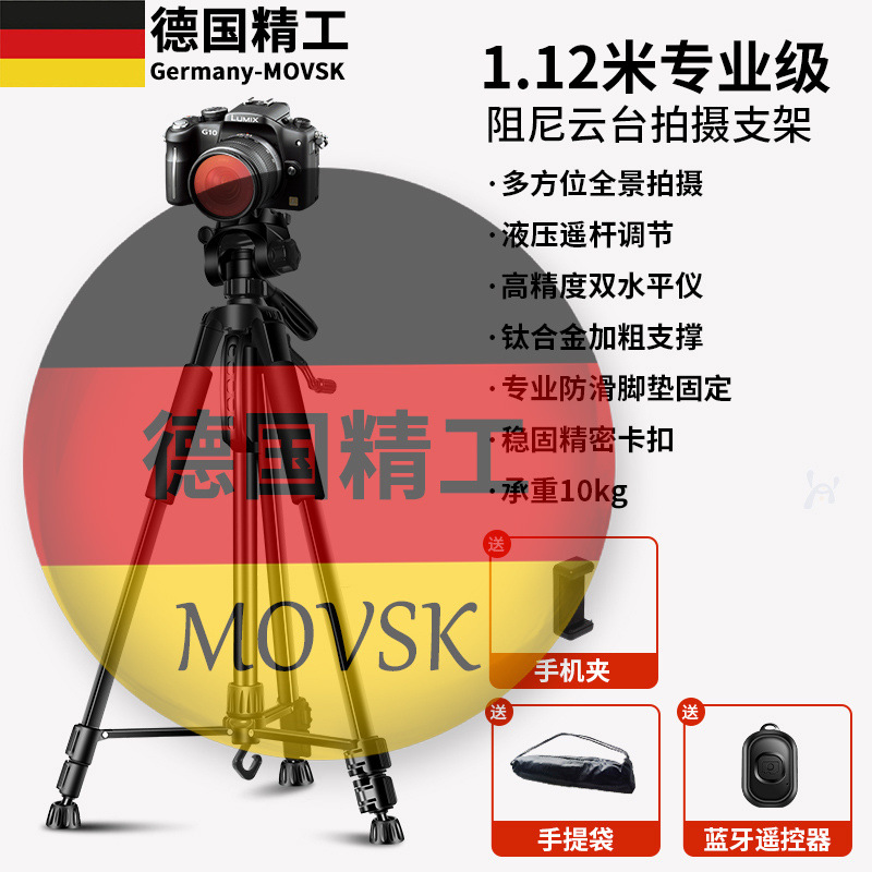 • 업그레이드된 삼각대 [ 1.12m 볼드 합금] 카메라 및 휴대폰용 범용 - 독일에서 엄선됨 [댐핑 짐벌 + 회전 휴대폰 클립 + 블루투스 리모컨]