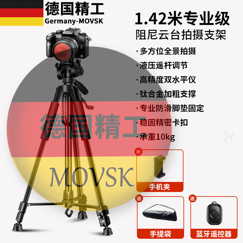 • 업그레이드된 삼각대 [ 1.42m 볼드 합금] 카메라 및 휴대폰용 범용 - 독일에서 엄선됨 [댐핑 짐벌 + 회전 휴대폰 클립 + 블루투스 리모컨]