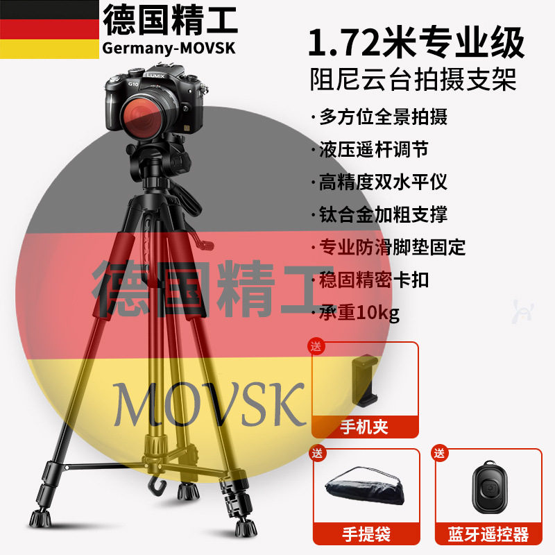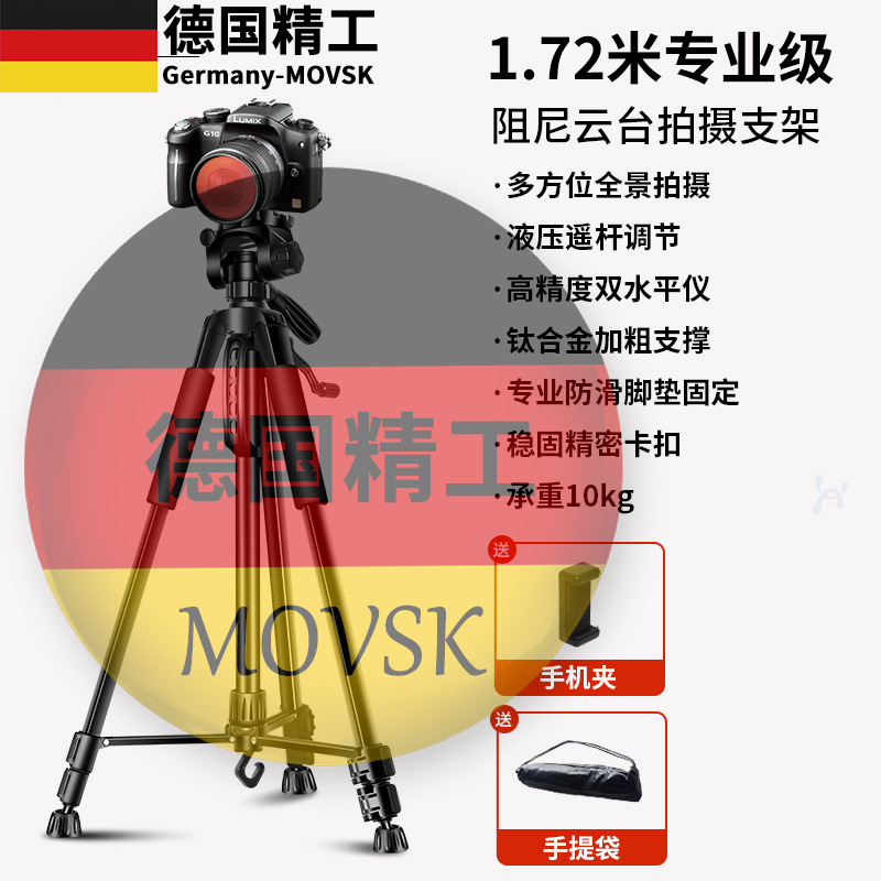 • 흔들림 방지 삼각대 [ 1.72m 두꺼운 탄소강] 카메라 및 휴대폰용 범용 - 독일에서 엄선됨 [댐핑 짐벌 + 회전 휴대폰 클립]
