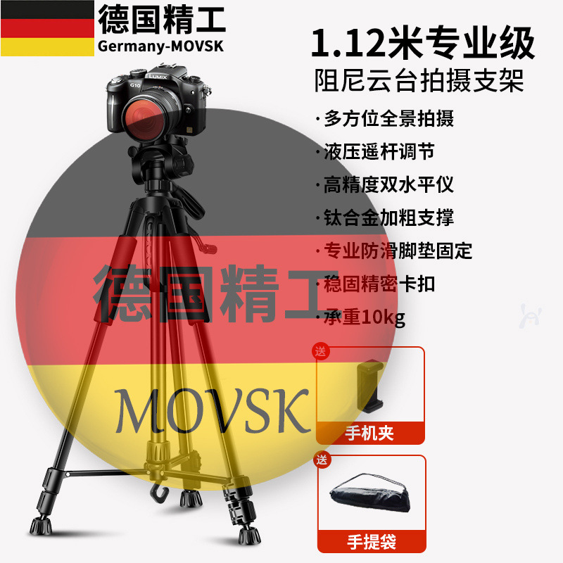 • 업그레이드된 삼각대 [ 1.12m 볼드 합금] 카메라와 휴대폰용 범용 - 독일에서 엄선한 [댐핑 짐벌 + 회전 휴대폰 클립]