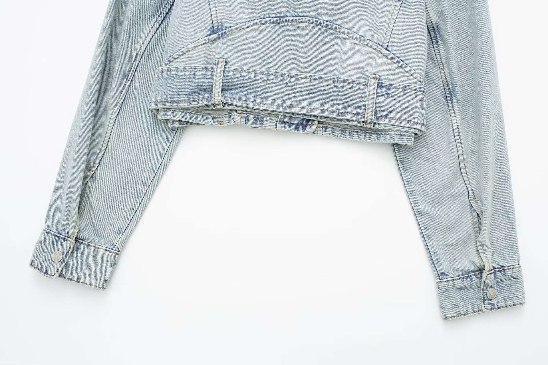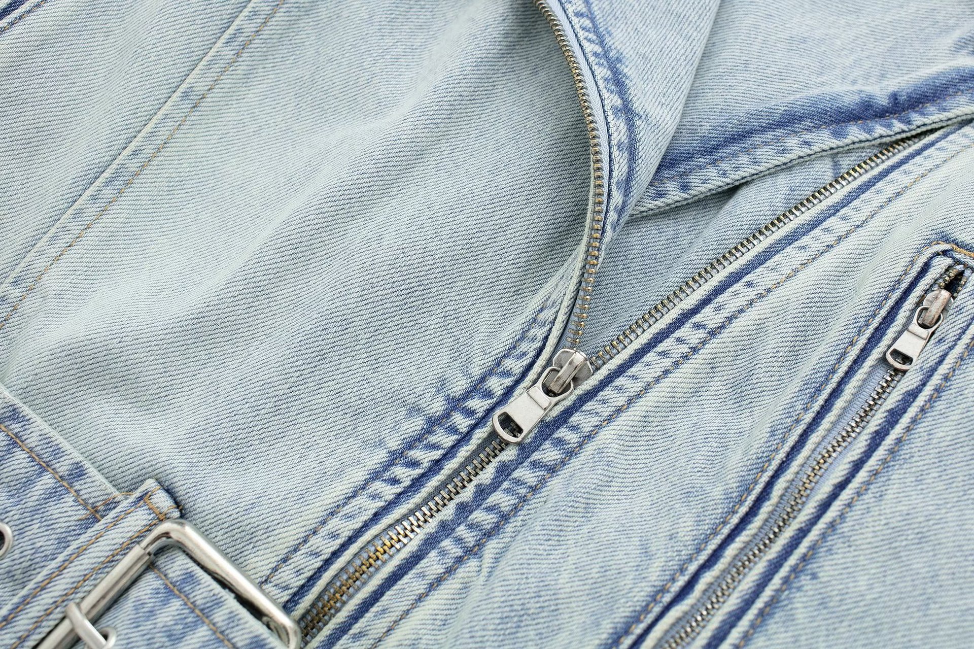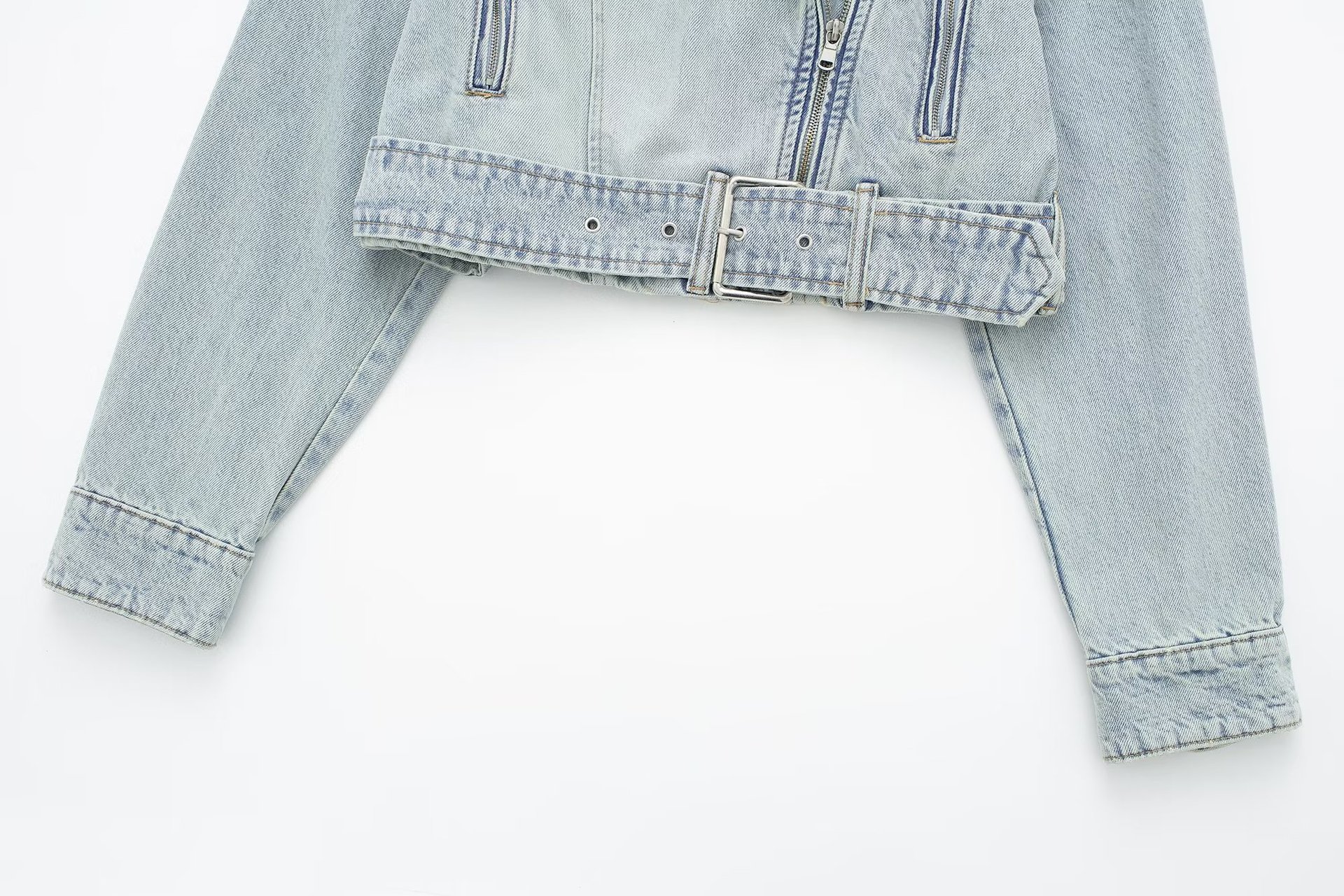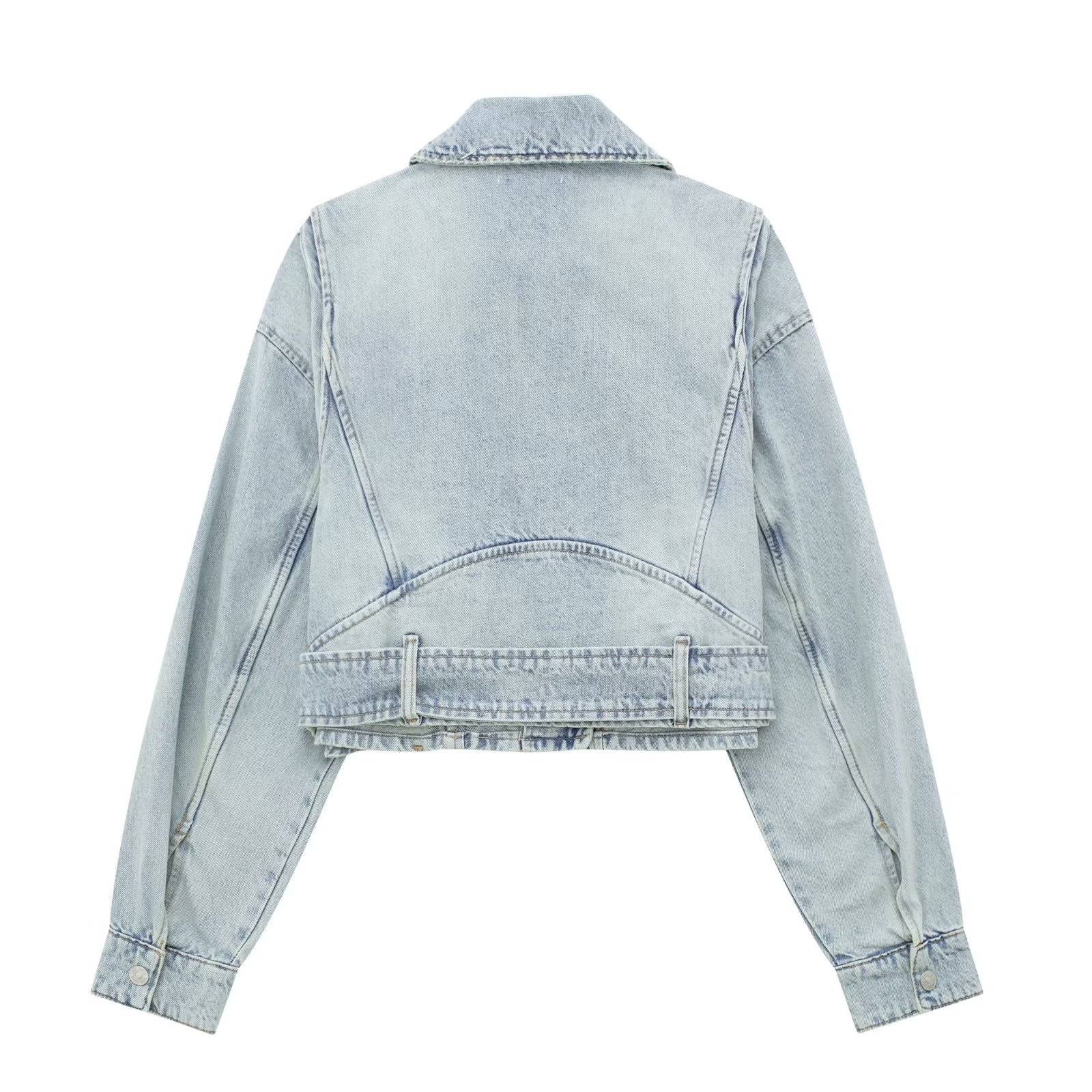 유럽과 미국 여성의 이른 가을 새로운 유행 우아한 짧은 벨트 라이트 블루 데님 재킷 코트