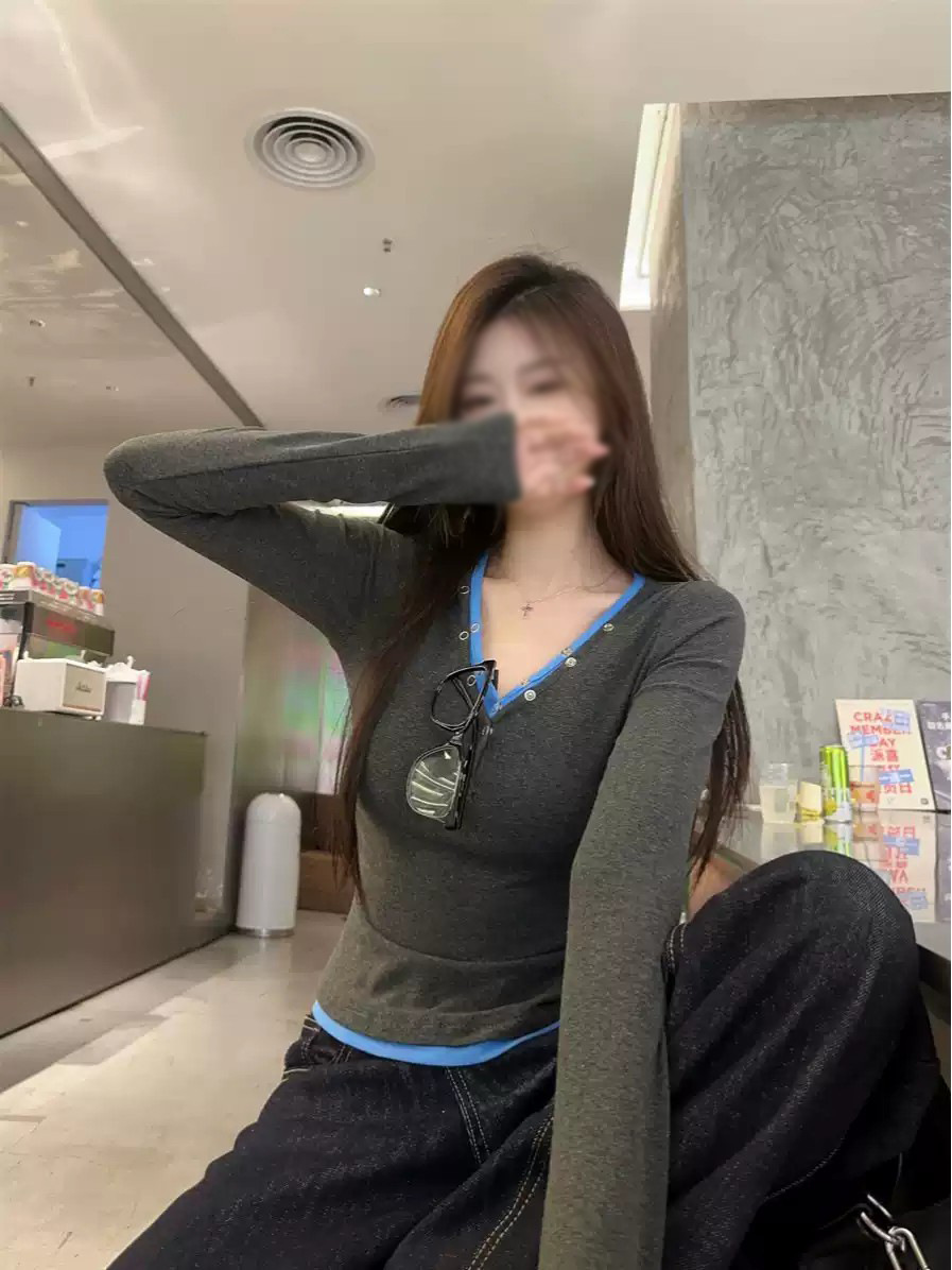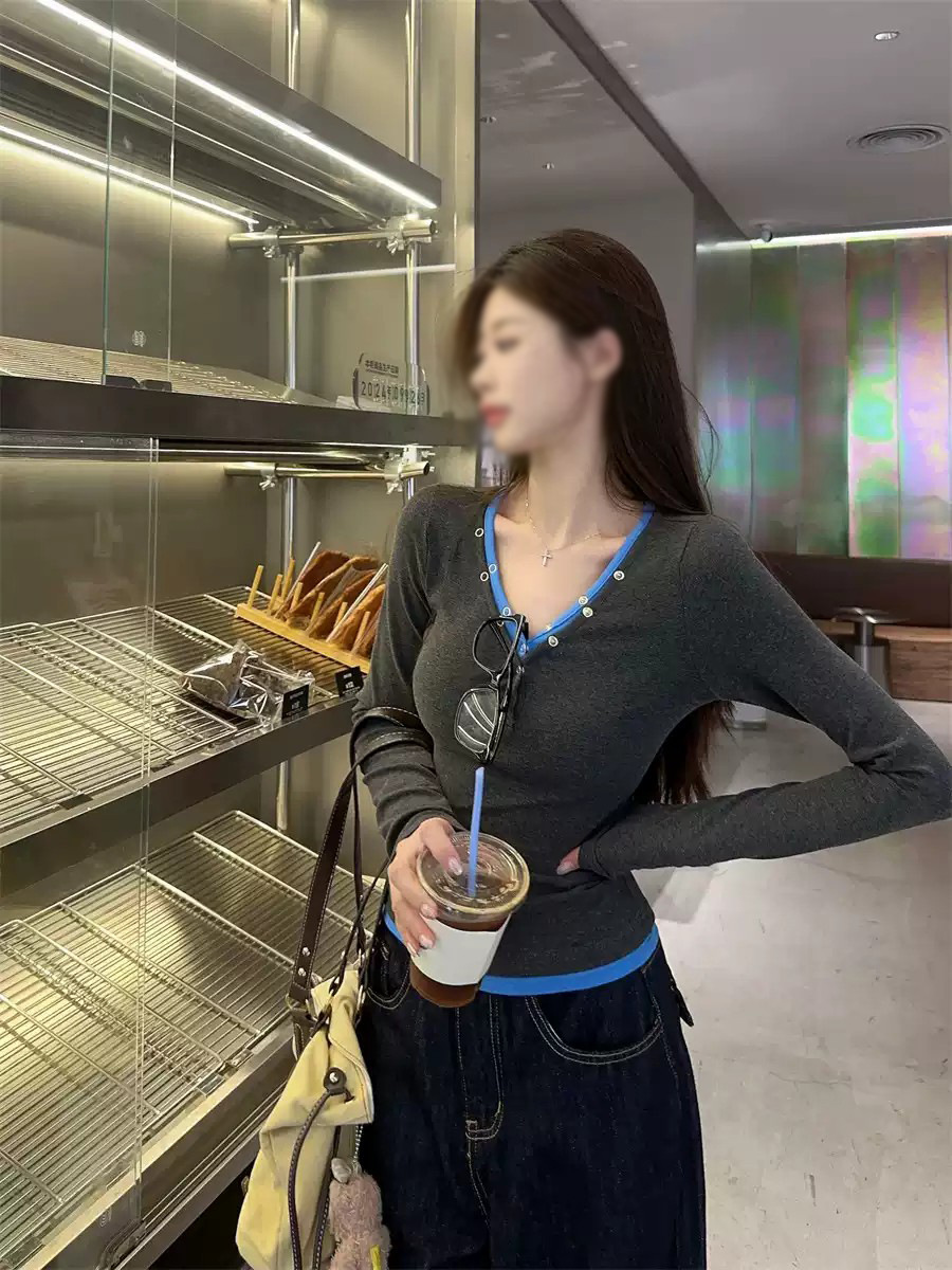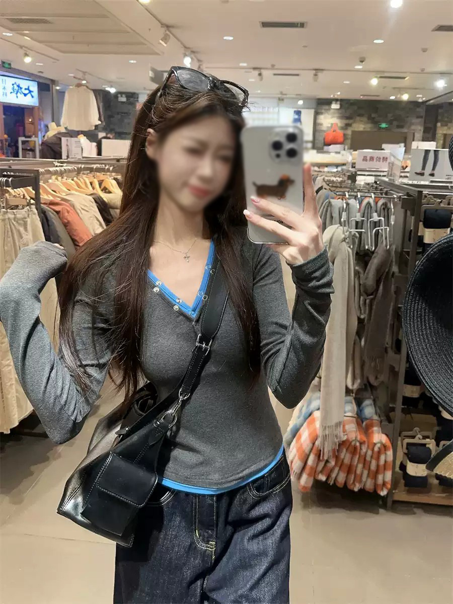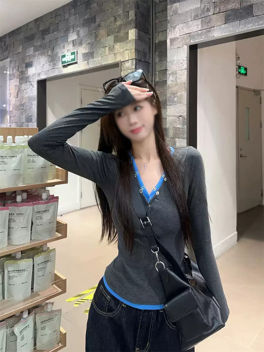 재고 가짜 2 피스 V-Neck 버튼 긴팔 티셔츠 여성용 가을 회색베이스 셔츠 디자인 센스 슬림 핏 내부 탑스토어 가기