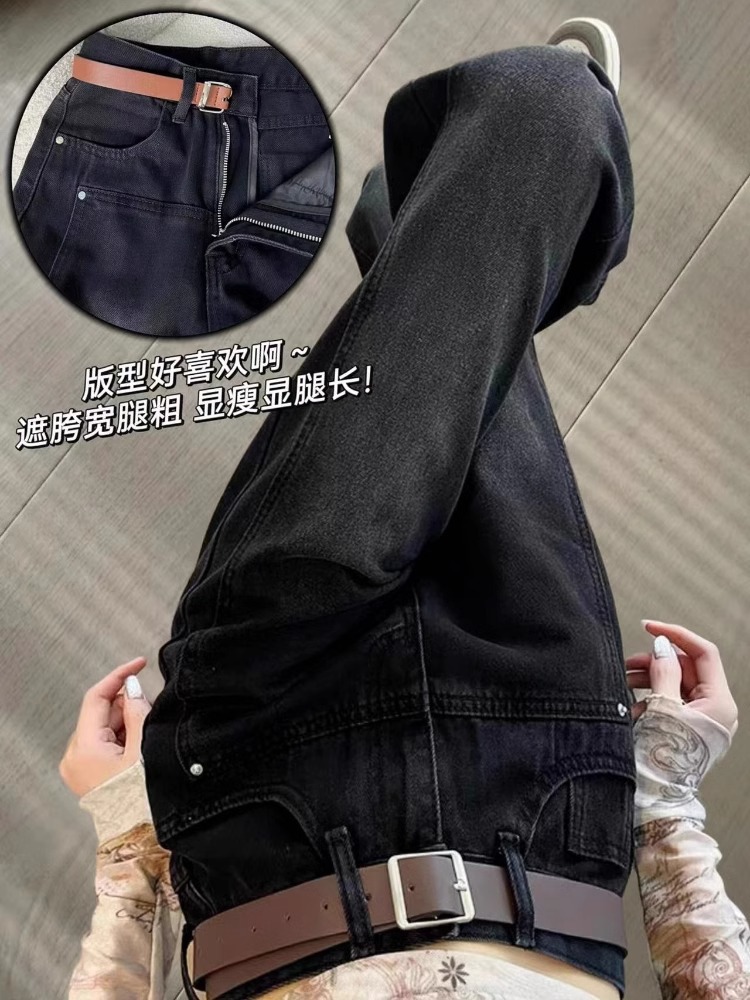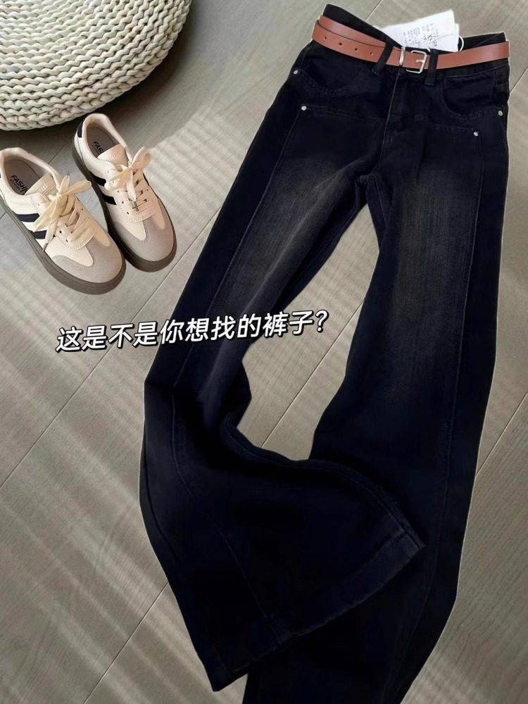 가을 겨울 여성용 빅사이즈 블랙 와이드 레그 청바지, 벨벳과 두꺼운 지방 mm 바닥 길이 바지, 배 모양 바디 스트레이트 팬츠스토어 가기