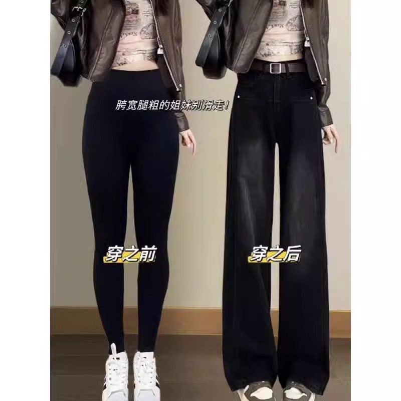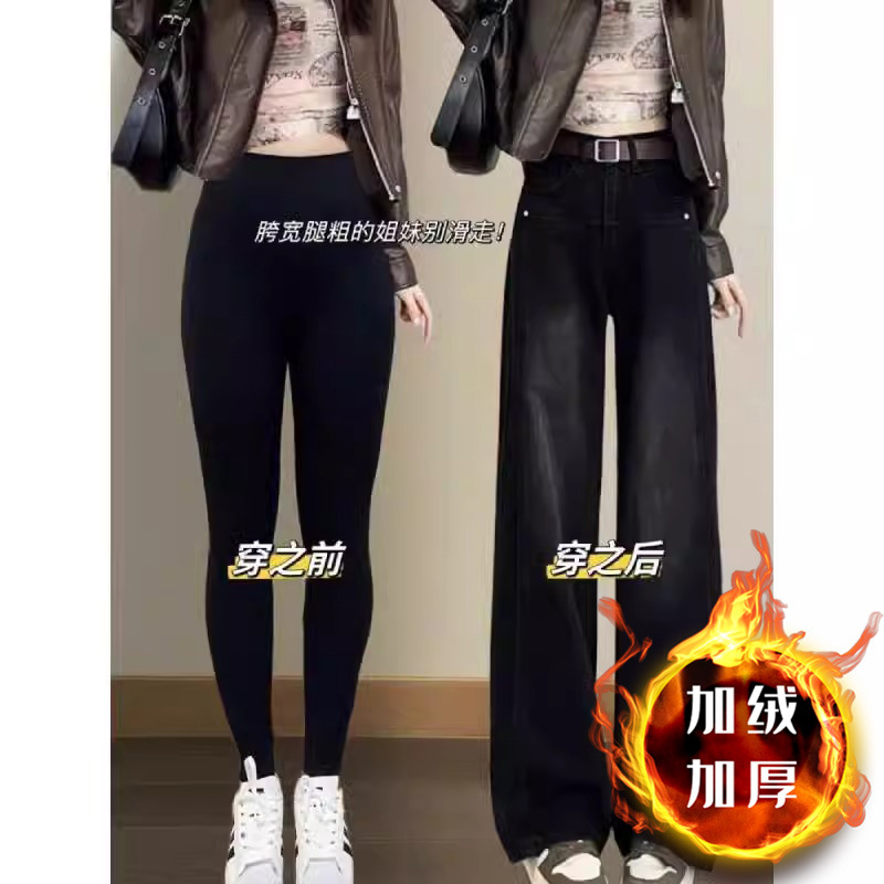 가을 겨울 여성용 빅사이즈 블랙 와이드 레그 청바지, 벨벳과 두꺼운 지방 mm 바닥 길이 바지, 배 모양 바디 스트레이트 팬츠