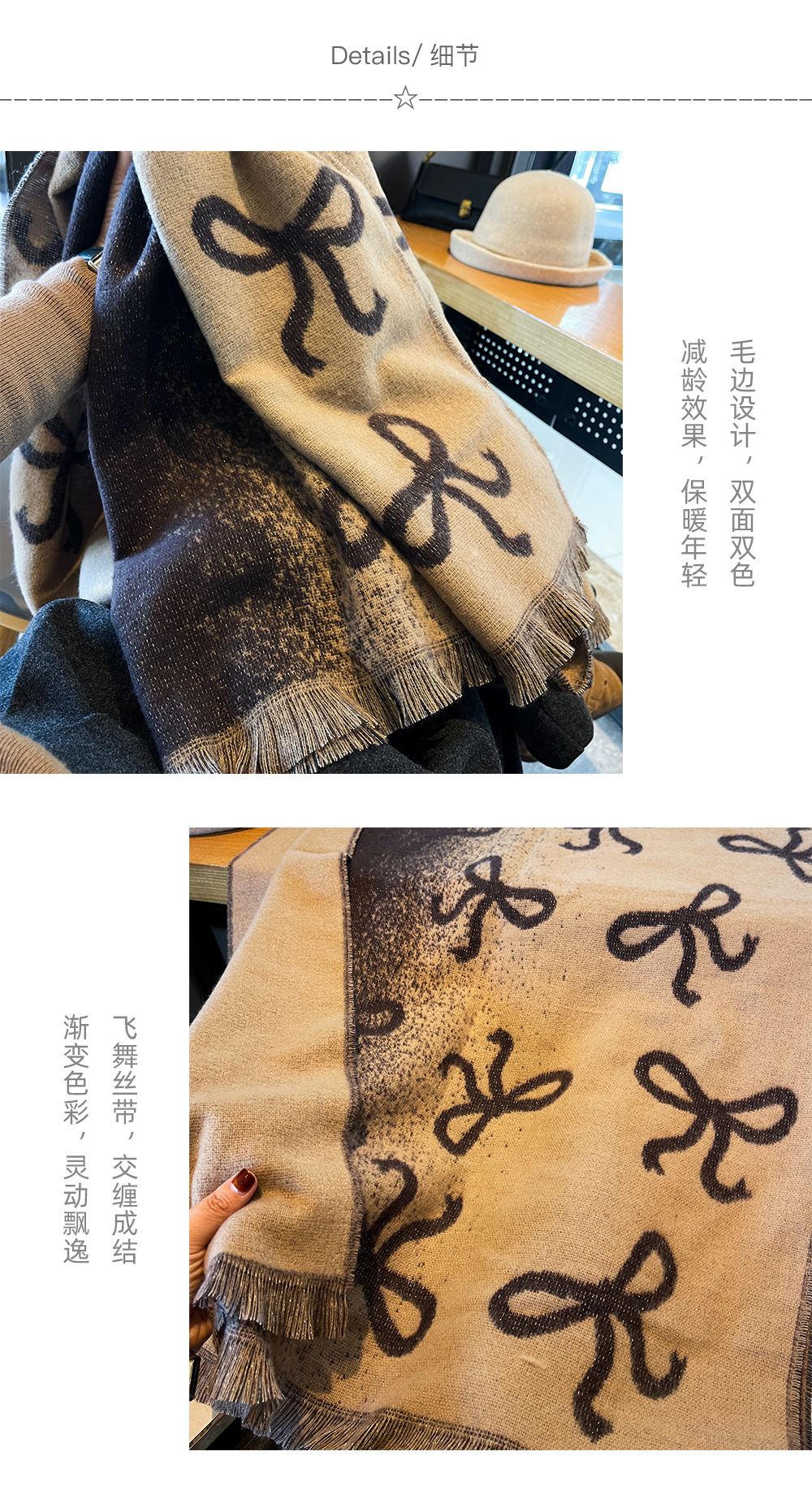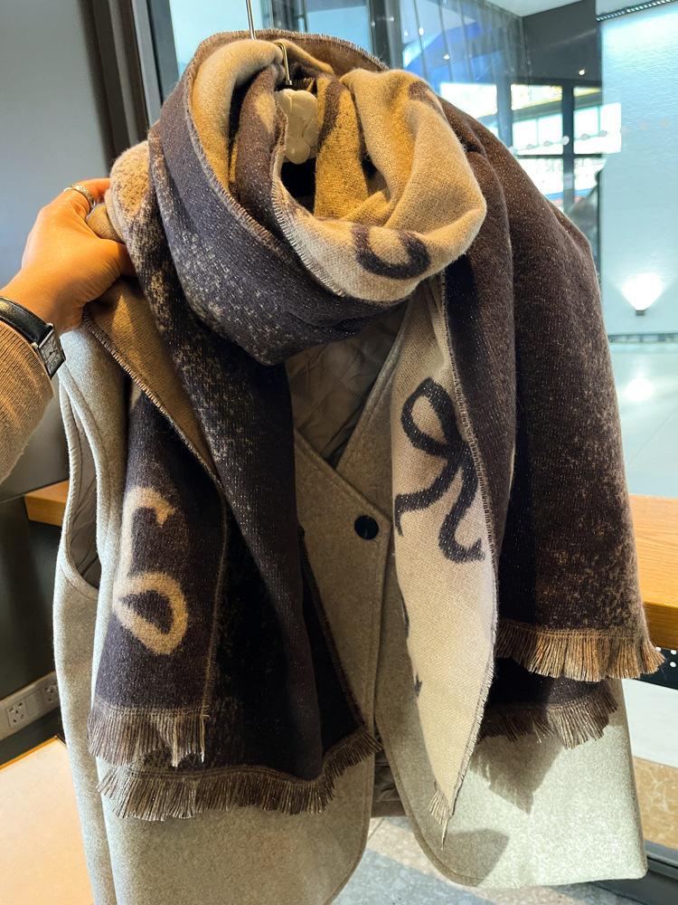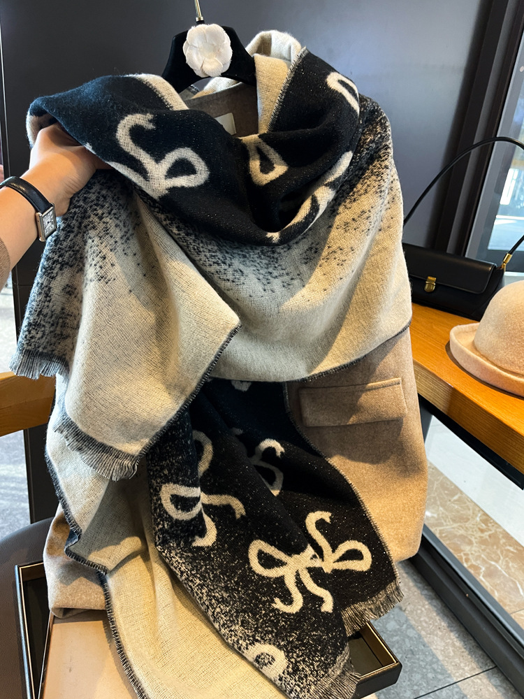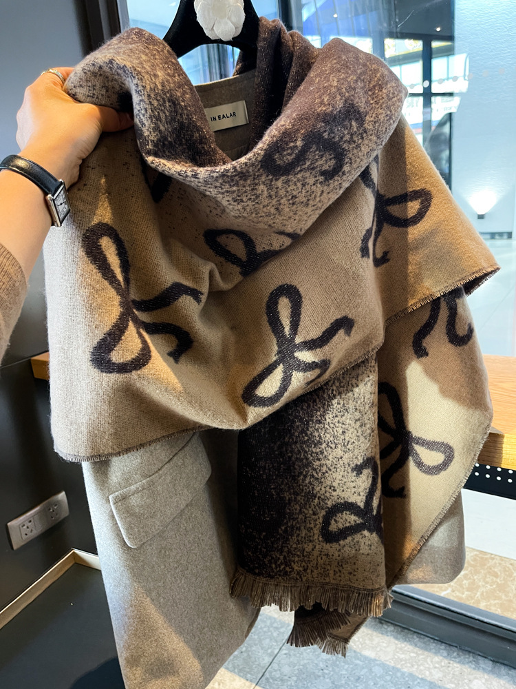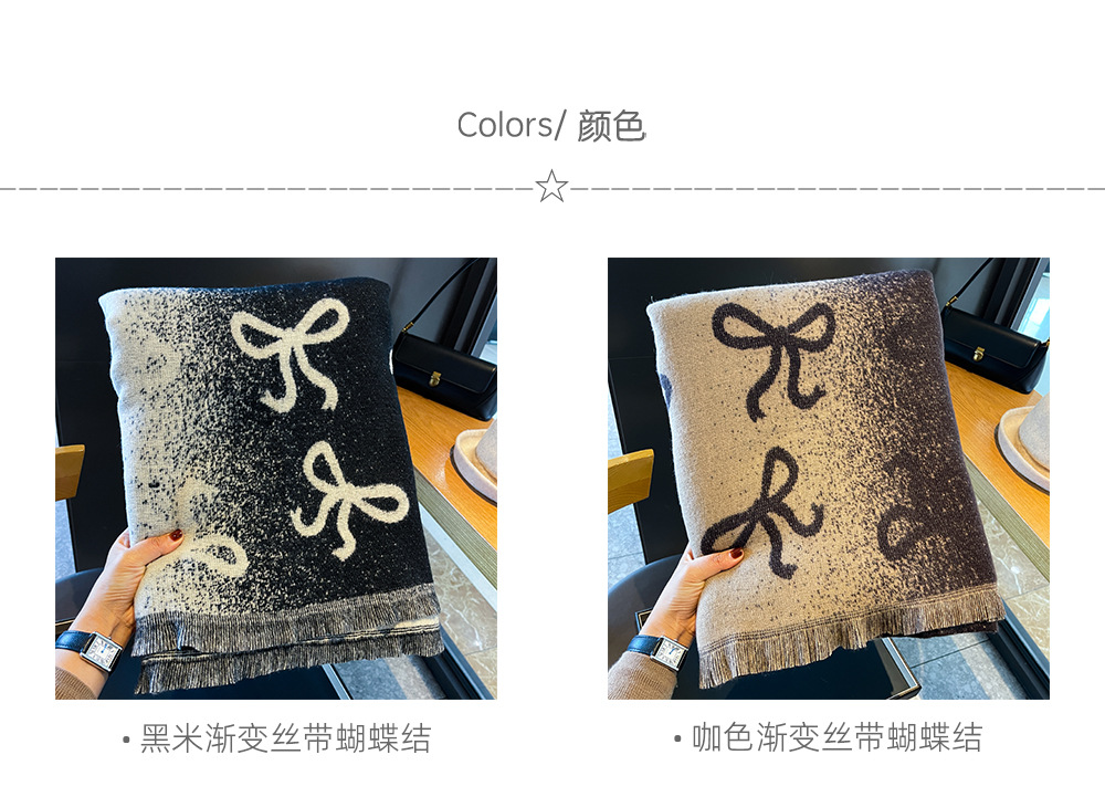 韩国蝴蝶结高级感双面渐变仿羊绒围巾女冬季加厚保暖围脖披肩两用
