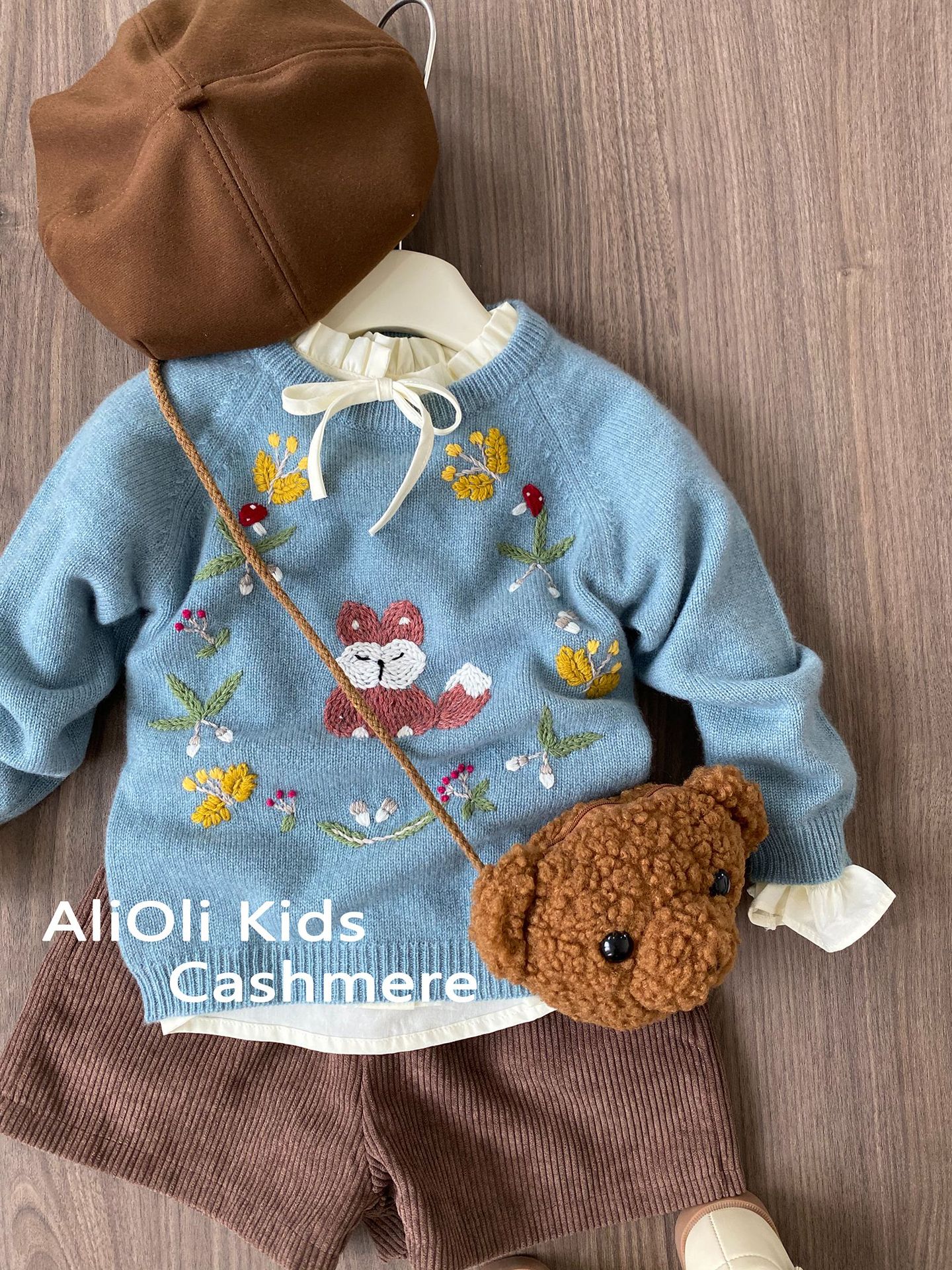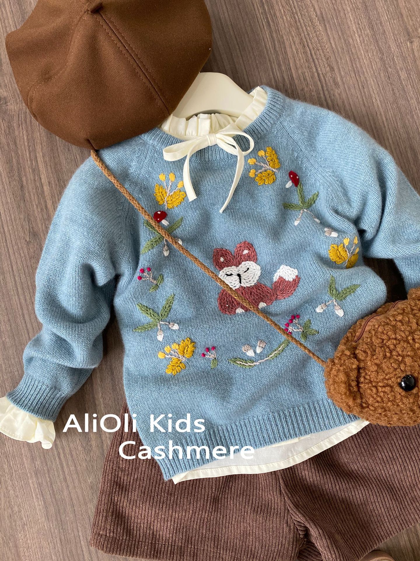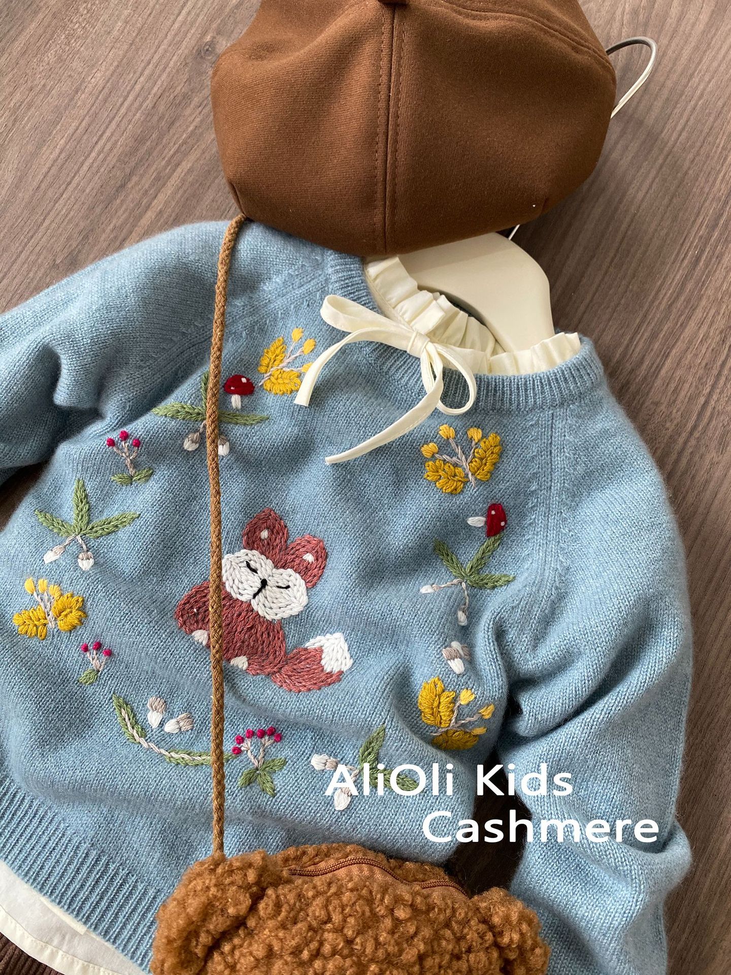 내몽골 Pengbo 캐시미어 어린이 캐시미어 크루 넥 카디건 두꺼운 수제 자수 딸기 우아한 스웨터